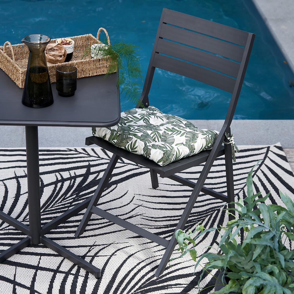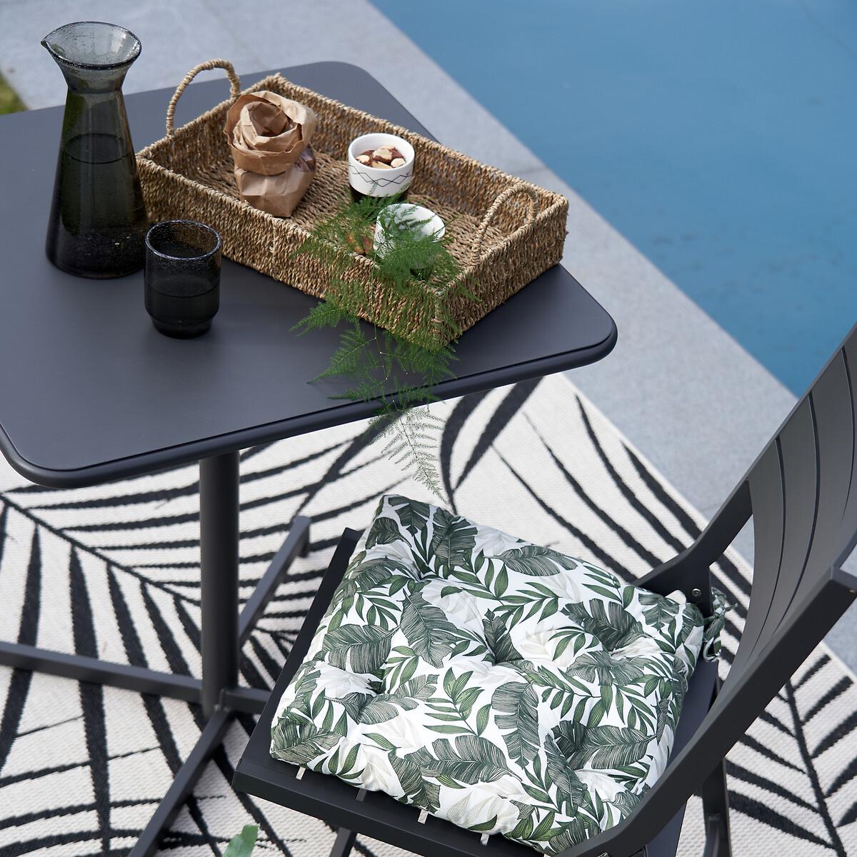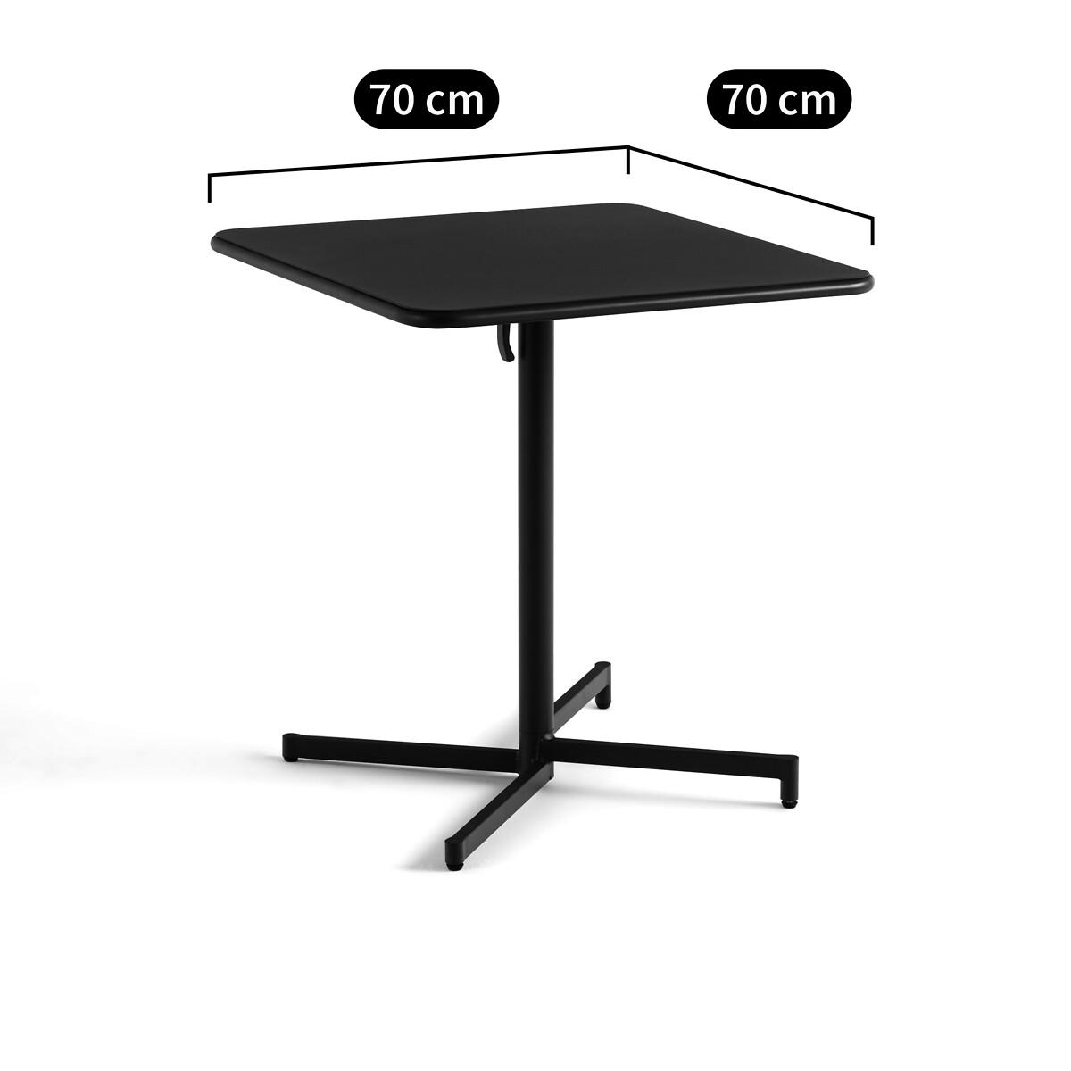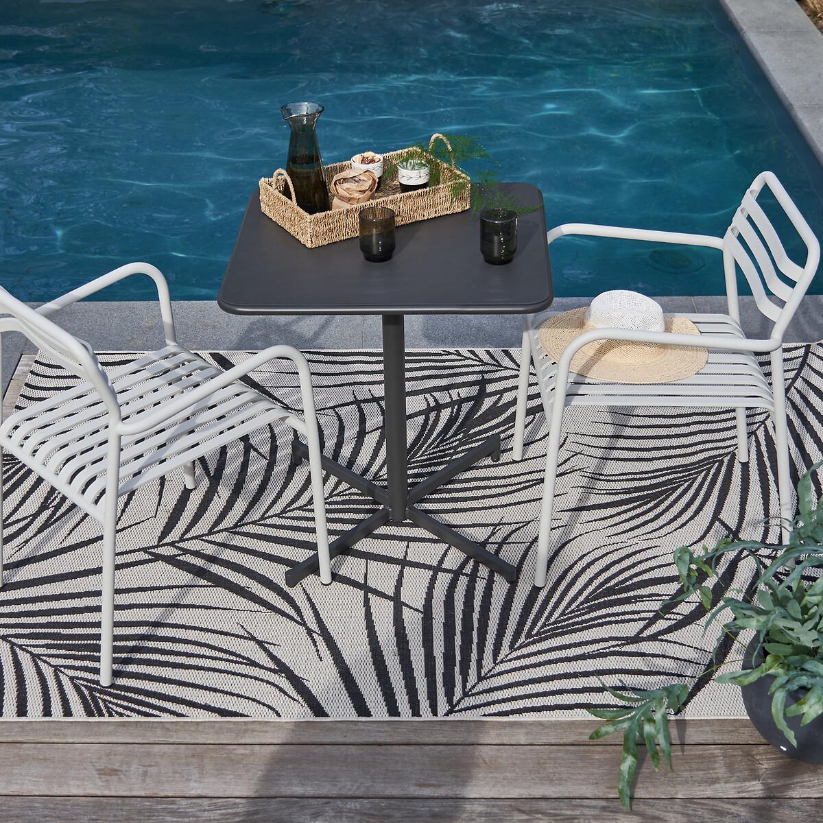 The Manni garden table brings an updated take on the style of classic Parisian bistro tables. Elegant with its matte finish, light because it is made of aluminium and prcatical with its folding top for easy storage... It is ideal for large and small spaces, especially on a balcony. Product Details • In anthracite grey-tinted aluminium with epoxy finish • Folding tray using a handle • 4 plastic pads adjustable in height • Aluminium has the advantage of not rusting and is also very resistant to abrasion. Easy to clean, it can be washed with soapy water. This material is ideal for outdoor furniture. • Assembly required. Dimensions • Overall height: L70 x D70 x H74cm • Table top thickness: 2.5cm • Central base diameter: 5cm • Width of each foot: 35cm • Total width of base support feet: 74cm • Weight: 9kg Parcel dimensions and weight • 1 parcel • L78.5 x D75 x H14cm. 11kg.