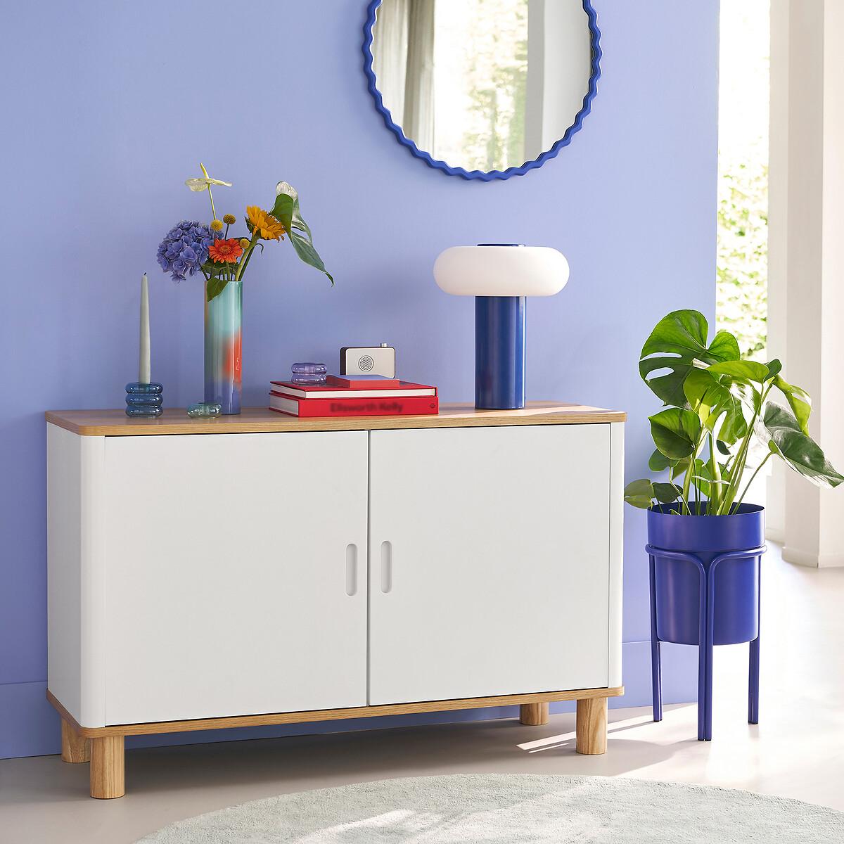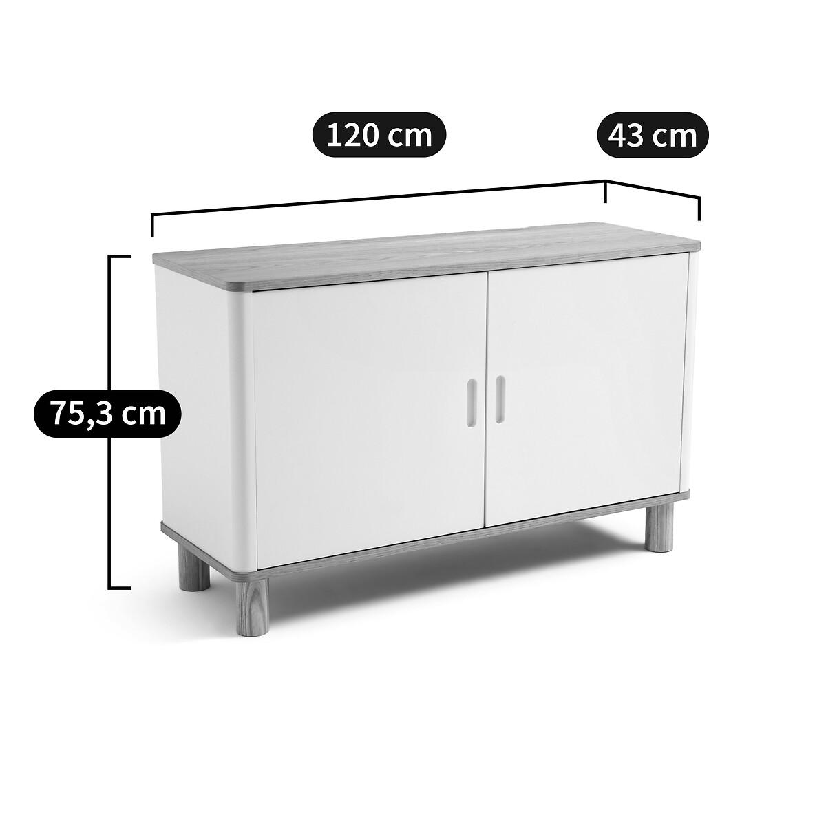 The Manoe sideboard with 2 doors. Placed on solid cylindrical legs, this storage unit displays a contemporary style. It will easily find its place in a refined interior decor or associated with bold colours. A signature design by La Redoute Interiors. Product Details • Top and bottom top in oak veneered MDF with nitrocellulose varnish finish • Structure and doors in MDF, off-white water-based paint • FSC® certified wood • 2 doors with notch handle • Cylindrical legs in solid ash, nitrocellulose varnish finish. Dimensions • Width: 120cm • Height: 75.3cm • Depth: 43cm. Compartment Dimensions • Width: 54.5cm • Height: 27.5cm upper compartments / 29.4cm lower compartments • Depth: 43cmDelivery:. This product required assembly. Available for home delivery. • WOOD FROM SUSTAINABLY MANAGED FORESTS. FSC® certified wood comes from forests that are environmentally, socially and economically well managed. Dimensions and weight of parcel2 parcels • L74 x H18 x D63cm, 25kg • L133 x H12 x D52cm, 22kg