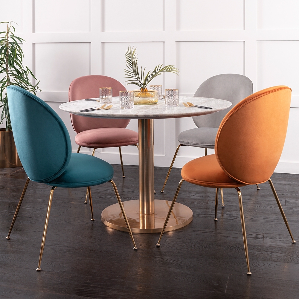 A comfortable, stylish and affordable dining chair. Deep padded seat and wraparound backrest. Sleek, brass finished frame with height adjustable feet. Velvet upholstery fabric. Minimal assembly required, simply attach the base.