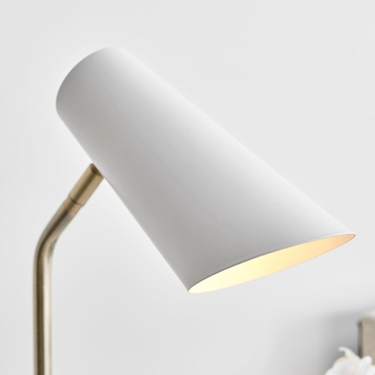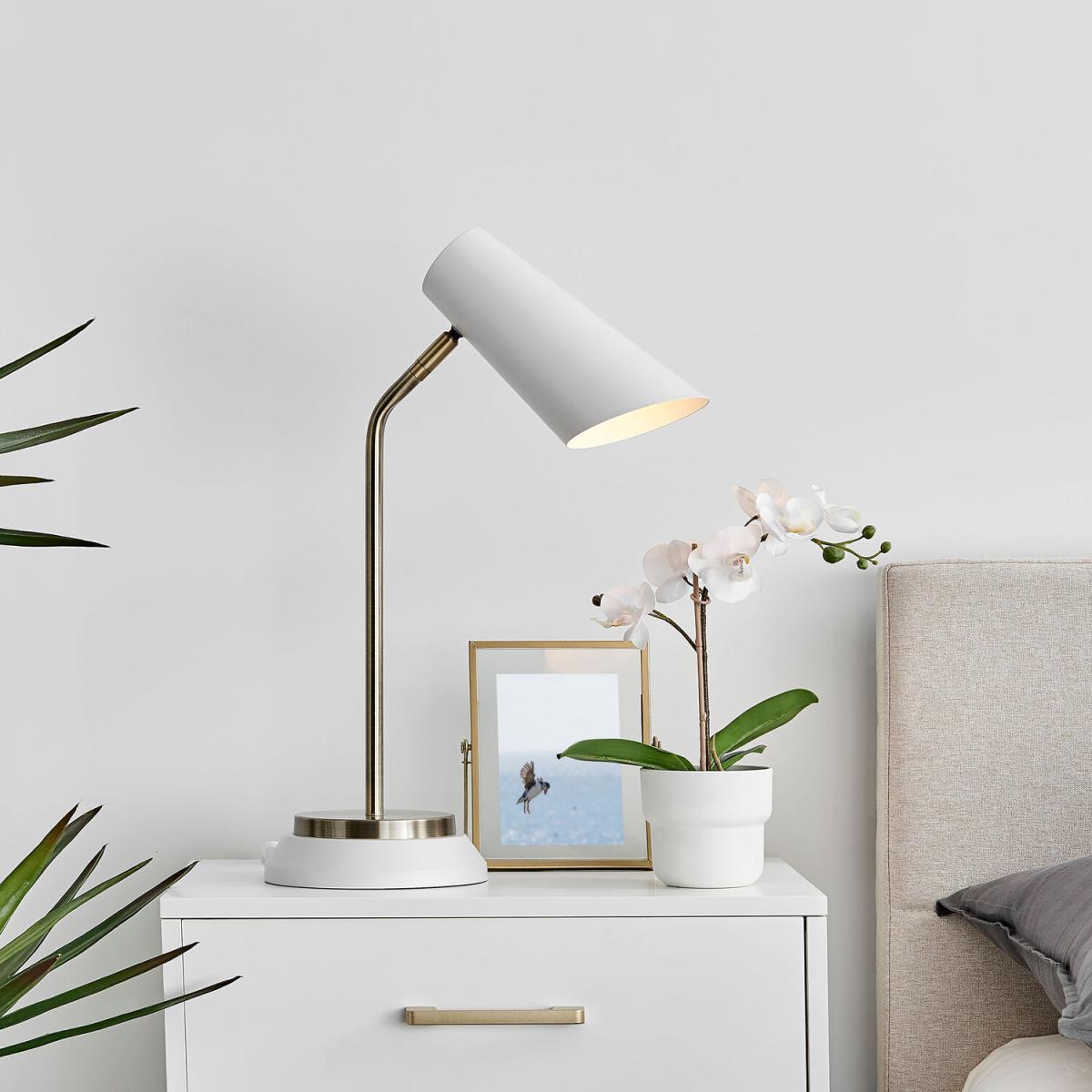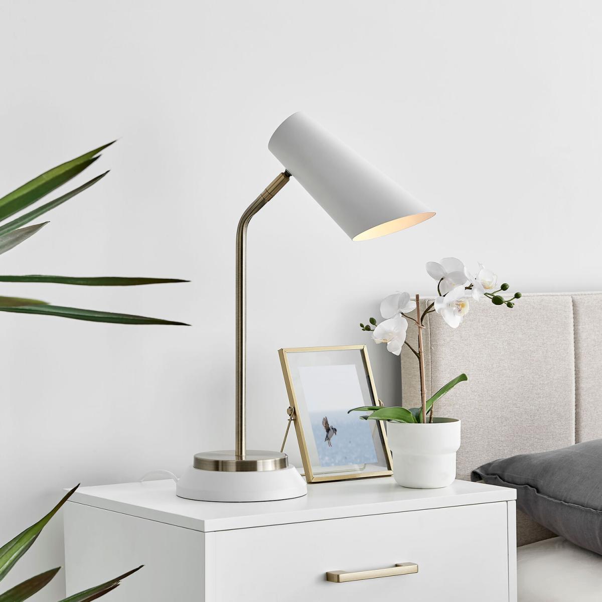 Our Manu table lamp is sleek and modern and will look great on any table, desk or console. The black and gold colour combination is both glam and minimalist, with an Industrial vibe. It will look equally great against wooden surfaces, complimenting a darker colour palette, or contrasting with lighter surfaces. A metal lampshade with gold stand and neck with a gentle bend to it. The striking asymmetrical lampshade gives this lamp a floral snowdrop look! Stands 53cm tall, with an adjustable head that you can tilt upwards or downwards and left to right to angle your light. Also featuring a black corded cable and rocker switch. Requires one 40W E27 bulb, which is included. We also offer the Manu desk lamp in white and gold colour combinations, so be sure to check out the Manu range!