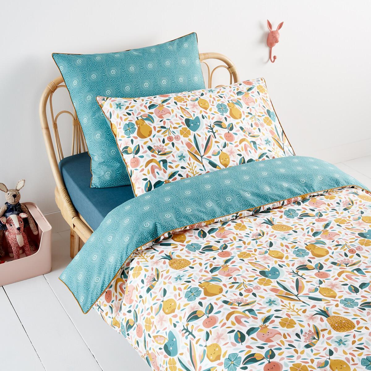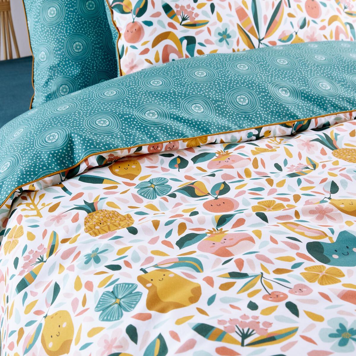 The Maoli duvet cover. The colourful flowers and fruits on this bedding herald the joys of summer! This duvet cover is made of cotton percale (80 threads / cm2) from organic farming, soft and pleasant on your child's skin. Product Details. Pure cotton from organic farming. 1 side with fruit & floral print, 1 side small motifs. Button fastening. Duvet cover washable at 40°Additional Information. Organic cotton: grown without the use of pesticides or chemical products. Organic farming protects the environment and the health of those who harvest it. Our organic cotton bed linen is very soft and gentle against your skin. This product labelled STANDARD 100 by OEKO-TEX® - certificate no. CQ 1102/4 IFTH follows a certified and controlled manufacturing process which is respectful of your skin. The STANDARD 100 by OEKO-TEX® is the first label that meets the needs of consumers in terms of human ecology. It guarantees the absence of harmful substances or those potentially presenting a risk to health. Size. 140 x 200cm: Single. 200 x 200cm: Double.