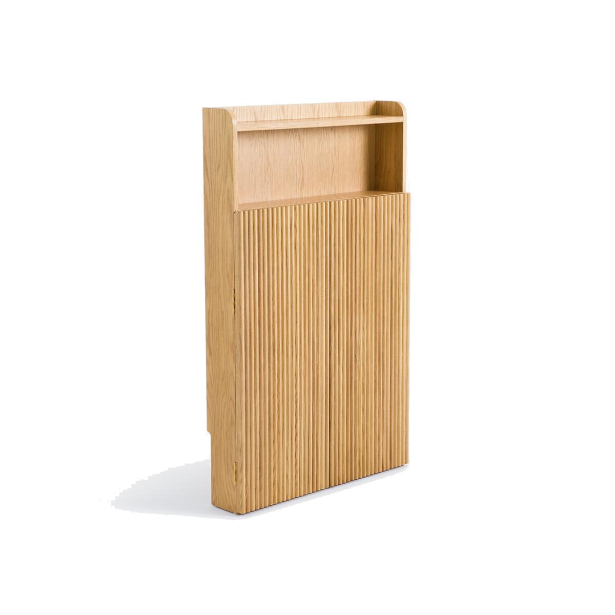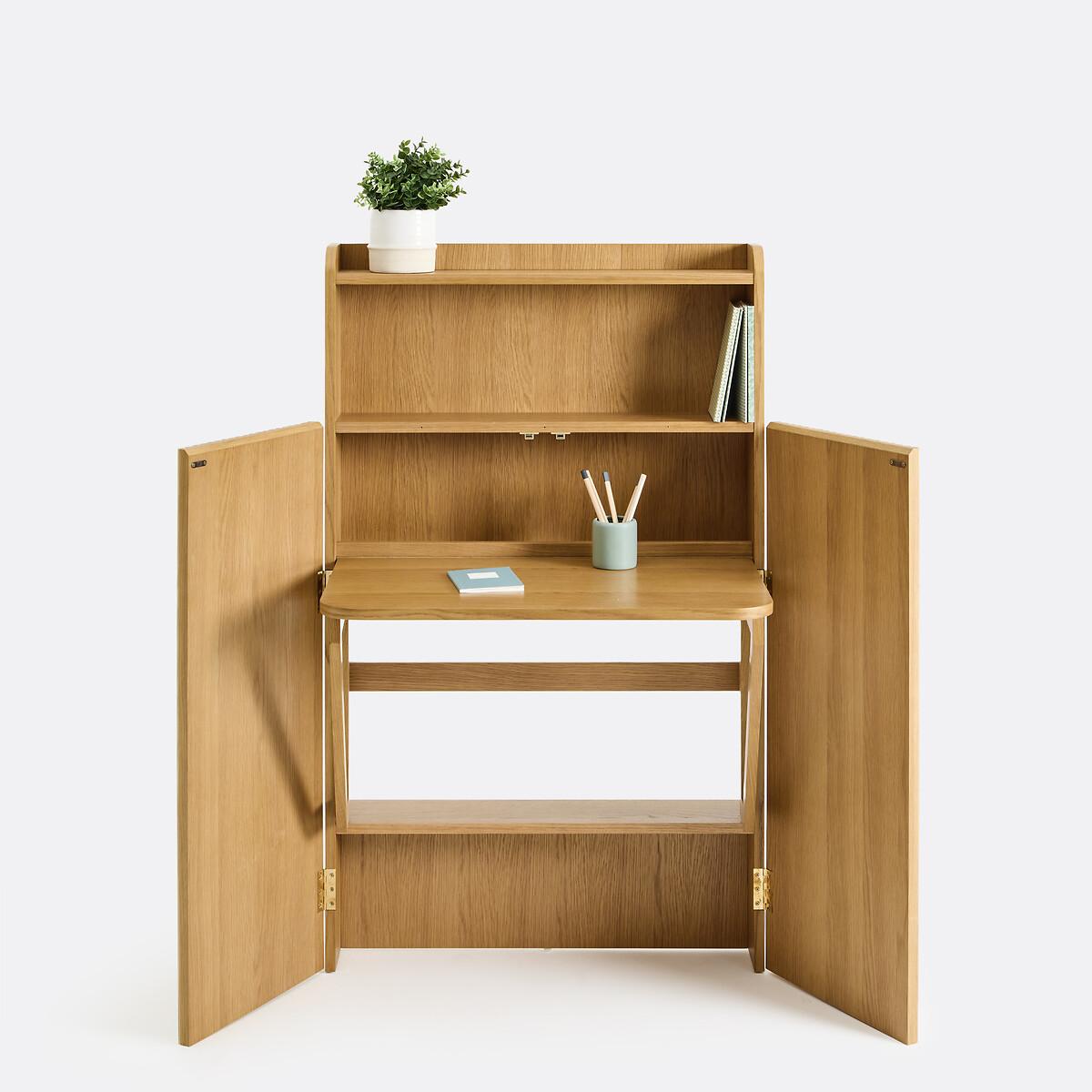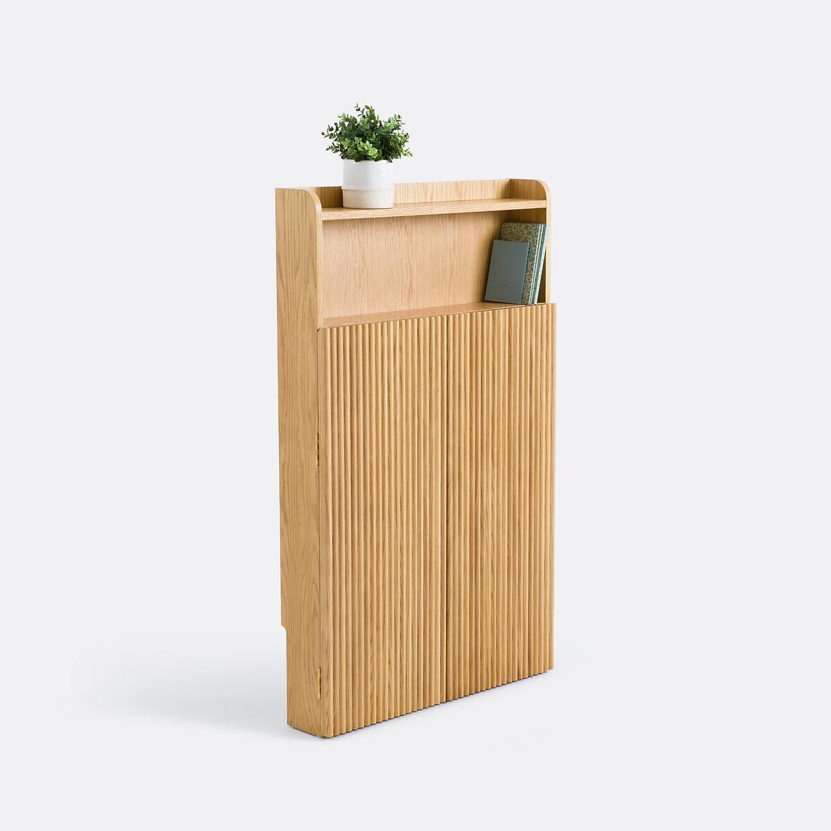 The Maoro dual purpose shelf unit desk is part of our Les Ingénieux collection. Creations full of ideas to make life simpler and everyday life more beautiful, imagined by our designers in France..Compact thanks to its fold-down top, the Maoro shelf unit desk optimises space and creates a functional office corner where there is none. Created by La Redoute Intérieurs. Why you'll love it • A fold-down top to create a real workspace without losing m2 • When closed, it's an elegant, shallow shelving unit that fits in anywhere, even in a hallway • Finishes that leave nothing visible: with cable grommets for all your connections. • In FSC®-certified wood from sustainably managed forests : yes to reasoned production. Product Details • Oak veneered MDF structure, nitrocellulose varnish finish • 2 doors covered with solid ash half-round slats, finished in nitrocellulose varnish • Folding top behind doors • 2 shelves • Cable access hole • Wall fixing (screws and plugs not supplied)Dimensions. Overall • Width: 80cm • Height: 132.5cm • Depth: 18cm • Weight: 39kg. Usable space • Folding desktop:W75.7 x H75 x D43cm • Centre shelf : W76.2 x H25 x D13.2cm • This product requires assembly. • WOOD FROM SUSTAINABLY MANAGED FORESTS. FSC® certified wood comes from forests that are environmentally, socially and economically well managed. Parcel Dimensions1 parcel • W146.5 x H21 x D63cm. 43.5kg