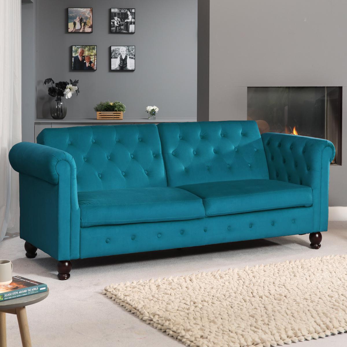 The Maplewood click-clack is a stylish yet practical addition to both modern and traditional interiors. I love how its rich teal hue brings a fresh pop of colour to a neutral room, making it a focal point without overwhelming the space. Its classic Chesterfield-inspired design with buttoned detailing lends a timeless charm, while the click-clack mechanism provides effortless conversion from sofa to bed, making it ideal for versatile living spaces or guest rooms. To style around it, keep accessories minimal and pair with textured cushions or throws to soften the bold colour. It works particularly well in eclectic, contemporary, or vintage-inspired interiors where statement furniture pieces make a real impact.