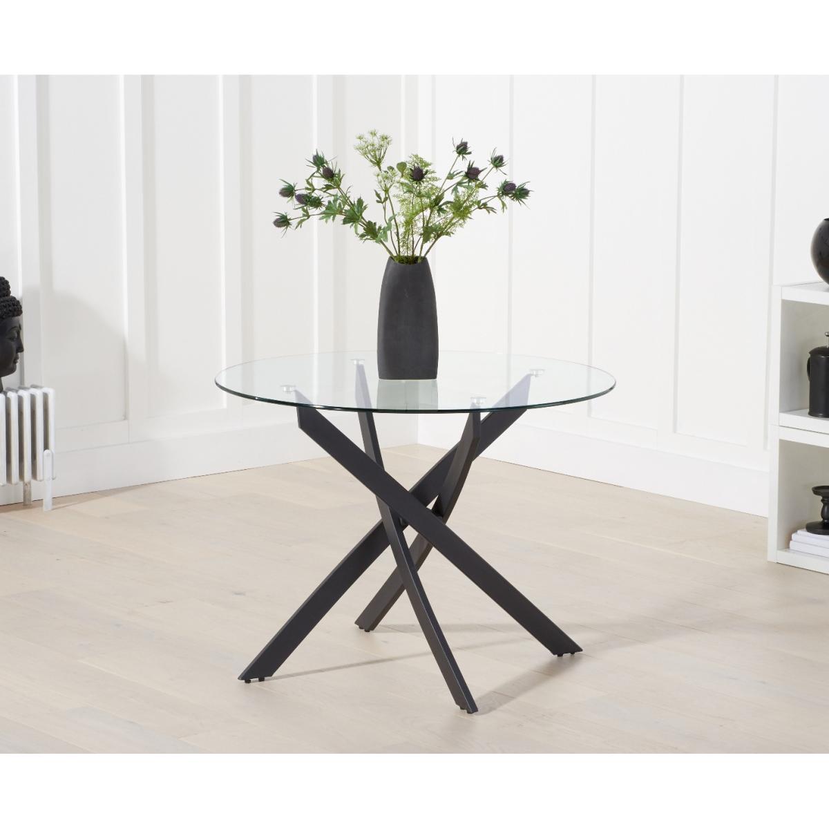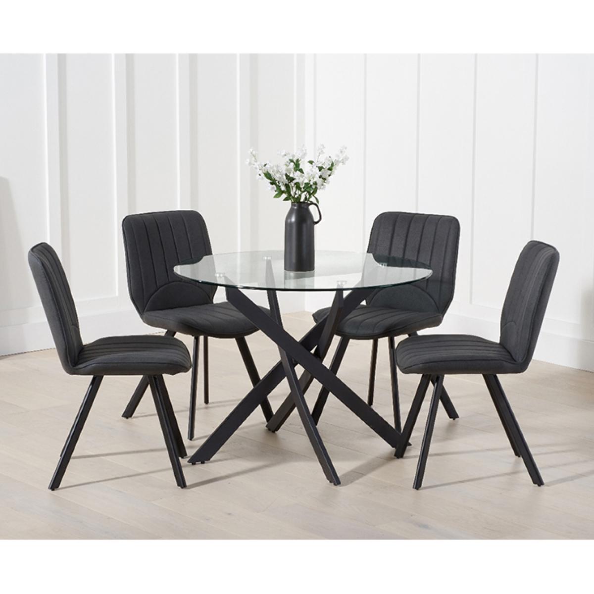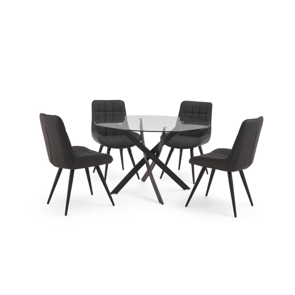 The Mara 100cm Round Glass Dining Table features a sleek contemporary design that makes an impression in any interior. Seating up to 4 people, the glass dining table is chic and space saving. The round dining table features a smooth clear tempered glass table top that is conveniently wiped clean. Supporting the table top, crossed metal legs finish the contemporary look of the Mara. Dexter Faux Leather Chairs complement the round glass dining table. Featuring slanted legs, the faux leather chairs are available in a choice of grey or brown.
