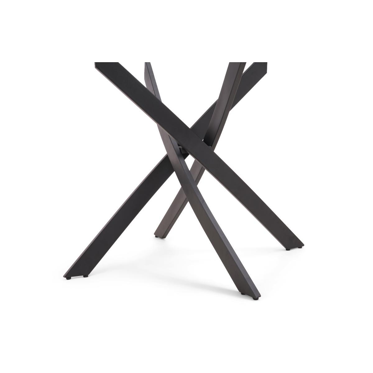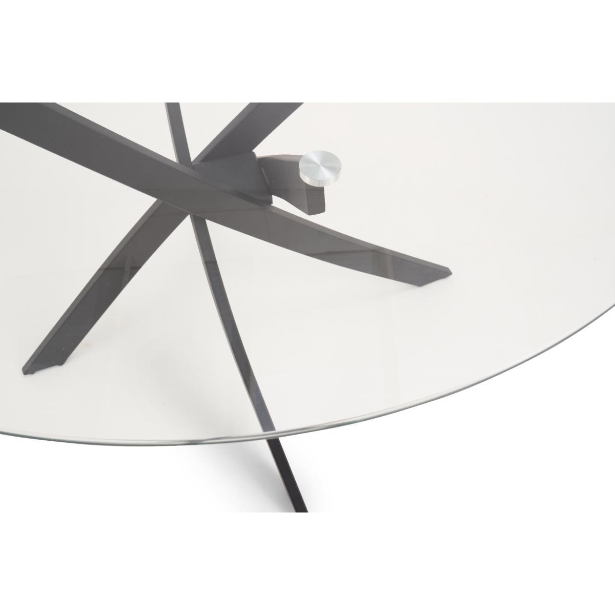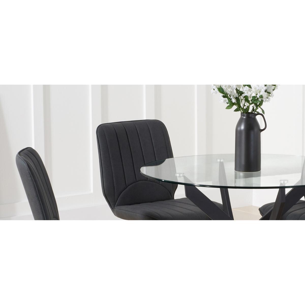 The Mara 100cm Round Glass Dining Table features a sleek contemporary design that makes an impression in any interior. Seating up to 4 people, the glass dining table is chic and space saving. The round dining table features a smooth clear tempered glass table top that is conveniently wiped clean. Supporting the table top, crossed metal legs finish the contemporary look of the Mara. Dexter Faux Leather Chairs complement the round glass dining table. Featuring slanted legs, the faux leather chairs are available in a choice of grey or brown.