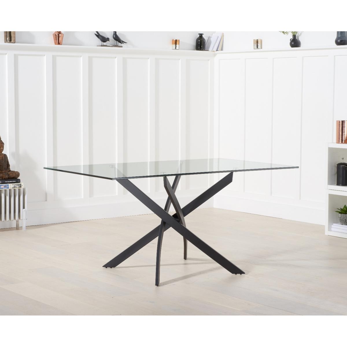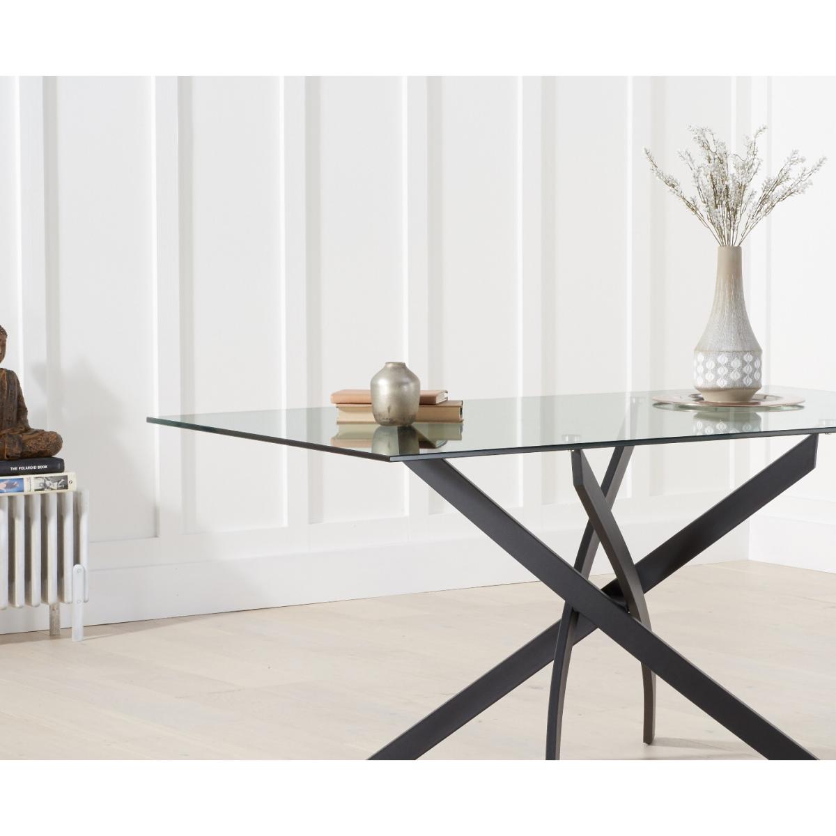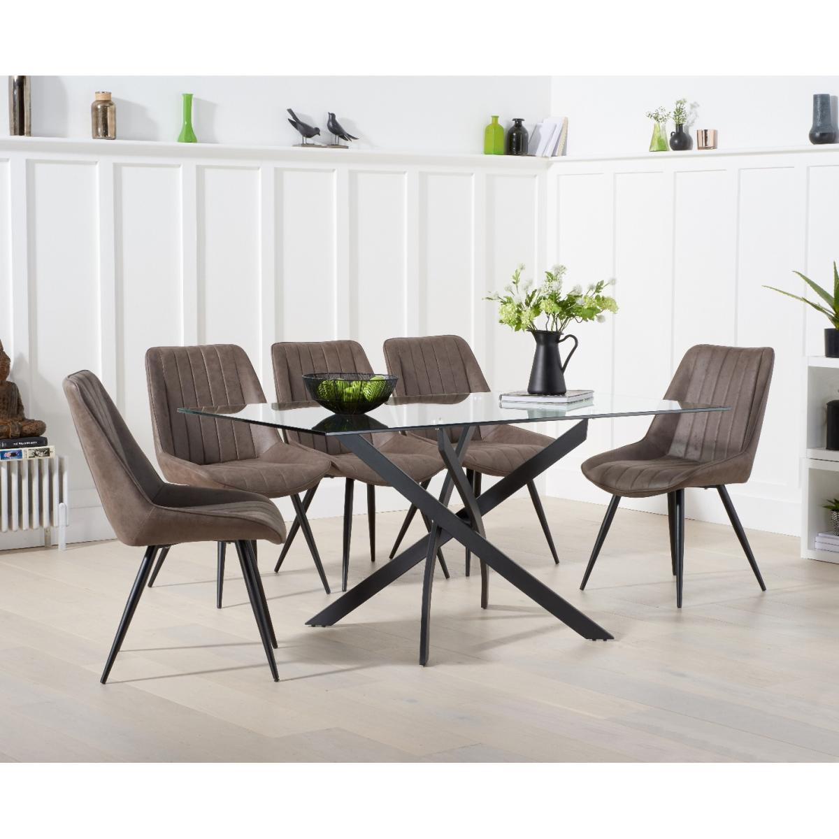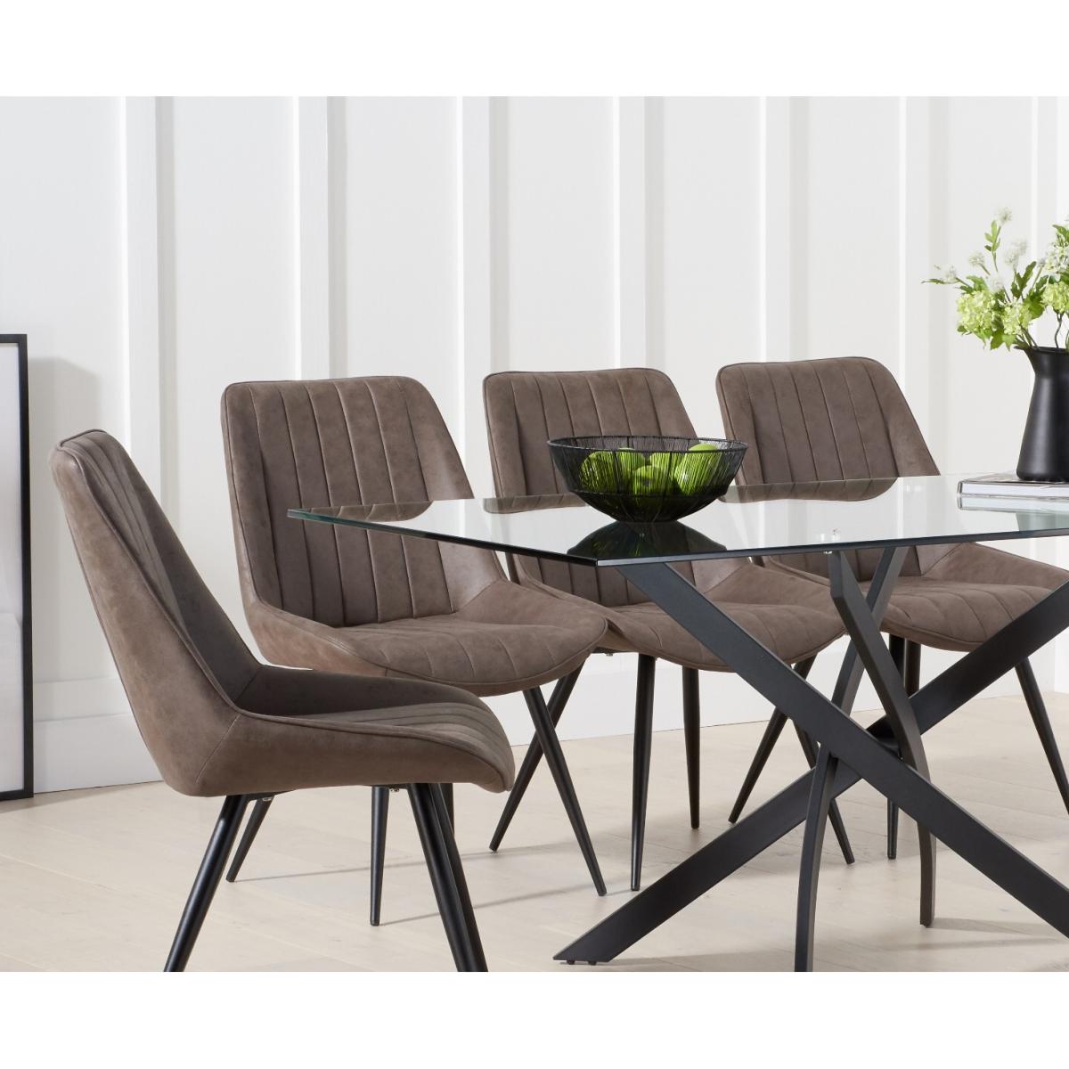 Sleek and modern, the Mara 160cm Glass Dining Table makes a stunning impression in any home. Seating up to 6 people, the glass dining table is the perfect setting for every occasion. Crafted with care, the Mara table features a smooth clear tempered glass table top that is conveniently wiped clean. The modern look of the table is enhanced by sleek crossed metal legs. Marcel Antique Chairs complement the Mara 160cm Glass Dining Table. Upholstered in fabric in a choice of mink or brown, the chairs are complete with black tapered legs.