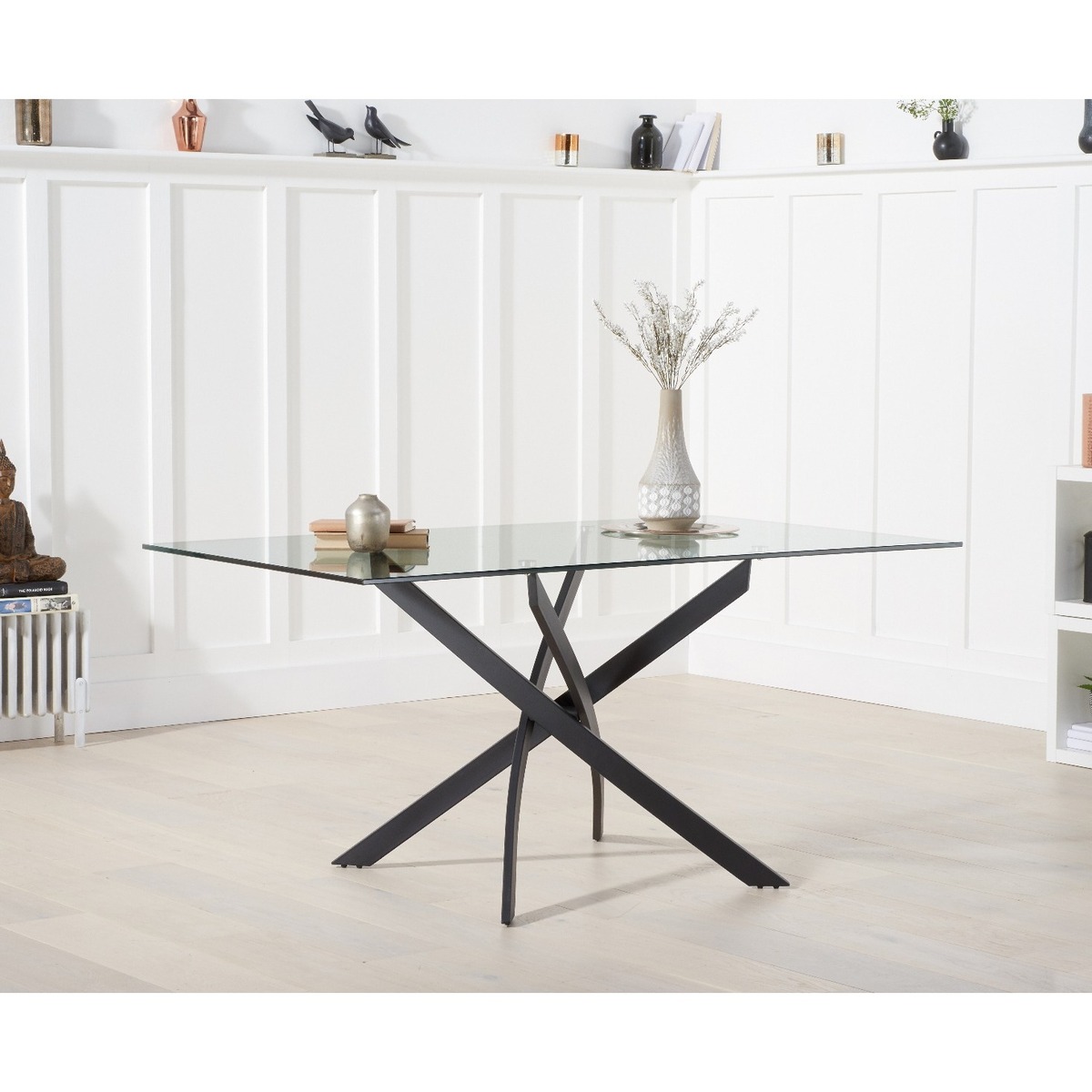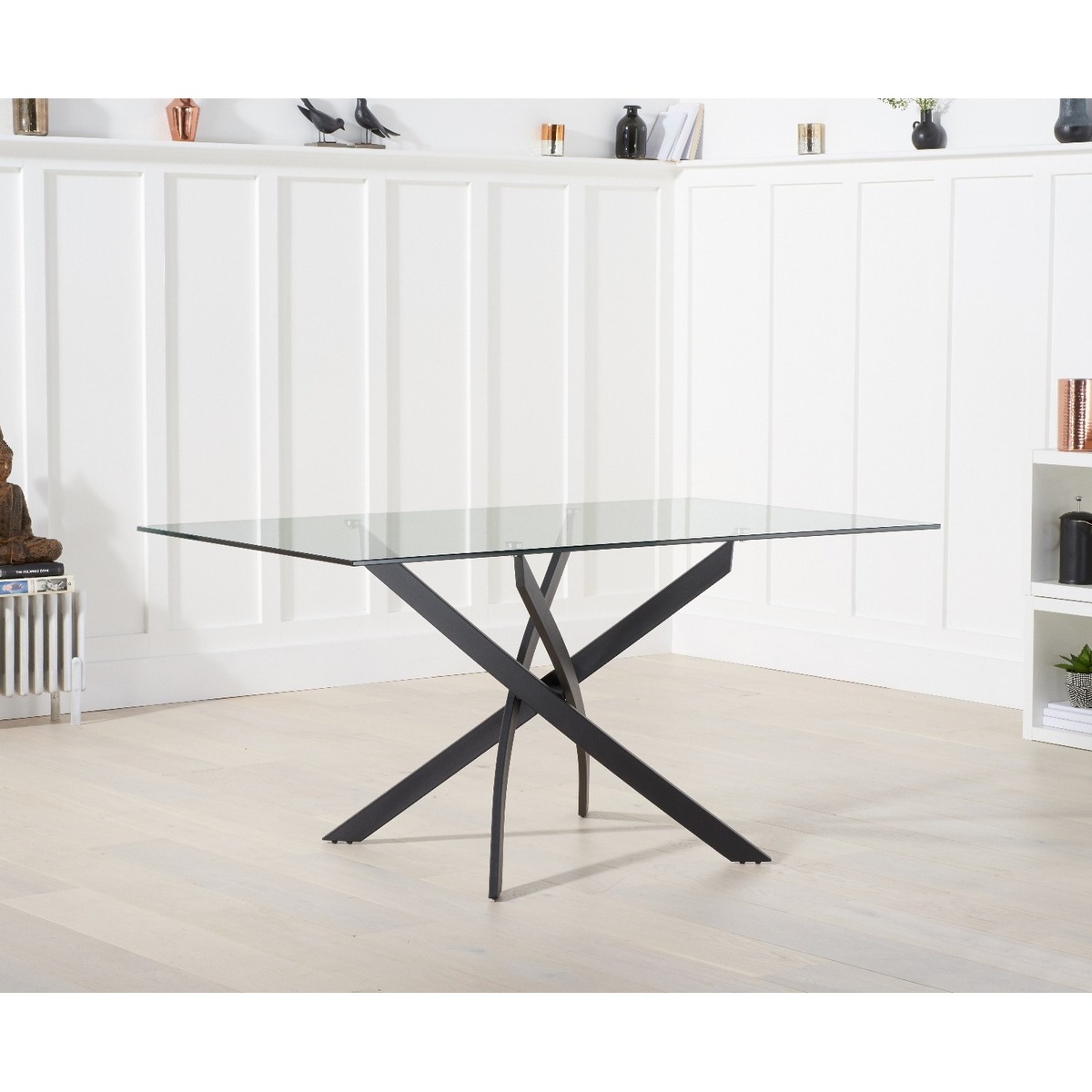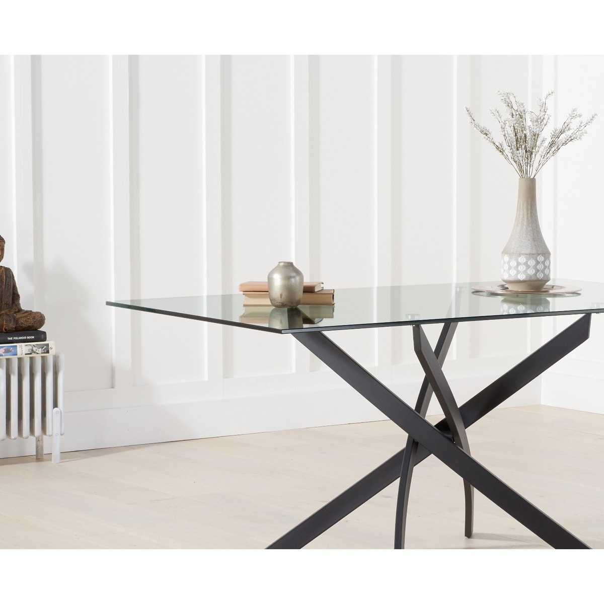 Sleek and modern, the Mara 160cm Glass Dining Table brings style to your dining room. Comfortably seating up to 4 people, the space saving glass table is elegant and resilient. Crafted with careful attention to detail, the round dining table features a smooth clear tempered glass table top that is conveniently wiped clean. The glass dining table is supported by metal legs that cross elegantly for a chic contemporary look.