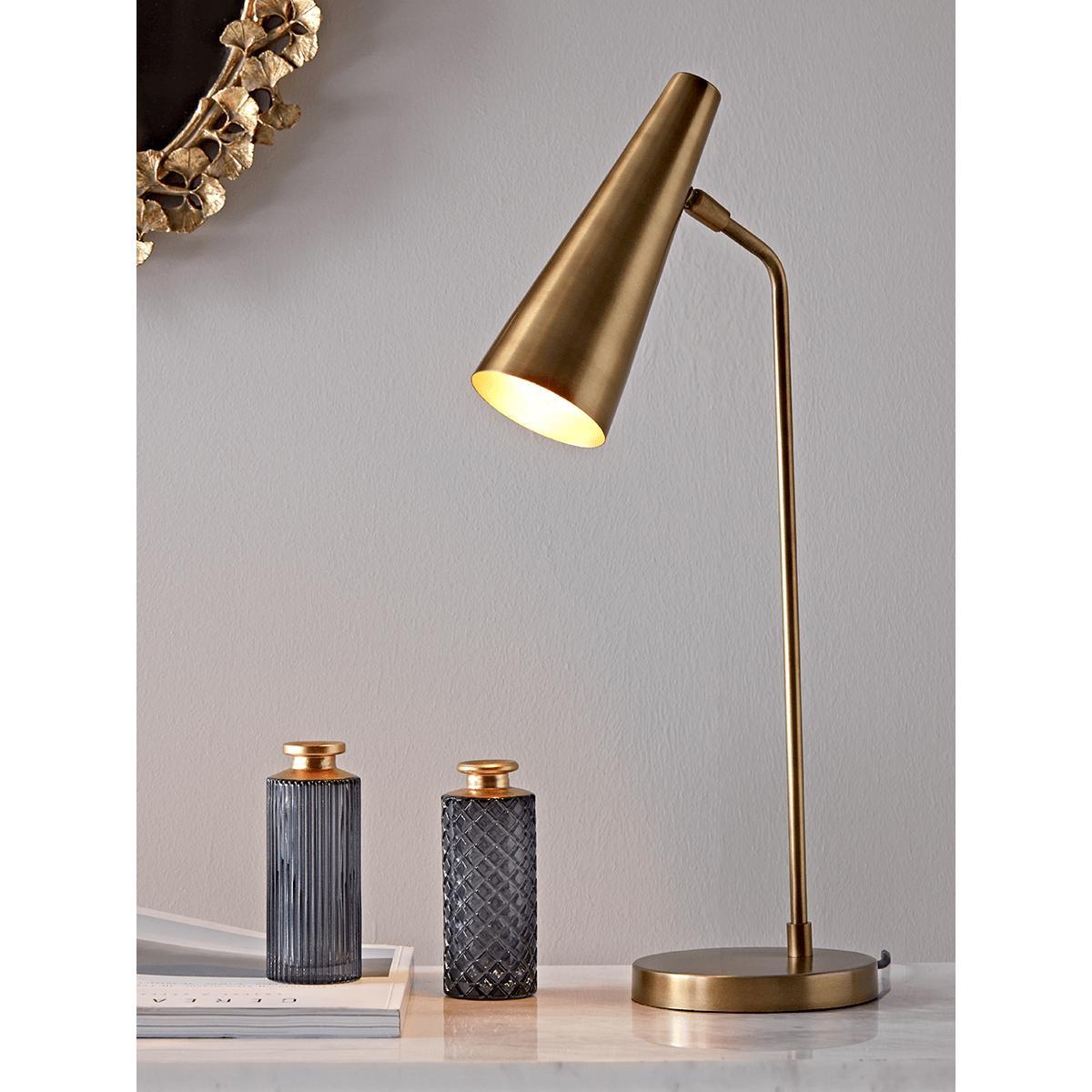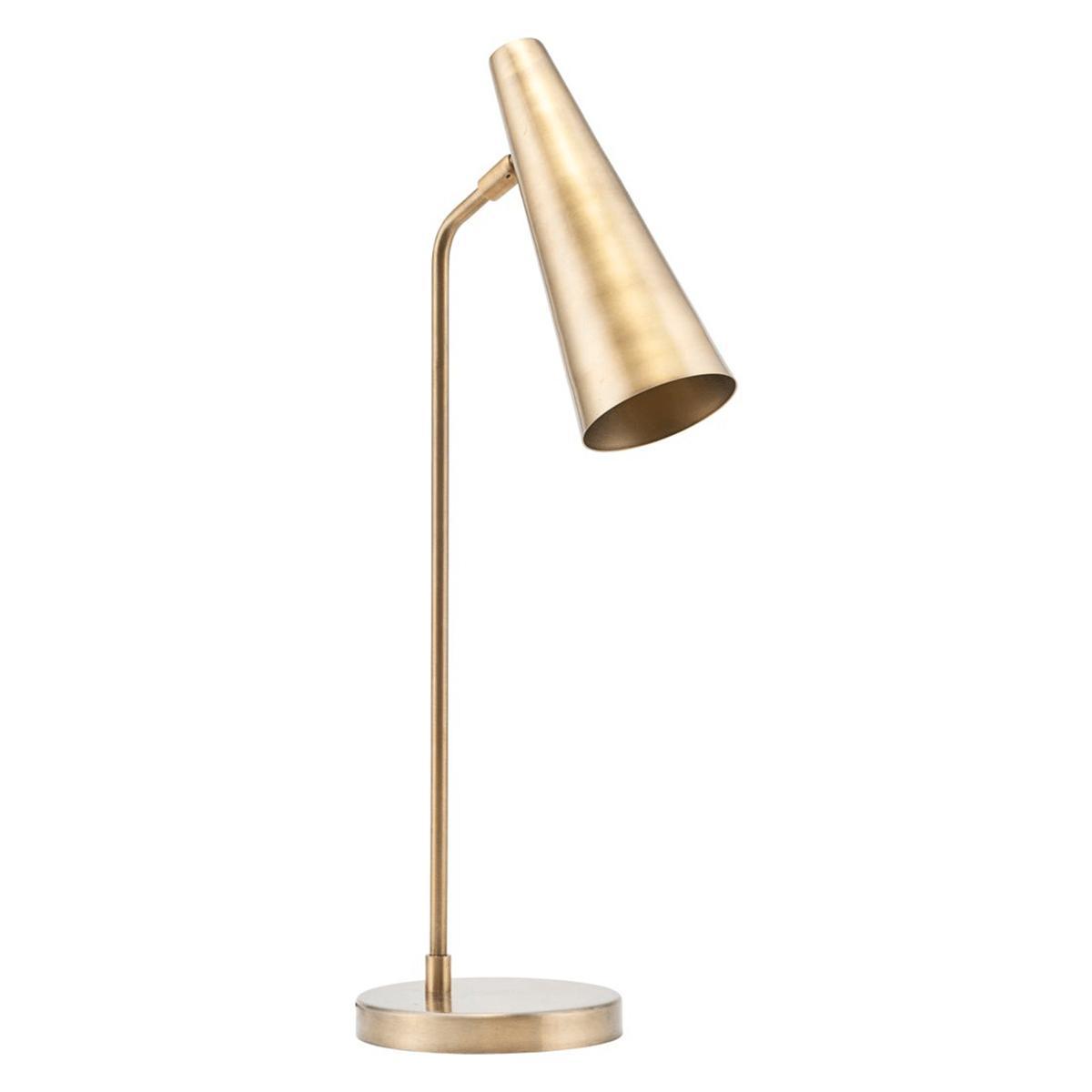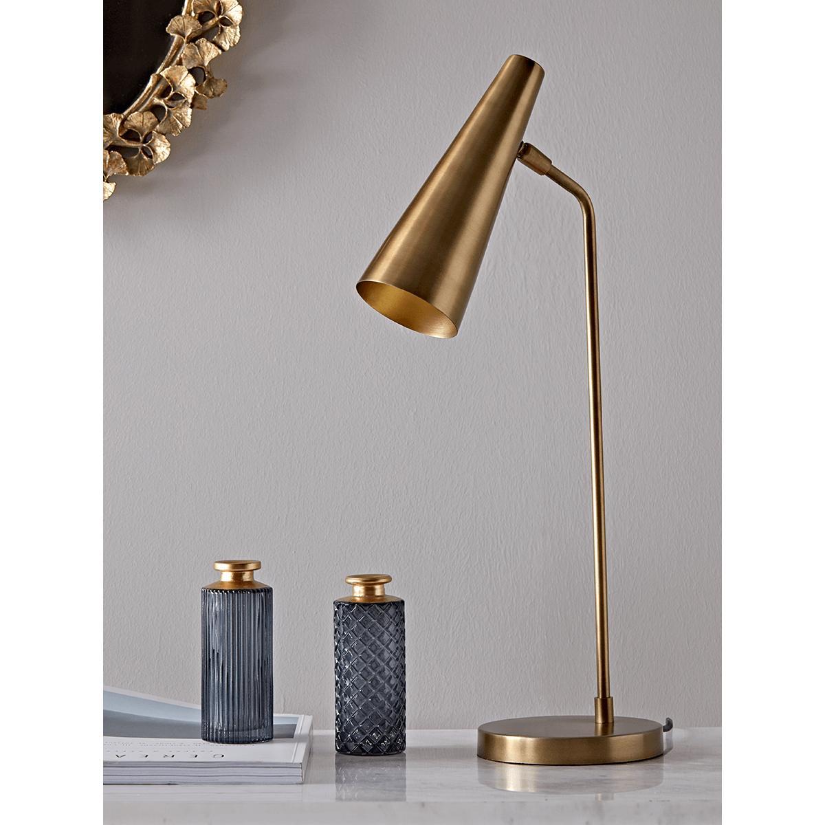 Contemporary and elegant with a striking brass finish, our sleek table lamp has a slender, conical shade with a brass inner to reflect the light and a weighty, round base. Use as a desk lamp in your home office, or place on any console or sideboard to bring a warming glow to your living space.