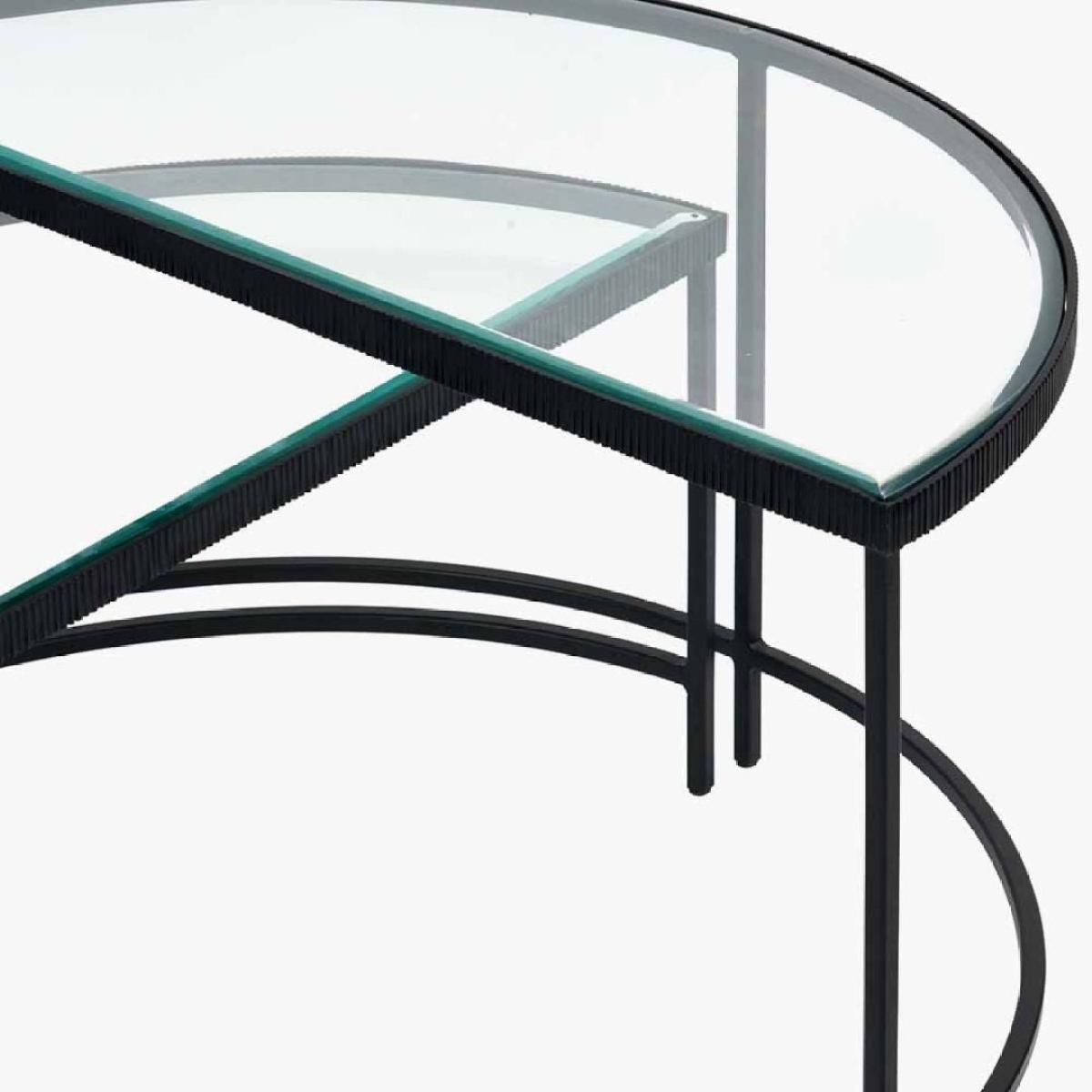 Marazzi duo half moon coffee tables, two tables of differing heights featuring a bevelled glass top and black metal frame.   Marazzi duo half moon coffee tables, two tables of differing heights featuring a bevelled glass top and black metal frame.