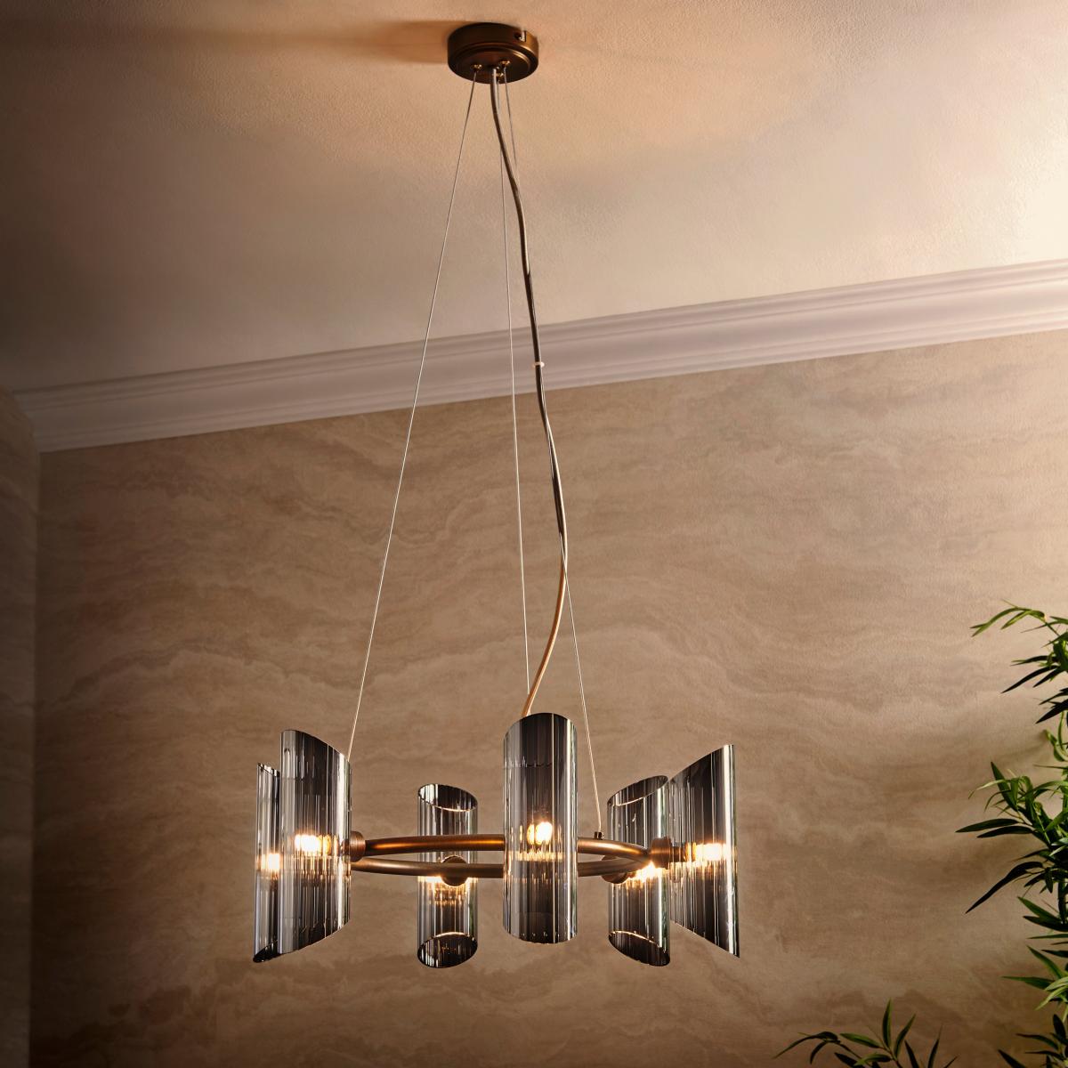 * Art Deco & Industrial Style and Look* Made from Sturdy Metal & Glass* Statement Ringed Design* Adjustable Height - Tailored Ambience* Dimmable Compatible - Needs Dimmable Bulb & Switch* Requires: G9 Cap Type & Capsule Bulbs With its smokey lustre glass shades in an antique-brass finish, this ceiling light boasts a statement ringed design and adjustable height capabilities - perfect for creating tailored ambience.