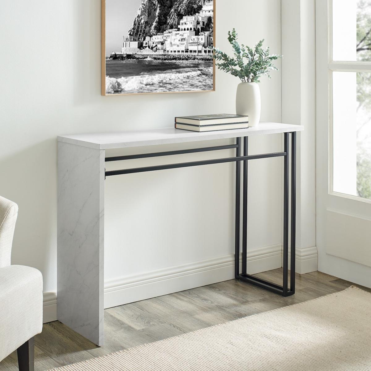 Dimensions Table W107 x H77 x D36 cm. The contemporary silhouette of this console helps to create a stunning modern aesthetic in your home. Its two-tone frame and sleek faux marble table top is the perfect surface store your keys hats photos or decorative items and enhance your home. Features. Dual metal leg design for a modern feel. Waterfall-style silhouette lends a contemporary aesthetic Perfect for use in an entrance way hallway or living room. The spacious faux marble top shelf is ideal for providing some much-needed surface space for keys hats scarves and other miscellaneous items. Greet your guests with a preview of your home's style and add a lovely lived-in quality to your home Assembly required..