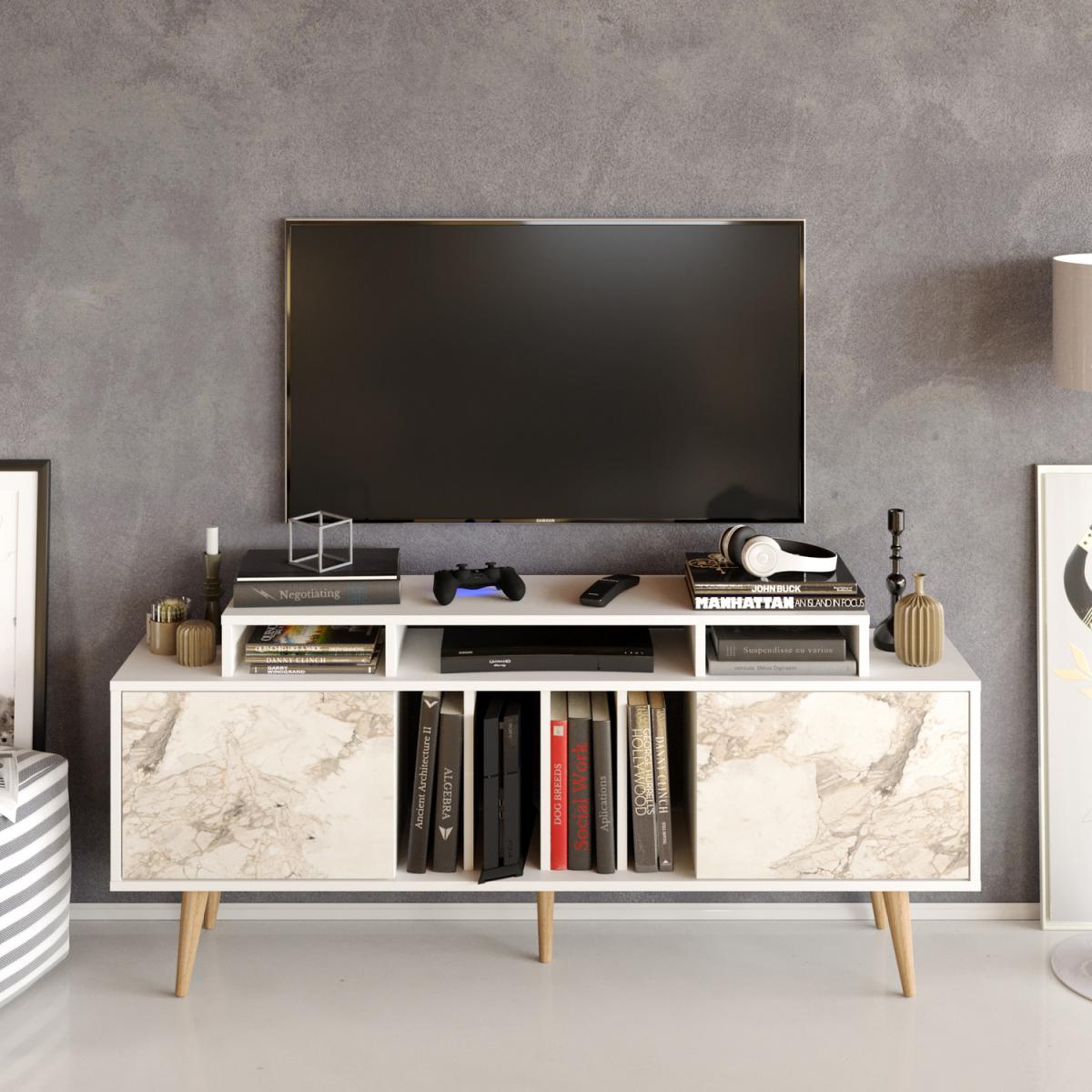 Char 160cm wide TV stand and media console is designed for larger living rooms and can accommodate TVs up to 72". The media stand provides a lot of space for storage with 2 cabinets and 4 open shelves atop standalone shelf. Note that atop standalone shelf is not fixed to the TV cabinet and can be adjusted in numerous ways to meet your needs. It is freestanding which may be a concern for those with children as it easily pulls off the unit. Also check the dimensions (width & depth) of your TV legs and atop standalone shelf comparatively and make sure that the TV legs perfectly sit on it.
