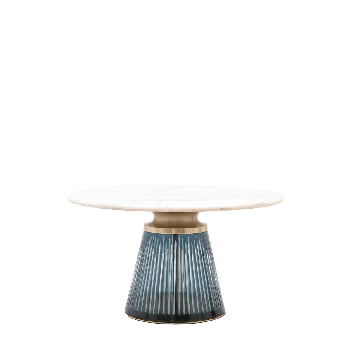 This coffee table is a stunning fusion of premium materials and refined design, making it the perfect centerpiece for any stylish living room. – The beautifully polished marble surface provides a sophisticated setting for décor, drinks, and everyday essentials. The textured glass base introduces an artistic flair, adding depth and dimension to the table’s design. A striking brass trim completes the look, enhancing the opulent aesthetic while offering a contemporary touch. Whether styled in a modern, Art Deco, or classic space, this table blends seamlessly with a variety of interior styles. Elevate your living space with this luxurious marble and glass coffee table, designed to be both functional and visually captivating. The marble top, fluted glass base, and brass accents combine to create an exquisite statement piece that exudes timeless elegance. Dimensions: H42 x W76.5 x D76.5 cm Product weight: 34.15 kg Colour: Blue Material: Aluminum, Glass, Marble Finish:Marble Assembly required: Yes, just attach the top