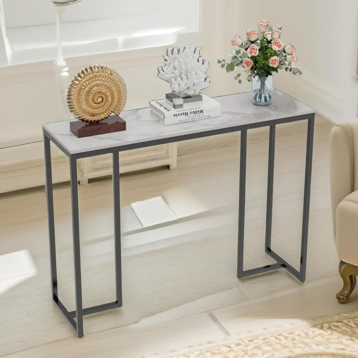Embrace the essence of Nordic design with our console table featuring a metal frame and high-temperature paint coating. Its smooth finish ensures all corners are rounded without any burrs, enhancing safety and aesthetics. Crafted from heavy-duty sintered stone, this table is wear-resistant, rust-proof, and exceptionally solid. The material undergoes high-temperature and high-pressure processing, resulting in outstanding durability and ease of cleaning. Ideal for displaying and storing decorations, photos, flowers, and more, this console table is a perfect addition to homes, hotels, restaurants, and various settings. Its simple yet stylish design adds elegance and a classic touch to any interior.