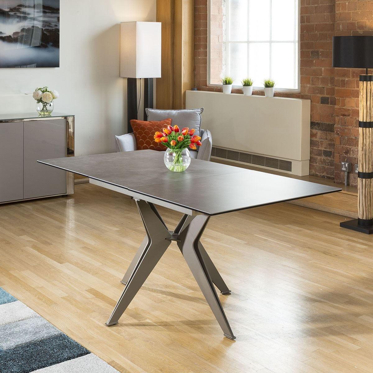 Large Grey Ceramic and Glass Extending Dining Table with Angled Legs Accompanied by 6 Stylish Grey Fabric Chairs. This lovely table features a stunning grey ceramic top and steel legs in a matt grey finish. The padded fabric chairs are comfortable, strong and extremely well made. The leaf is held under the main table when not in use. W170cm D85cm H75cm Modern 6 Seater Dining Set Premium Quality Furniture