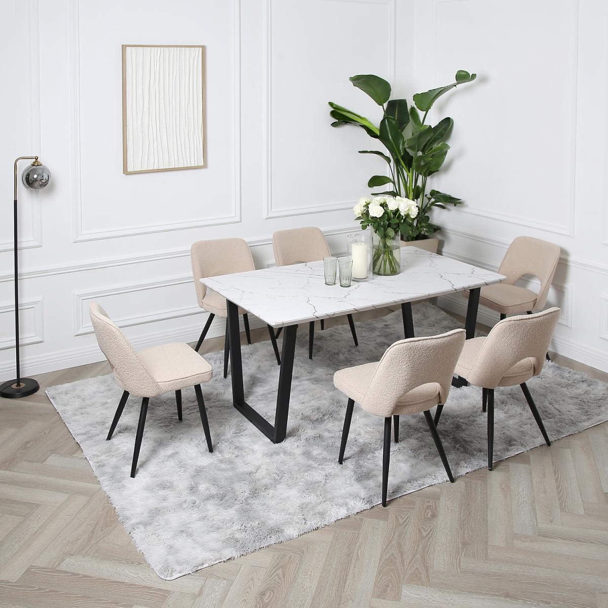 Our 6-seater Atlas marble dining set, which masterfully combines traditional elegance and cutting-edge design, will take your dining area to the next level of luxury. This dining table set centrepiece is a stunning dining table with a marble-effect finish that has been painstakingly built for long-lasting durability and a dining table modern aesthetic that will transform the atmosphere of your dining room. Make your dining area the pinnacle of modern luxury by selecting our dining table set 6 seater, where form and function meet to create a memorable dining experience. The combination of our table and chairs dining set is awesome for anyone interested in getting a dining table modern.