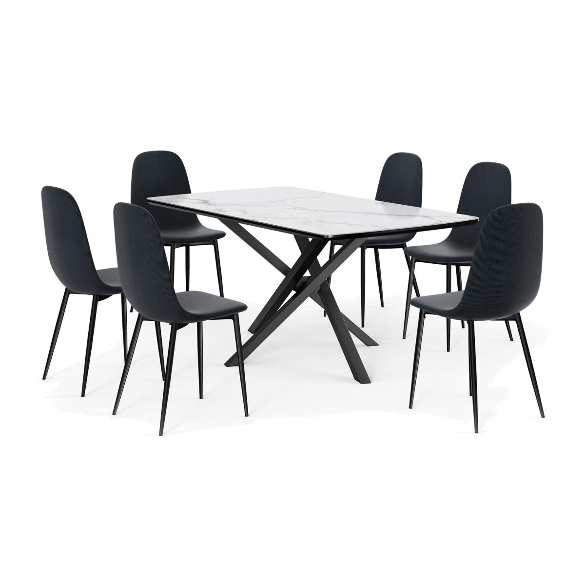 Infuse luxury style into your home with the Von Haus dining table and chairs set for 6, featuring an eye-catching cross-leg base to create a stunning centrepiece. The charcoal blue cord upholstery of the chairs complements the tables high-gloss tabletop effortlessly, bringing an opulent feel. Elevate your kitchen or dining room with our 6 seater dining table and chairs, designed for aesthetics and stability, form and function. The robust metal table legs are finished with non-slip adjustable rubber feet, ensuring sturdy dinner party-proof use in any home. Meanwhile the gentle curvature, soft-touch polyester, and foam padding of the chairs promise a comfortable dining experience. Add a touch of luxe to mundane weeknight meals, large family gatherings, and lavish dinner parties. Please Note: This large item is in multiple packages which may arrive separately. Check courier tracking for full details.
