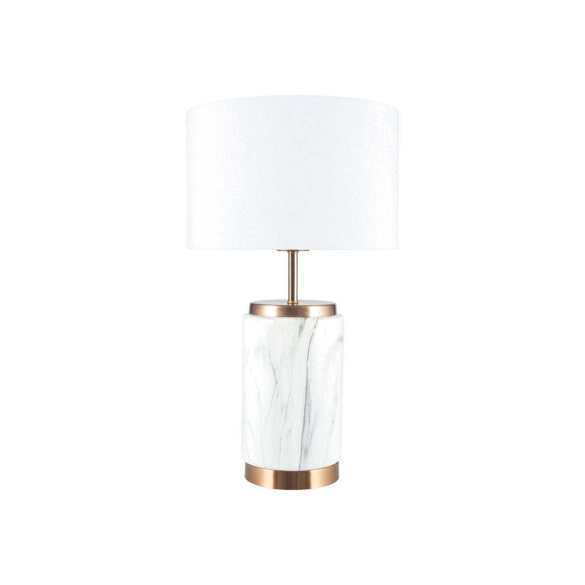 This product will be dispatched by one of our trusted suppliers. You’ll be contacted by their selected courier about your delivery. This modern ceramic table lamp with marble effect finish is complemented by the gold metal details offering a contemporary look. Topped with a white faux cotton shade this lamp will fit in most décor styles with it's beautiful finish. Please note Bulb is not included Bulb Fitting: ES/E27 Max Wattage: 60W D: 28cm. H: 49.5cm