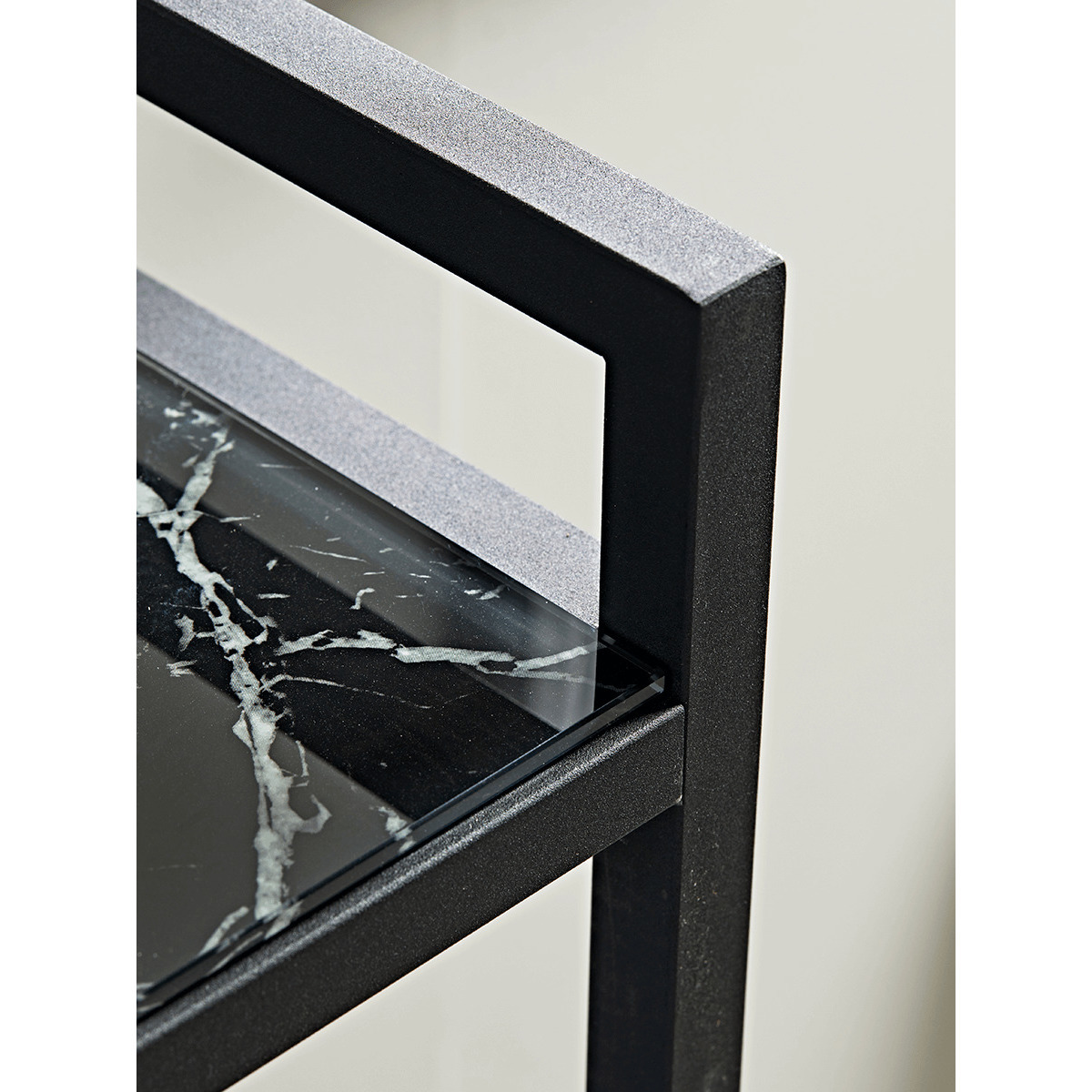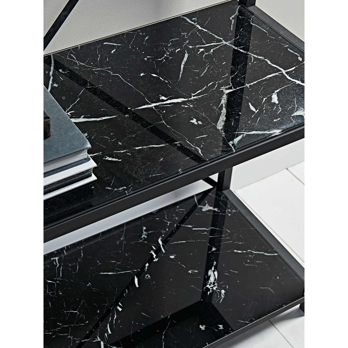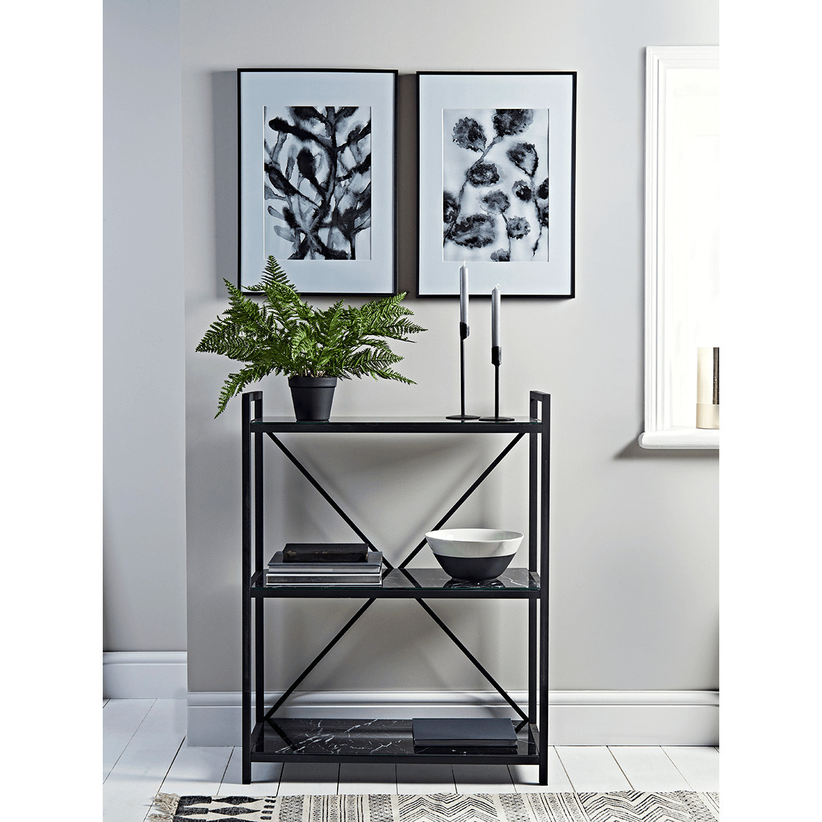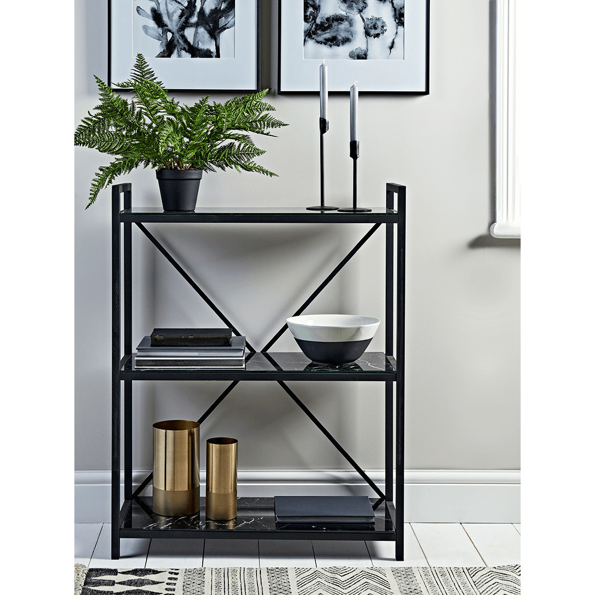 Slender and compact, with three useful shelves for storing and displaying your favourite things, our elegant shelf unit will make a beautiful addition to your hallway or living room. With a black metal frame including a cross back for stability and glass shelves with a black marble effect, the monochrome finish will make a statement in your home.