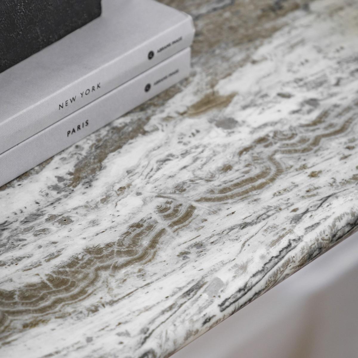 Dimensions:W110 x D40 x H80 cm Add a touch of sophisticated elegance to a room with this lovely console table. The top features the most amazing green-grey marble faux finish which is created with the latest state of the art technology to give the look and feel of the real thing but without the weight and technical difficulties. The faux marble pairs beautifully with the metal legs and underframe which has a classy bronzed brass finish, to give an understated luxury style, perfect for any classic modern interior. Matching items also available. Features: Green marble effect Feet Height 76.3cm Bronzed metal legs Matching items available Some assembly required