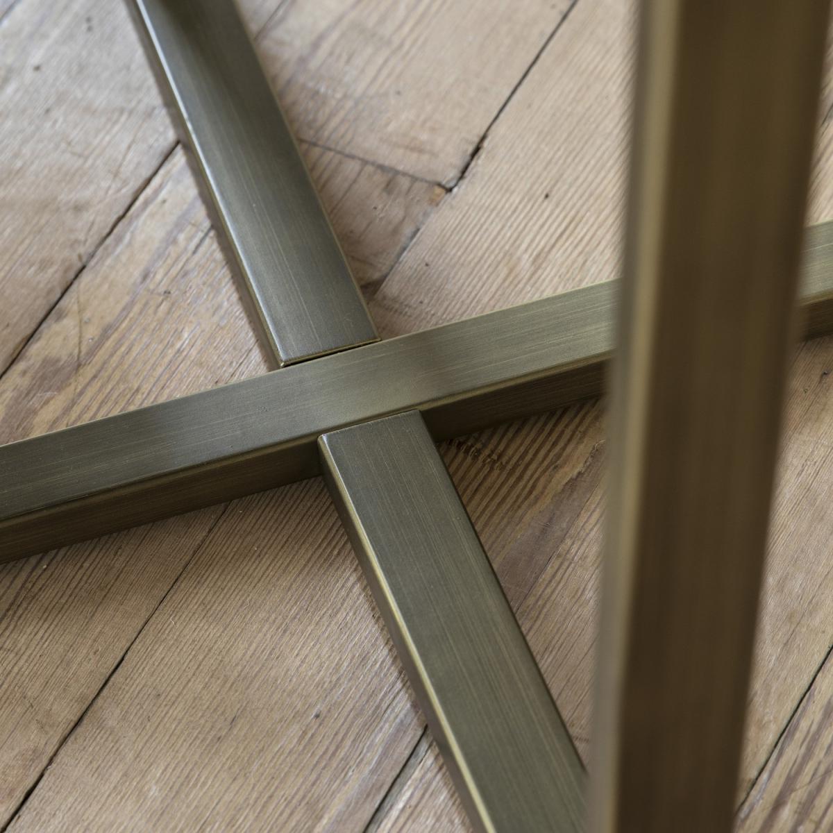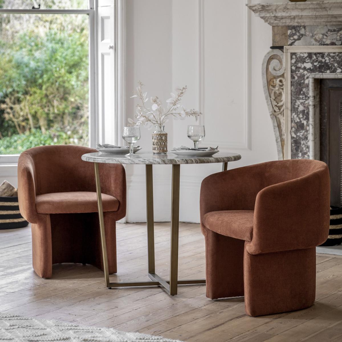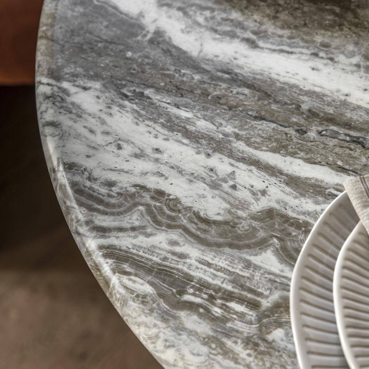 Dimensions:W90 x D90 x H75 cm This stylish dining table will add a touch of sophisticated elegance to a room. The stunning top features the most amazing green-grey marble faux finish which is created with the latest state of the art technology to give the look and feel of the real thing but without the weight and technical difficulties. The faux marble pairs beautifully with the metal base which has a classy bronzed brass finish, to give an understated luxury style, perfect for any classic modern interior. Matching items also available. Features: Green marble effect Feet Height 72cm Bronze metal base Seats 4 Round Matching items available Some assembly required