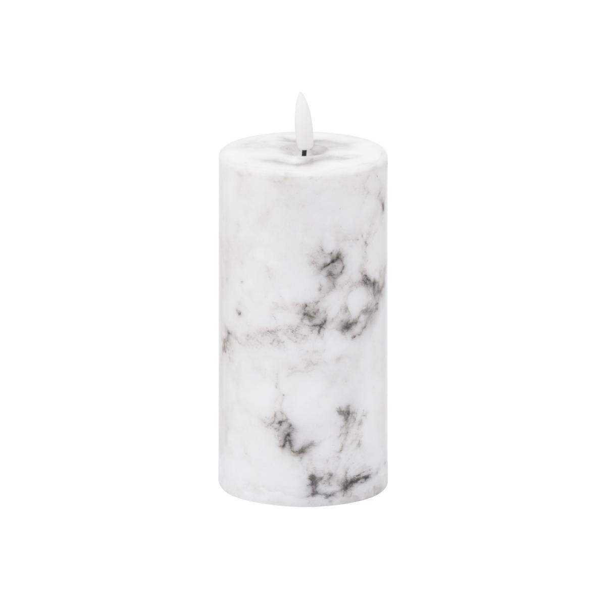 This 3 x 6 real wax battery operated pillar wick candle is perfect for decorating your home or adding the finishing flourish to a venue. The marble finish to this candle will look fantastic in contemporary styled interiors and adds a unique quality to each piece. Candles are the simplest way to create a warm atmosphere. The amber LED flame flickers gently to imitate the effect of a real flame but without the messy wax, risk of fire. This candle requires 2 x AA batteries (included) and features a simple switch on the base for oneoff and a timer option which will turn your candle off after 6 hours.