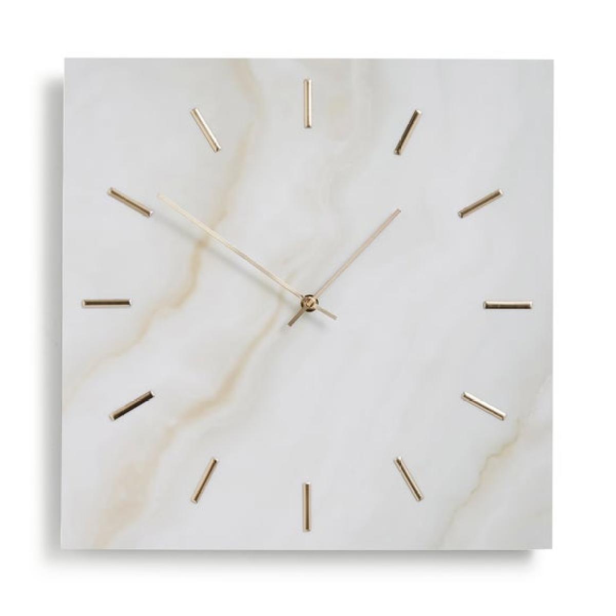 * Stylish marble effect * Square shape * Champagne gold hour markings * Takes 1 AA battery (not included) Geometric shapes meet classic, simple style with this Marble Effect wall clock. Featuring a chic cream colourway in a marble effect finish, the hands and hour markings are picked out in champagne gold metal - an effortlessly stylish combination. The square shape ensures it makes an eye-catching statement wherever it's placed, and it can be easily wall hung using the keyhole on the back.