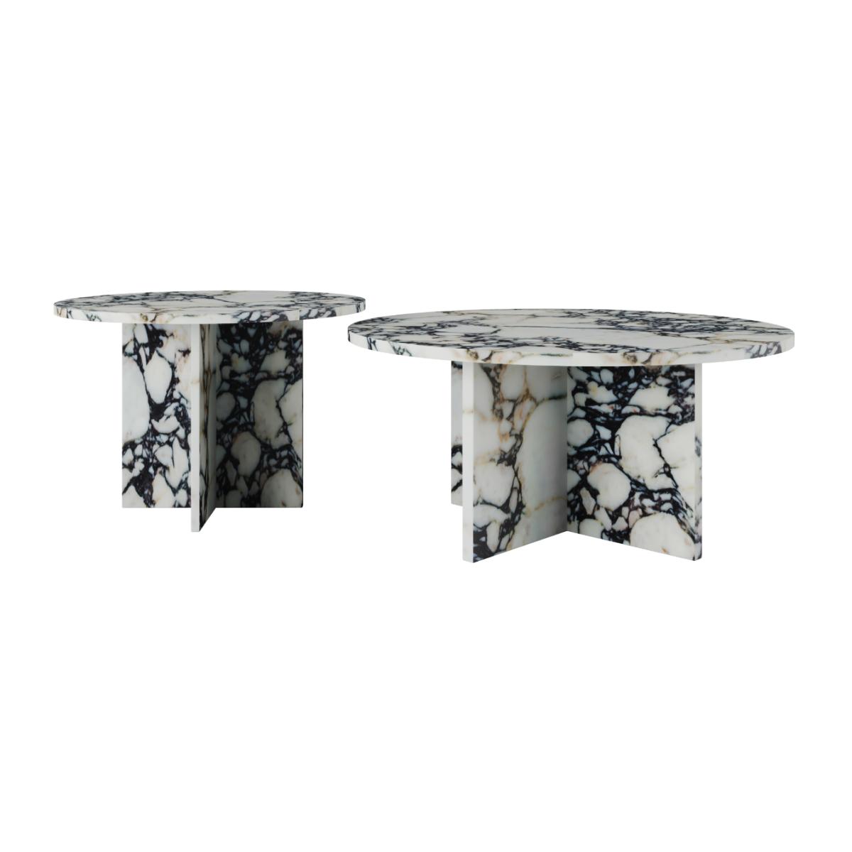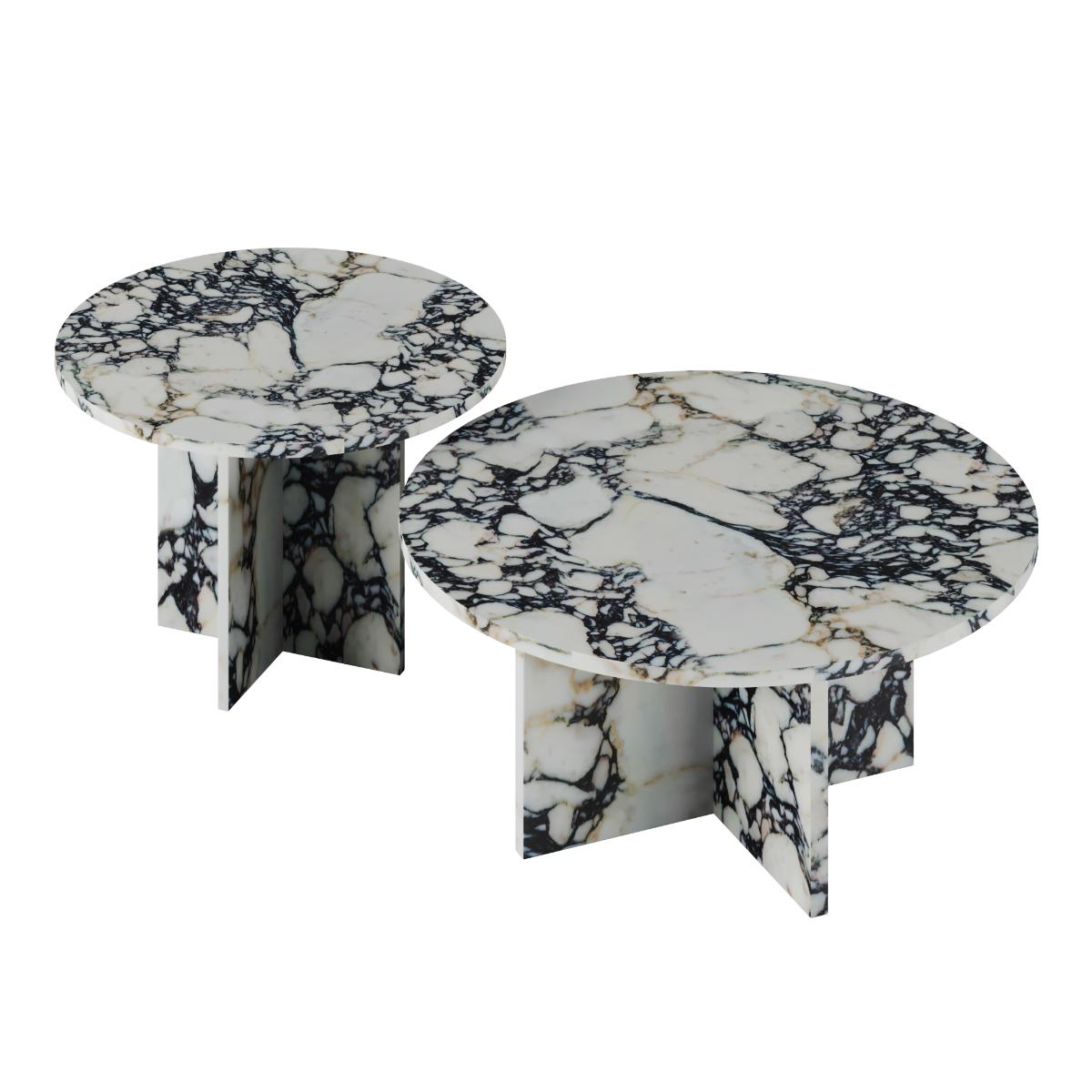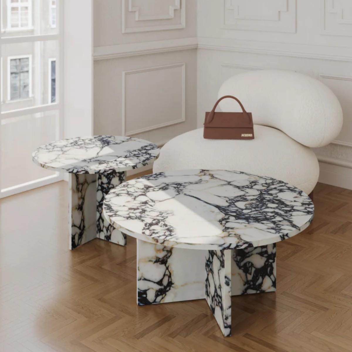 Elevate your living space with the Marmo Nest of Tables, crafted from exquisite Calacatta Viola marble. This set of two features luxurious veining and a sleek design, offering versatility and elegance. Perfect for compact spaces, these tables add sophistication while blending form and function seamlessly. A timeless statement piece. Customisation options are offered - contact us for advice choosing the type of marble, the design, and even the dimensions to suit your preferences and space.