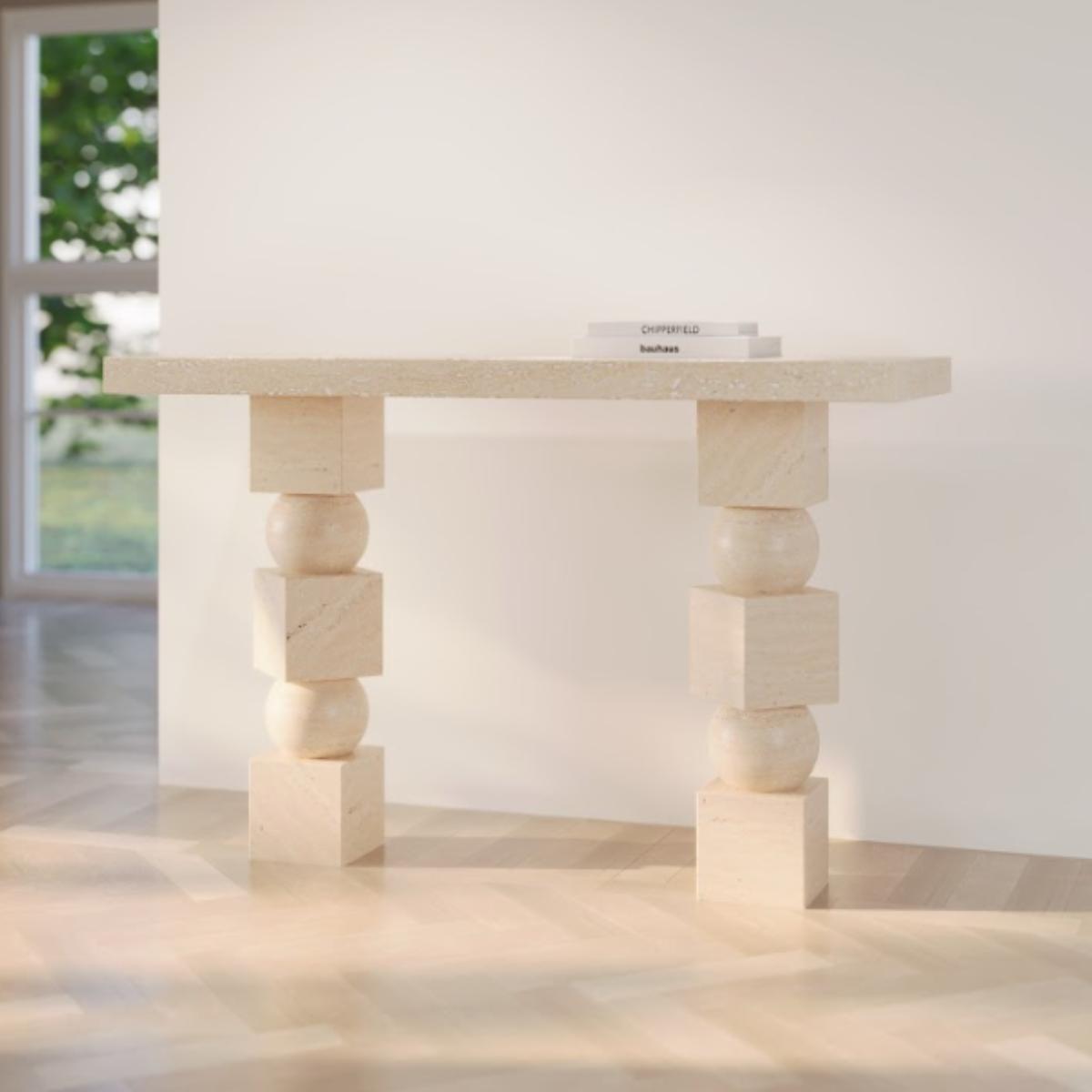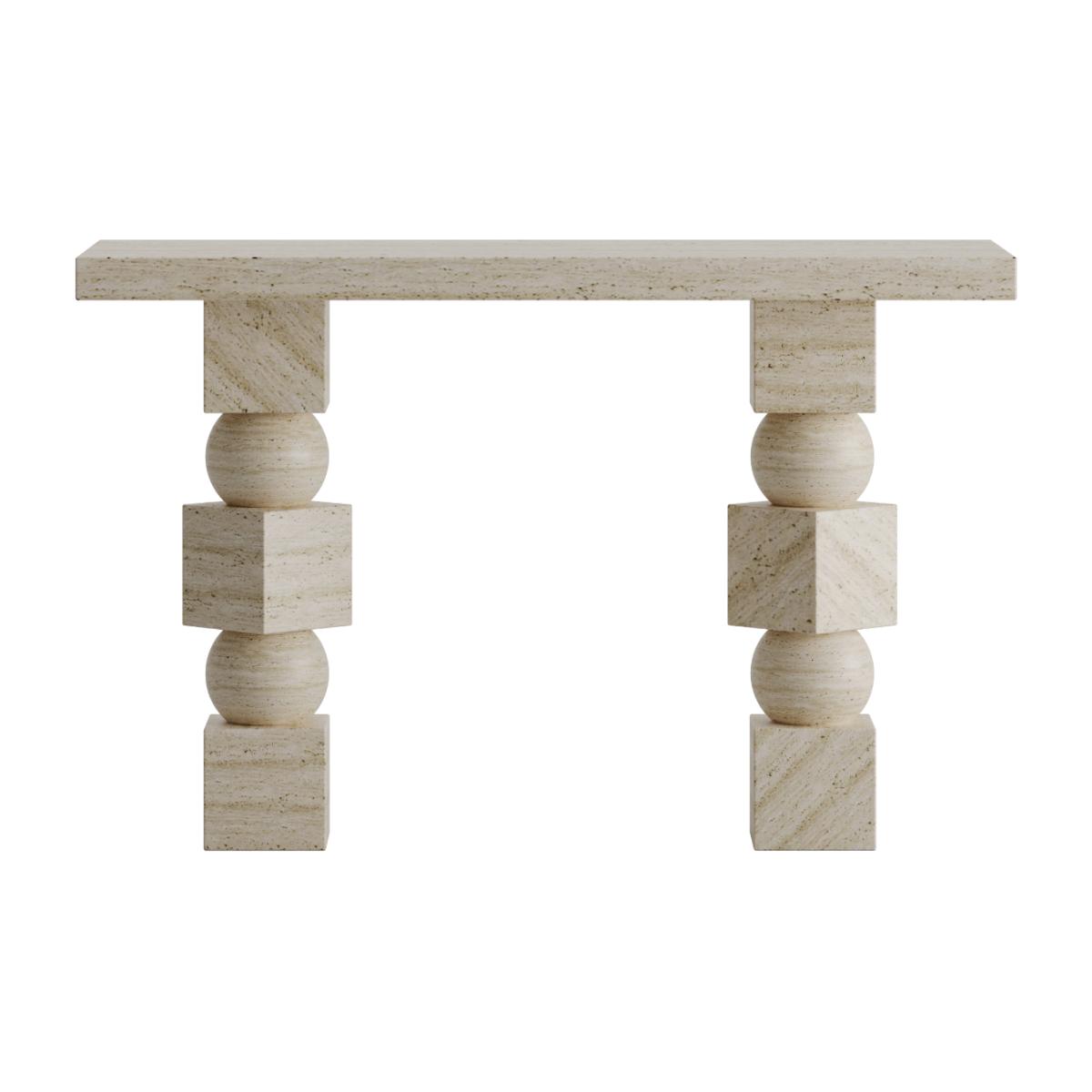 I particularly like this travertine console for its mix of natural texture and strong geometry - the stacked cubes and spheres give it a sculptural quality without feeling fussy. Its soft neutral tone works beautifully in minimalist, Scandi and modern-classic schemes, and it can just as easily sit against a plastered or deep-coloured wall in a more traditional hallway. For styling, keep accessories pared back so the stone remains the star. In an entrance you might hang an unframed mirror above and flank the table with a pair of slender lamps or tall ceramic vases. In a living space, position it behind a sofa as a low display surface for a stack of design books, a small potted plant and a simple metal tray to catch your keys.