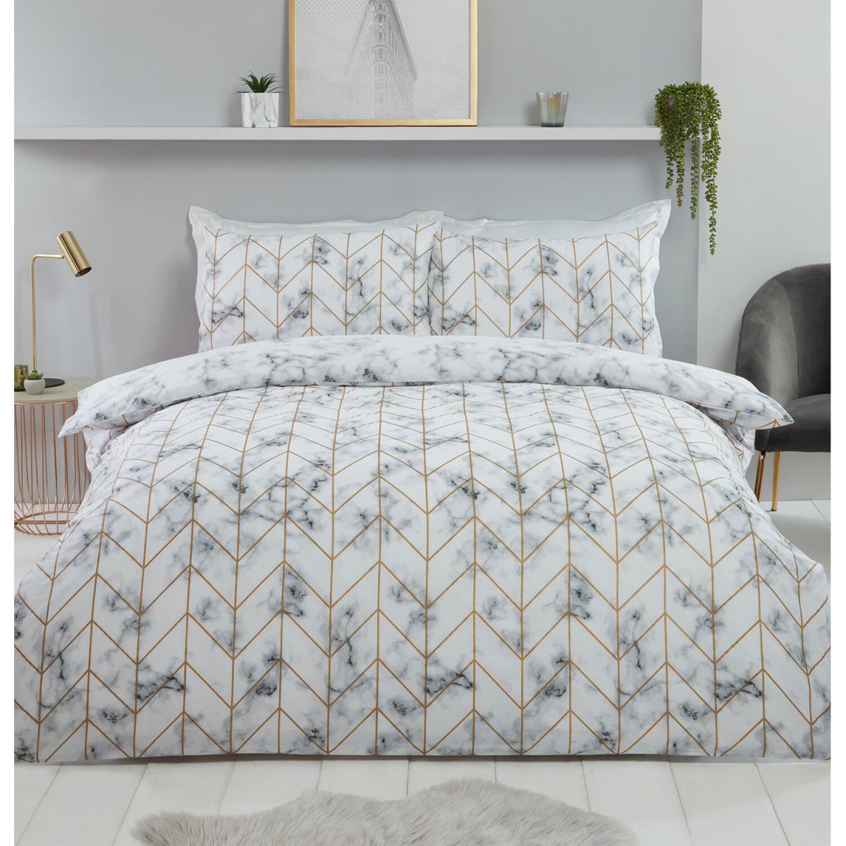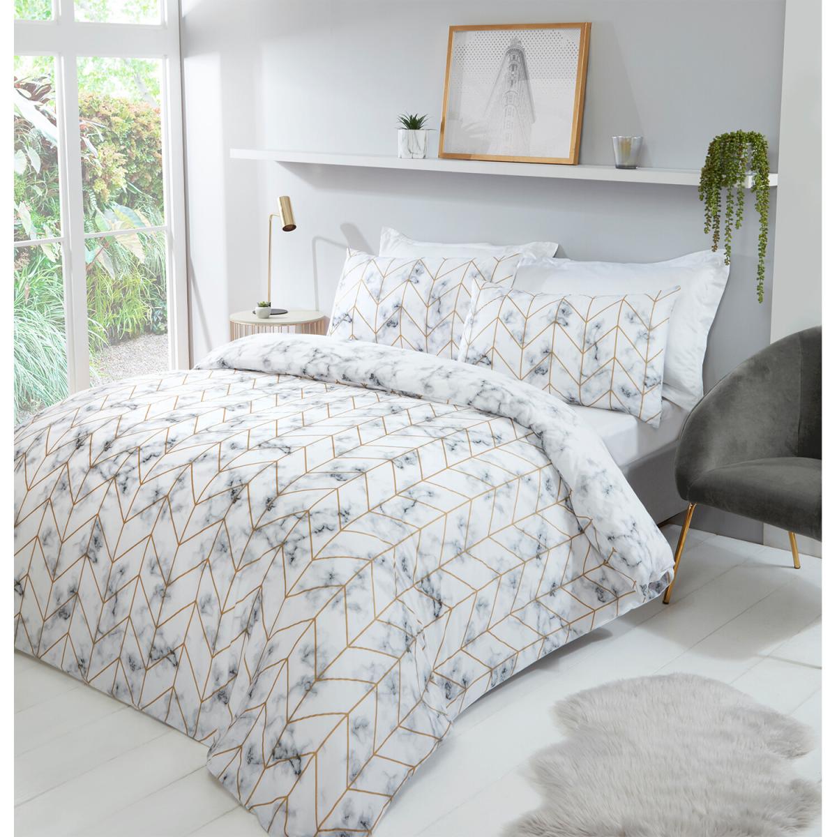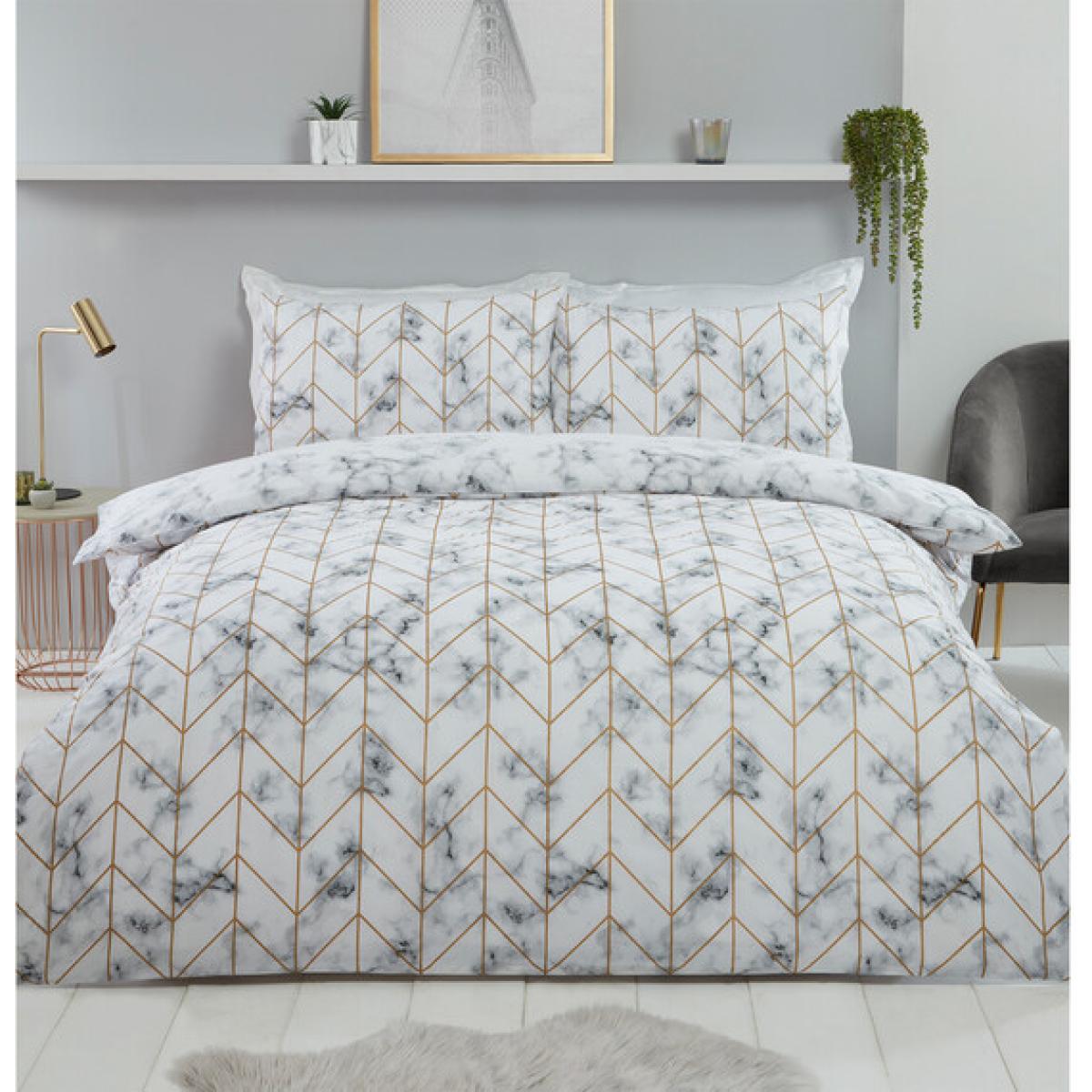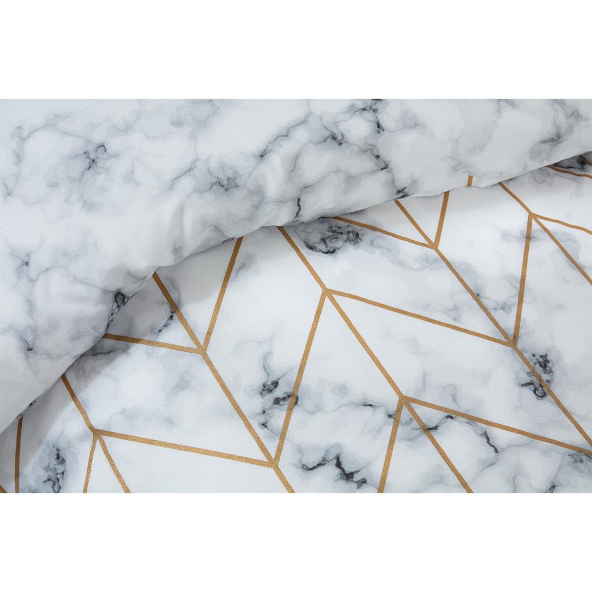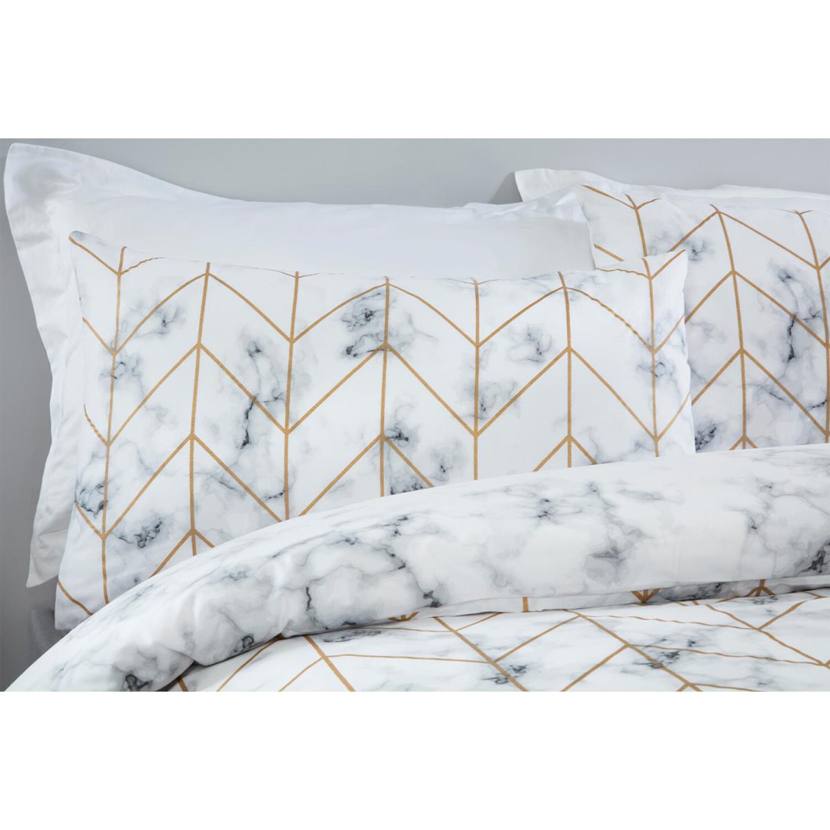 Super stylish and on-trend, this Marble Metallic Duvet Cover and Pillowcase Set features a reversible white and grey marble effect print with a glistening geometric overlay in metallic gold. With matching pillowcases included, this comfy duvet set will turn your bed into a fabulous and fresh focal point.