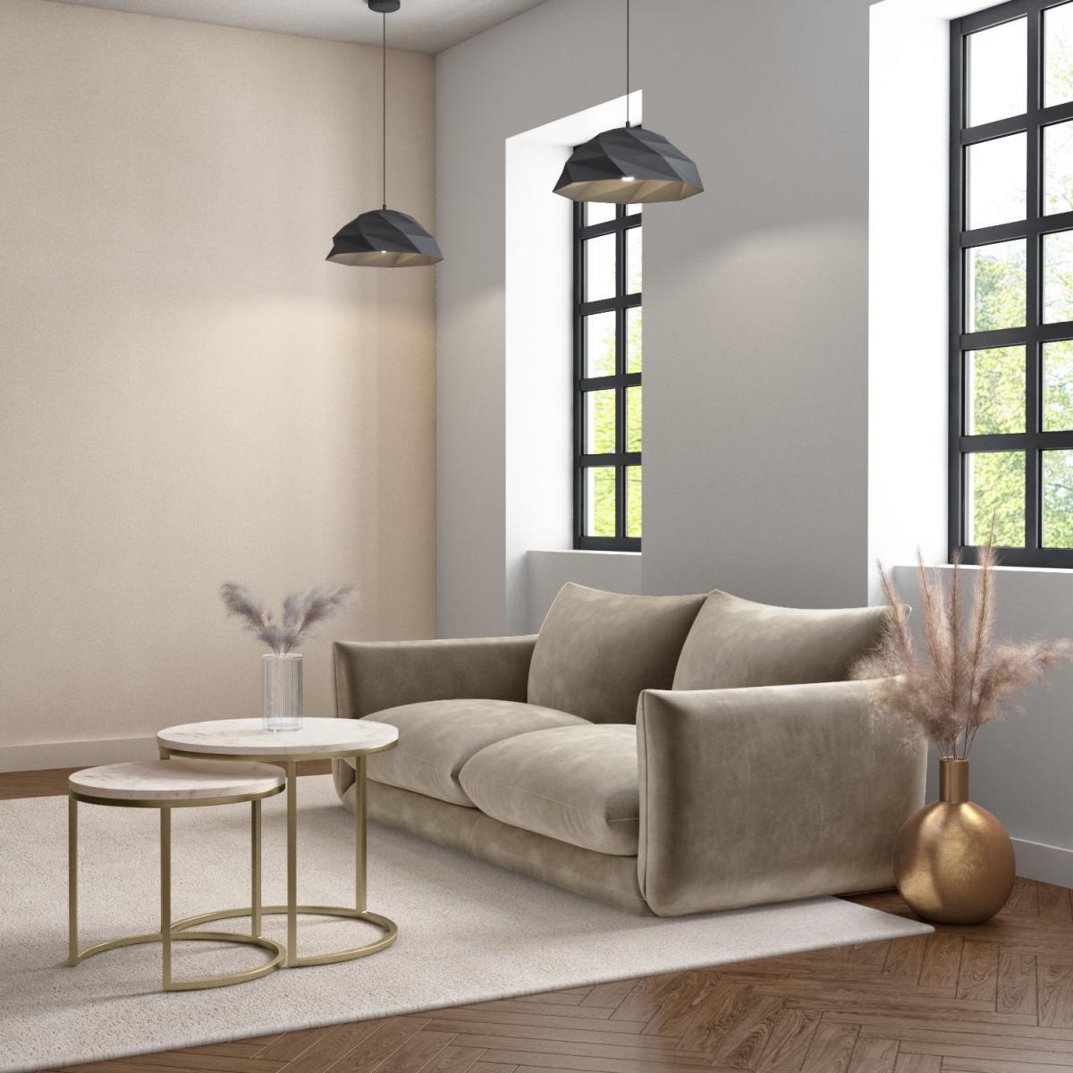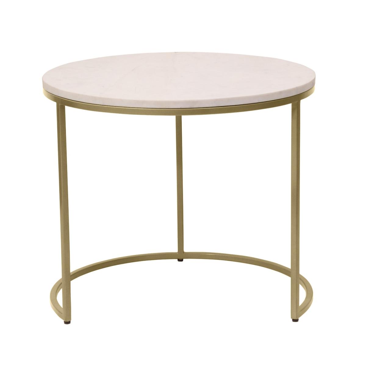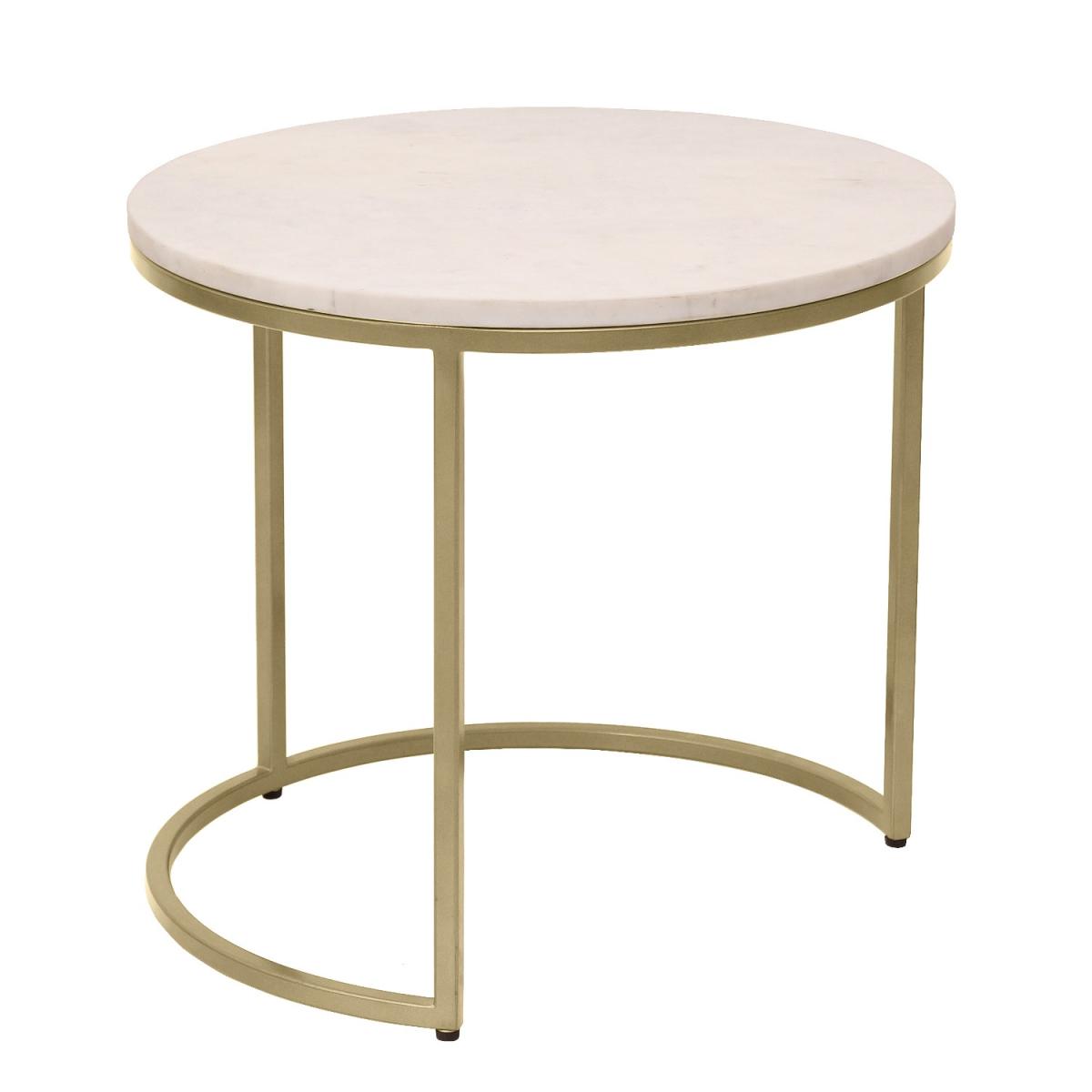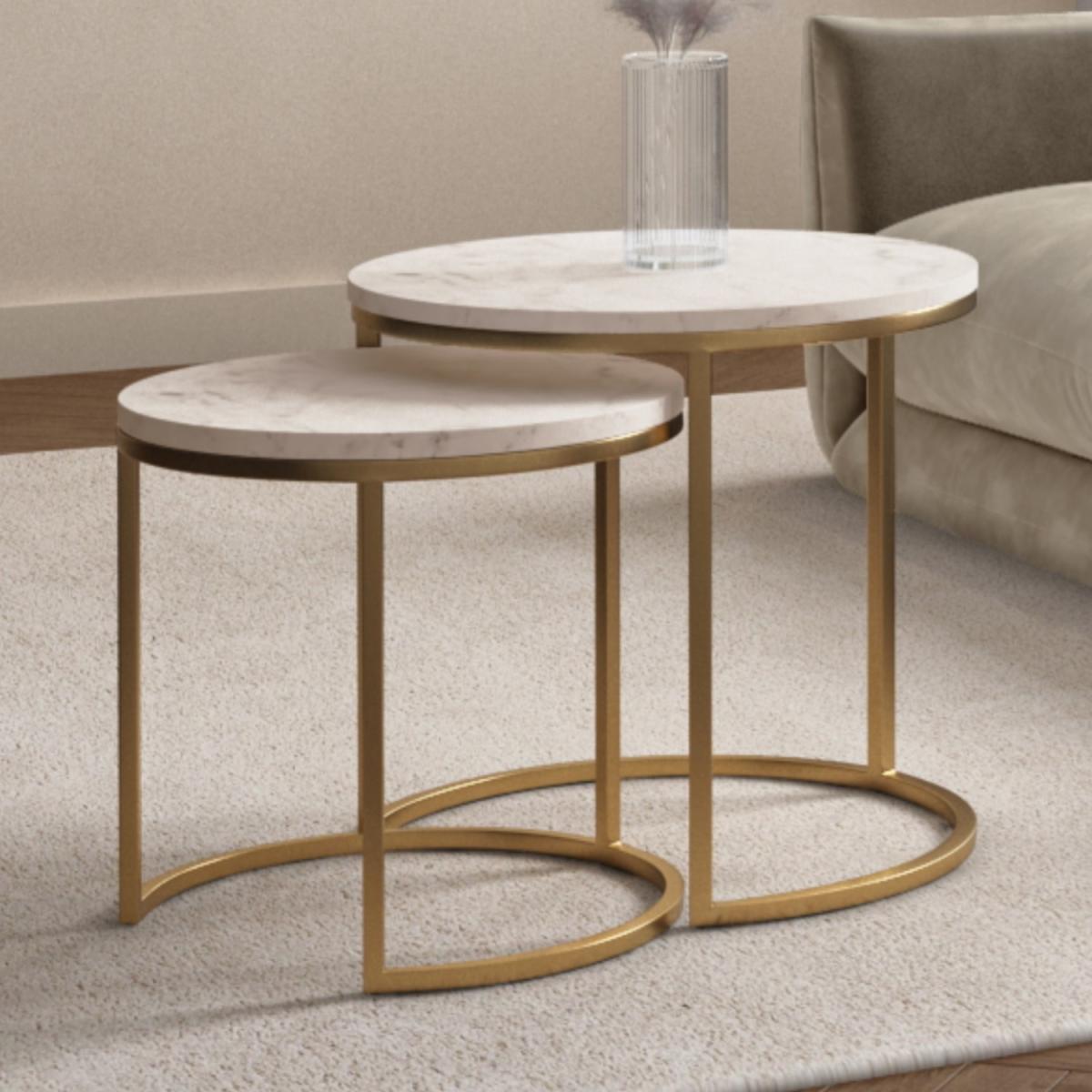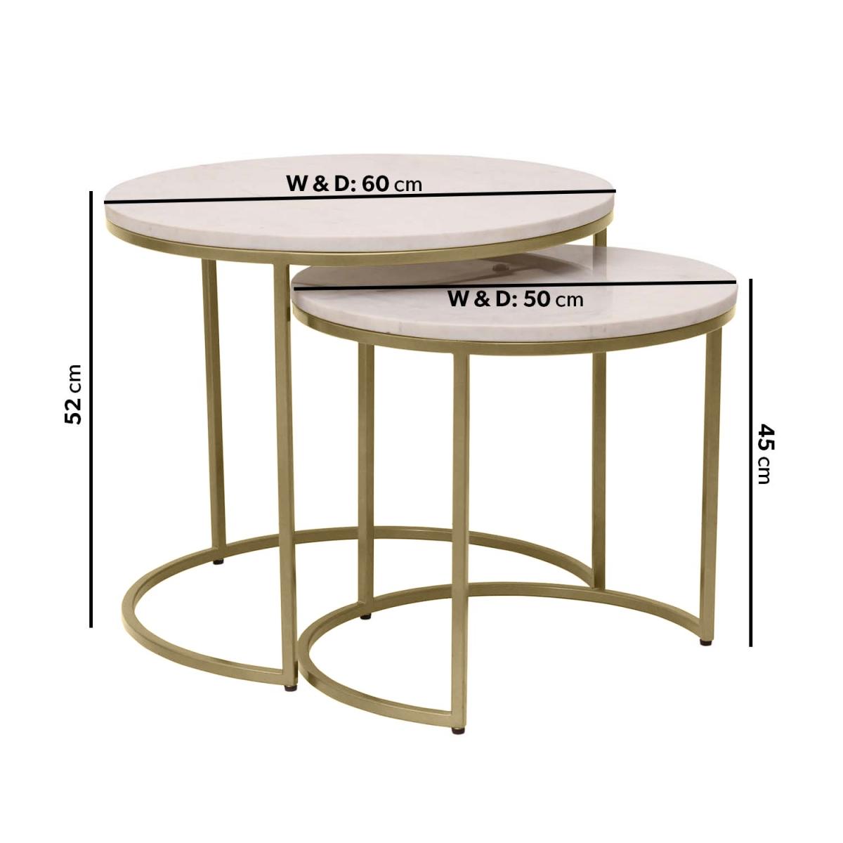 Marble contrasts and complements the gold legs Real marble top adds a touch of luxury to your space Use the nests either as your main or side coffee table On-trend item that'll look good in any modern home Round nested tables are a chic space-saving solution Need to know Weight: 29.7kg Colour: White Finish: Marble and gold Material: White marble and iron Assembly required: No Real marble – marble is made from natural stone and due to the nature of the material no two pieces are alike. Natural marble stone may vary in colour, pattern, texture, and veining