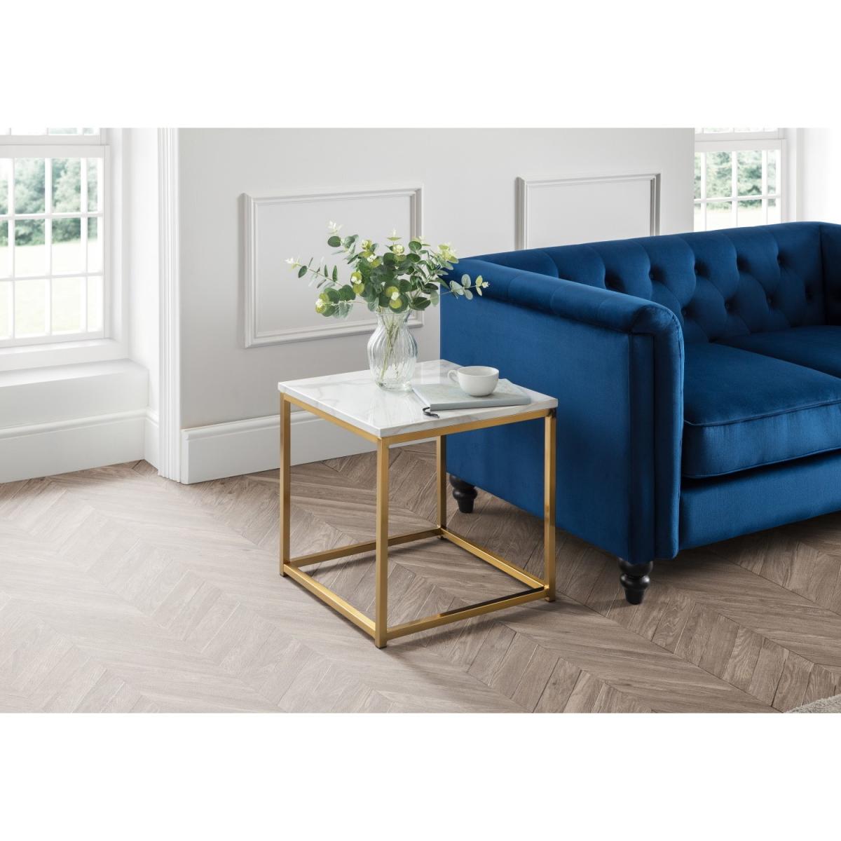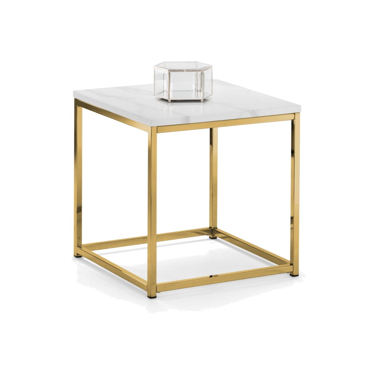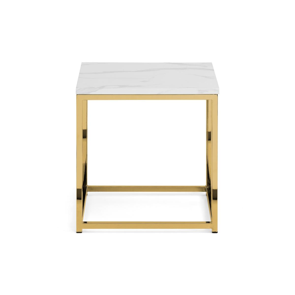 Dimensions H50 x W50 x D50 cm. The Scala side table features a gold frame and marble effect table top perfect for a contemporary home. Features. Striking gold frame design. Marble effect table top Perfect addition to a contemporary home Steel frame ensures durability. Matching items available in the Scala range. Assembly required..