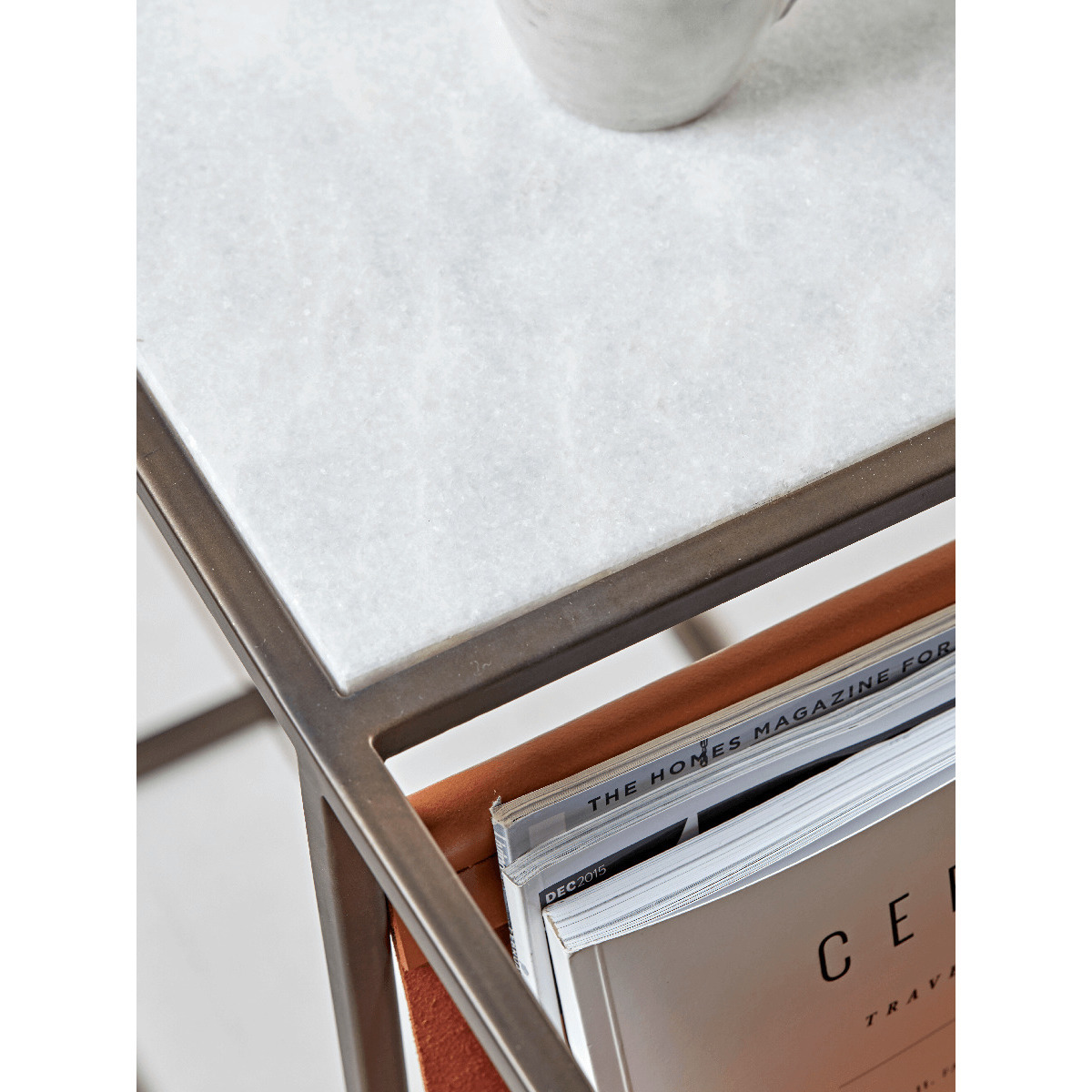 Crafted from an iron silhouette, this contemporary side table comes complete with a marble top and handy leather sling for storing all of your favourite magazines.