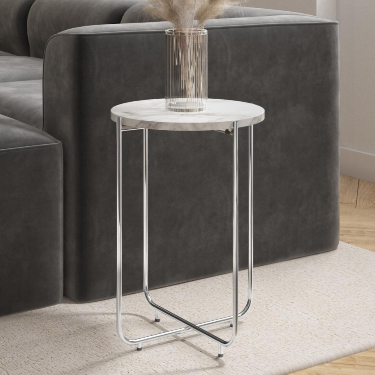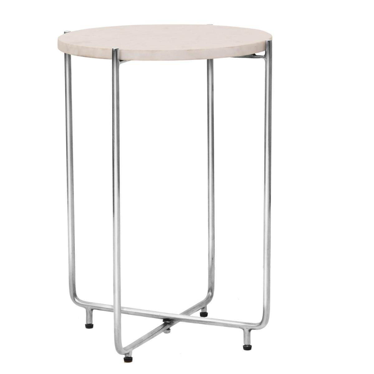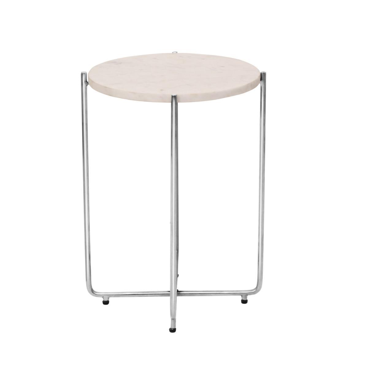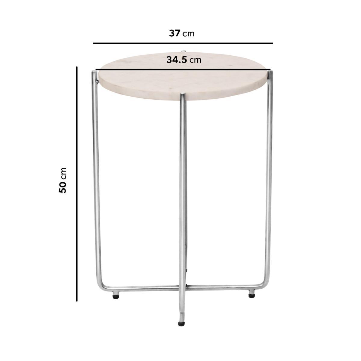 Features we love Adds a stylish touch with its elegant modest design. The real ethically sourced marble tabletop is stunning. The silver and white colourway is a striking contrast. The open frame structure creates an illusion of space. Matching items available in the Martina range Please note – Each tabletop is unique due to the natural stone so no two pieces are alike. Natural marble stone may vary in colour pattern texture and veining. Need to know. Dimensions. H50 x W37 x D37 cm Weight. 7.5kg Colour. White marble and silver frame Finish. Powder coated black frame marble tabletop and rubber feet Material. Iron marble and rubber Assembly required. Yes minimal.