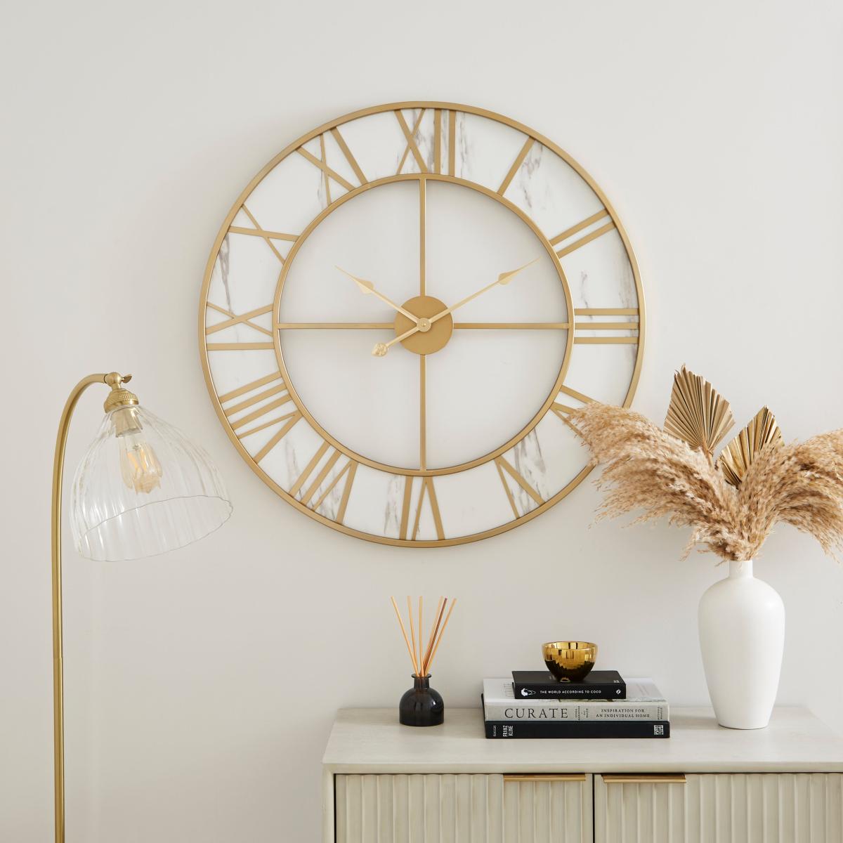 * Modern, skeleton design* Marble patterned face* Wall clock* Gold and white colourway* Silent movement This wall clock is a great modern yet classic touch, with a marbled pattern face and roman numeral markings. The gold and white colourway is a great accent for subtle, sophisticated colour, and it’s simple to hang on the wall using the keyhole. The silent movement takes 1 x AA battery (not included) to keep perfect time.