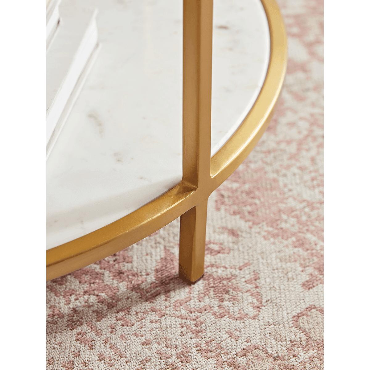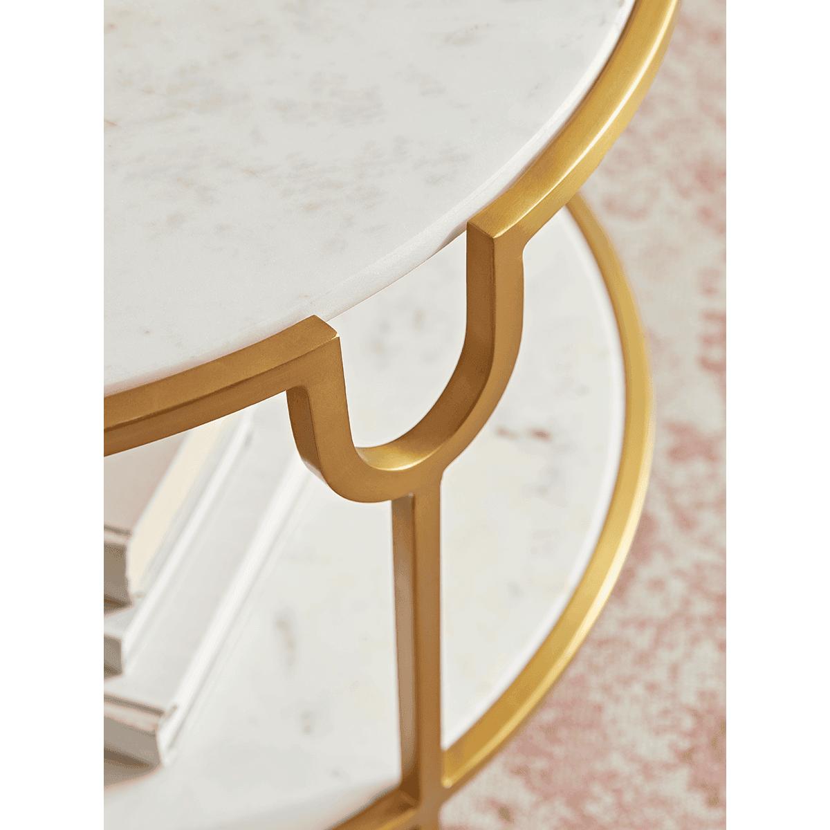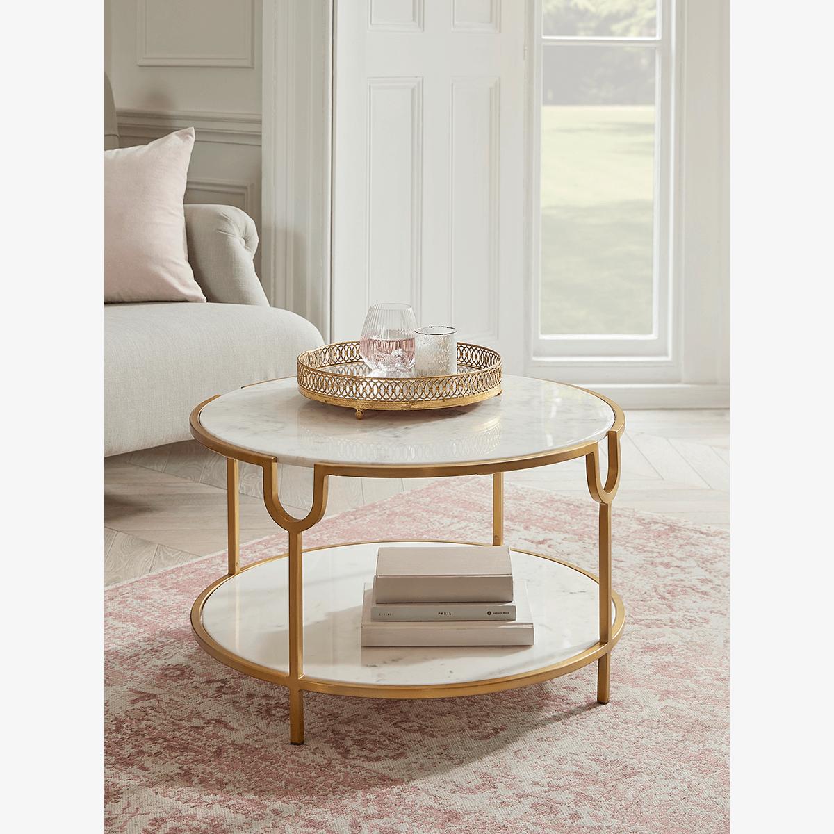 With surfaces of stunning white baswara marble set in a metal frame with a brushed brass finish, our Marble Topped Round Coffee Table will make a timeless luxe addition to any stylish home. The top provides the perfect resting place for your tea tray or evening drinks, while magazines and papers can be stowed away on the lower shelf. We’ve styled this table as part of our Faded Elegance trend, but it will happily elevate any scheme.