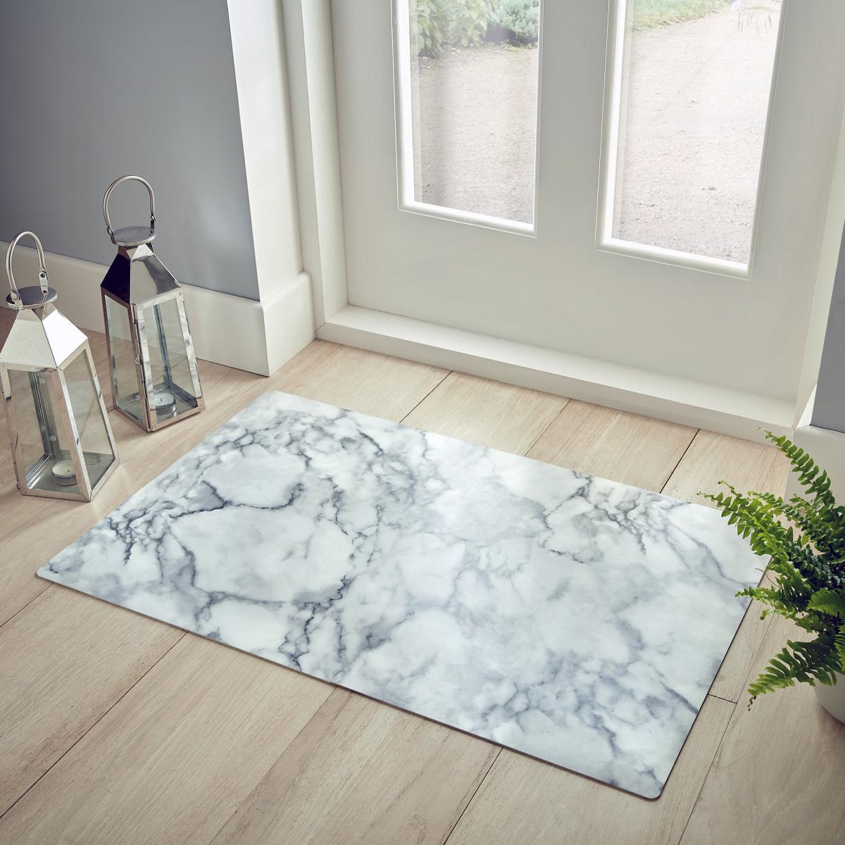 Get the marble effect look with the Marble Vinyl Doormat for adding a touch of glam style to your floors. The 100% vinyl composition makes the Marble Vinyl Doormat perfect for on-the-go homes. The low-profile design is hard-wearing, the ideal choice for adding some comfort to high-traffic zones. Wipe-clean and moppable, the Marble Vinyl Doormat is pet and child friendly. We love using in kitchens, hallways and bathrooms to add a cushioned element to hard floors and some luxe style to your busy spaces. Turn regularly to ensure even wear and to reduce moisture from building up under the mat. Wipe clean any spills with a damp, white cloth. Avoid the use of hard chemicals or bleach. Do not wash or tumble dry. Do not place this rug near an open fire. Please do not leave children or infants unattended.