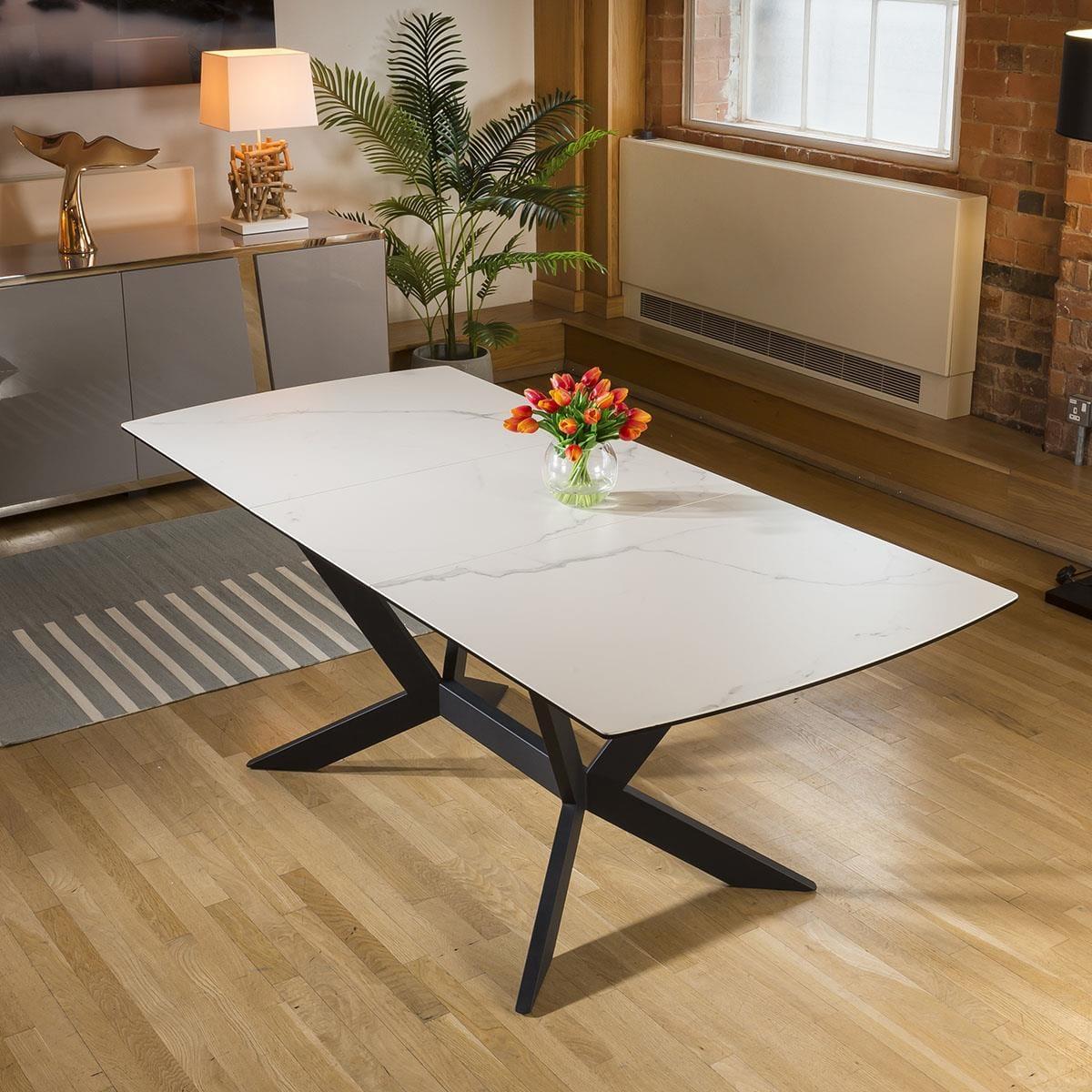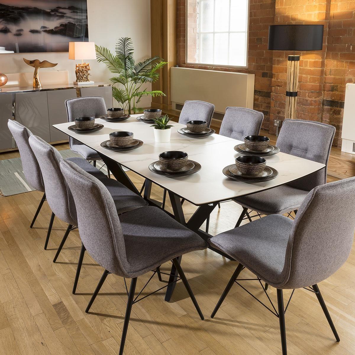 This dining table is topped with stunning white ceramic and extends from 1500mm to 2000mm. The extension leaf has an auto lift feature to ensure ease of use. Includes a set of 8 Dining Chairs Medium Grey Fabric With Black Powder Coated Legs. Simple in design and elegant all at the same time. Features include, stunning hardwearing & soft medium grey fabric and black crossed wire style frame and legs. Quatropi Luxury Dining Sets have been designed to stand out in the most contemporary dining rooms and kitchens in the UK. The dining table sets have been put together by our expert designers to provide a large combination of choice from farmhouse style to prestige, including small or large dining table sets, long narrow tables, round breakfast tables, farmhouse solid oak sets, extendable dining sets, corner sofa bench sets - only to mention a few! Our range of dining chairs that we match to the dining tables provides you with a large choice of sets - these are available in many colours and made in many styles, such as carver, faux leather, suede, velvet and many more. If you need more information about this product, use the Live Chat service to speak to the team or send us a message. Spread the cost our with interest-free finance options. Minimum spend applies. W200cm D90cm H75cm Modern 8 Seater Dining Set Premium Quality Furniture