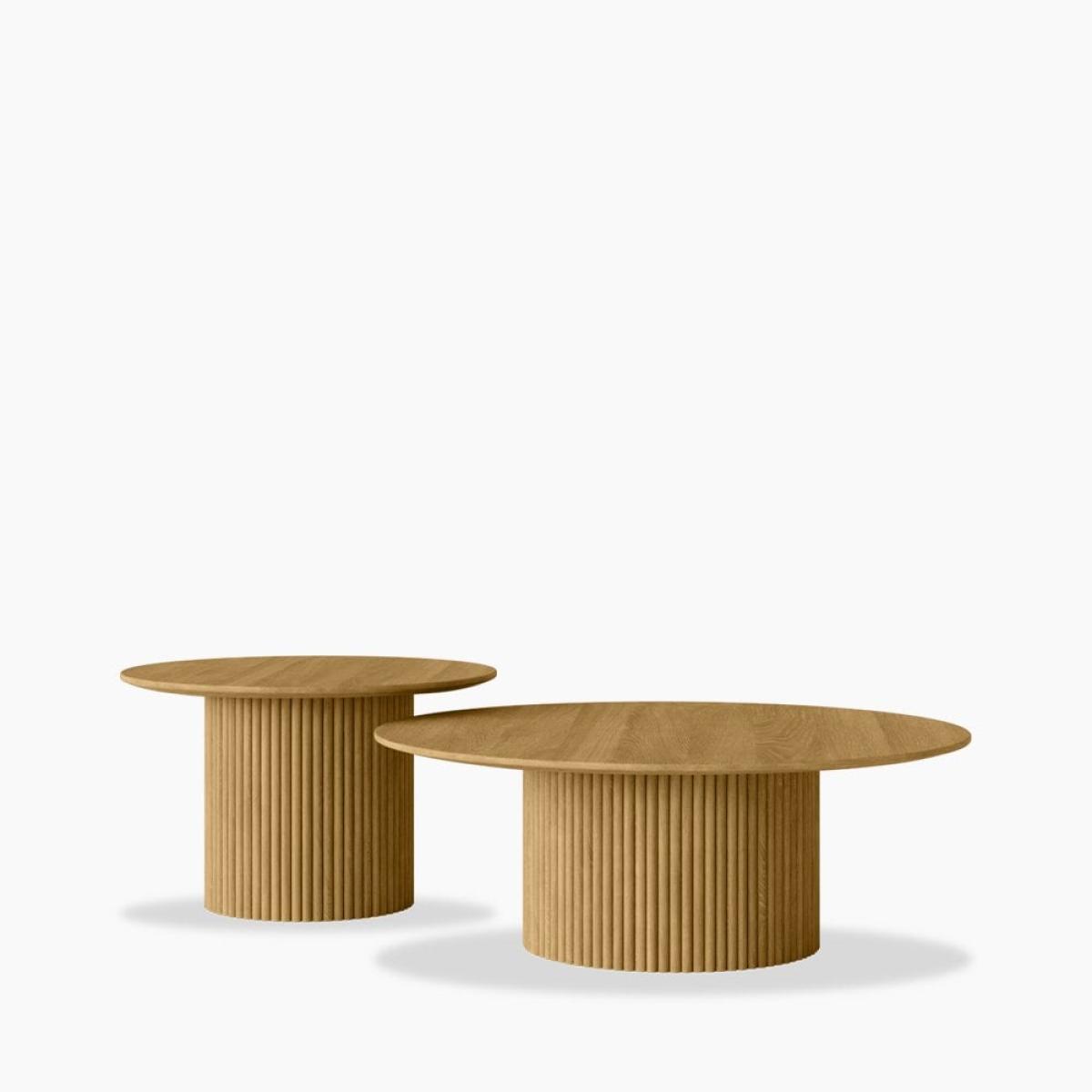 Injecting Japandi style into your living room is simple with the Marcel Set of 2 Coffee Tables. The spacious round surfaces and fluted pedestal bases have a light wood effect finish that is durable, long-lasting, and easy to maintain. With smooth curves, ribbed base detailing, and an even finish, the Marcel Round Coffee Tables are effortless. Made from a specially treated paper veneer finish that is both waterproof and stain resistant, the Marcel Table is easy to maintain and durable, for a long-lasting piece suitable for everyday use.