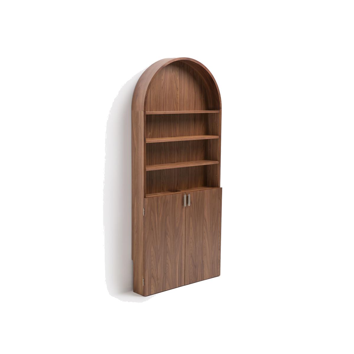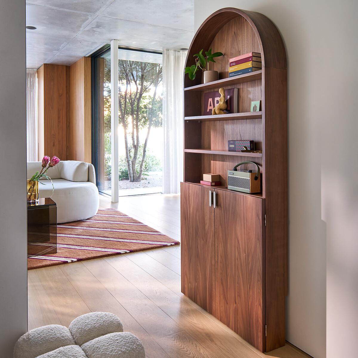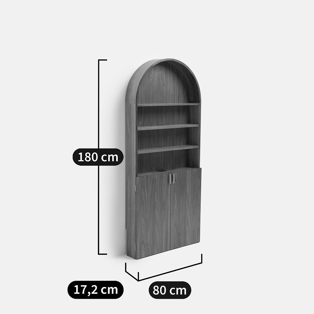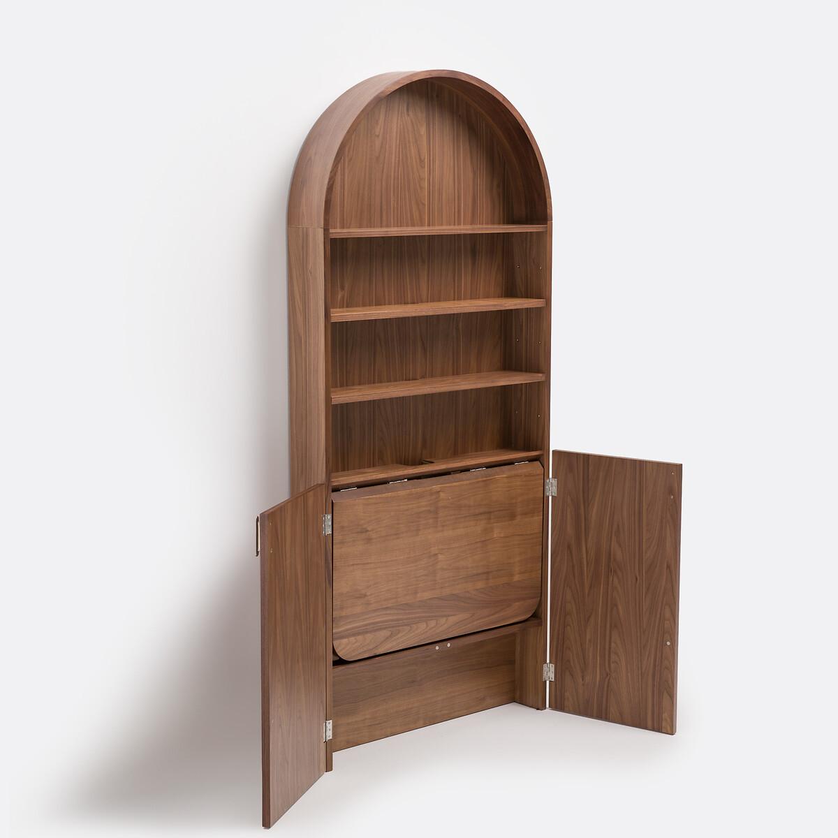 The Marcela desk is part of our Les Ingénieux collection. Creations full of ideas to make life simpler and everyday life more beautiful, imagined by our designers in France..Marcela, the dual-purpose desk, for disconnecting once the doors are closed. Arch-shaped design and dark wood, a vintage-inspired combination for the Marcela bookcase with hideaway desk. Elegant, discreet and super-functional, this bookcase with hideaway desk conceals a beautiful workspace. A sophisticated, contemporary touch for any interior. Why you'll love it • When closed, it's an elegant, shallow shelving unit that fits in anywhere, even in a hallway • Open, it's a functional desk with plenty of space for your screens • A space-saving piece of furniture to turn small spaces into a mini office • An essential feature is the cable management function for easy connection of lamps or computers • Marcela is delivered assembled: all you have to do is decide where you want it to go. Product Details • Fold-out desk • In walnut and walnut veneered MDF, finished with nitrocellulose varnish • FSC® certified mixed wood • 3 upper shelves (1 fixed shelf and 2 removable, height-adjustable shelves) • 2 lower doors with fold-out desk • Zinc alloy handles with brushed finish • Cable access hole • Wall fixing (screws and plugs not supplied)Dimensions. Overall • Width: 80cm • Height: 180cm • Depth: 17.2cm • Weight: 36kg. Folding desktop • Width: 75cm • Height: 75cm • Depth: 45cmDelivery:. Sold pre-assembled. Available for home delivery. Note! Please ensure all passageways and doorways are wide enough. • WOOD FROM MORE SUSTAINABLY MANAGED FORESTS AND CONTROLLED SOURCES. FSC® Mix wood contains at least 70% FSC® certified and/or recycled wood, the remainder being FSC® controlled wood. Parcel Dimensions1 parcel • L190 x H23 x D90cm. 48kg