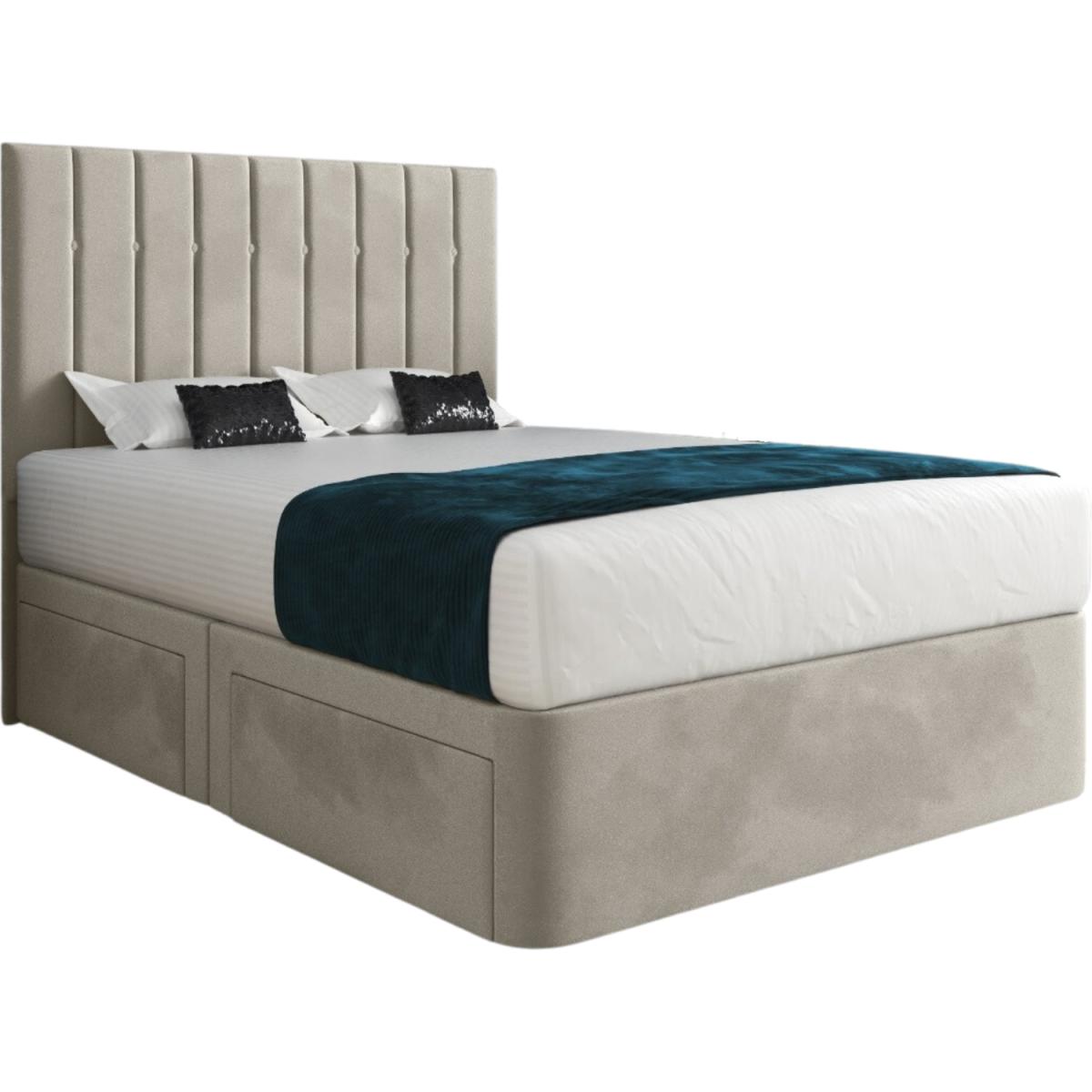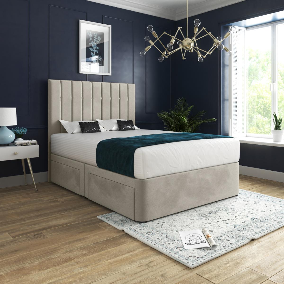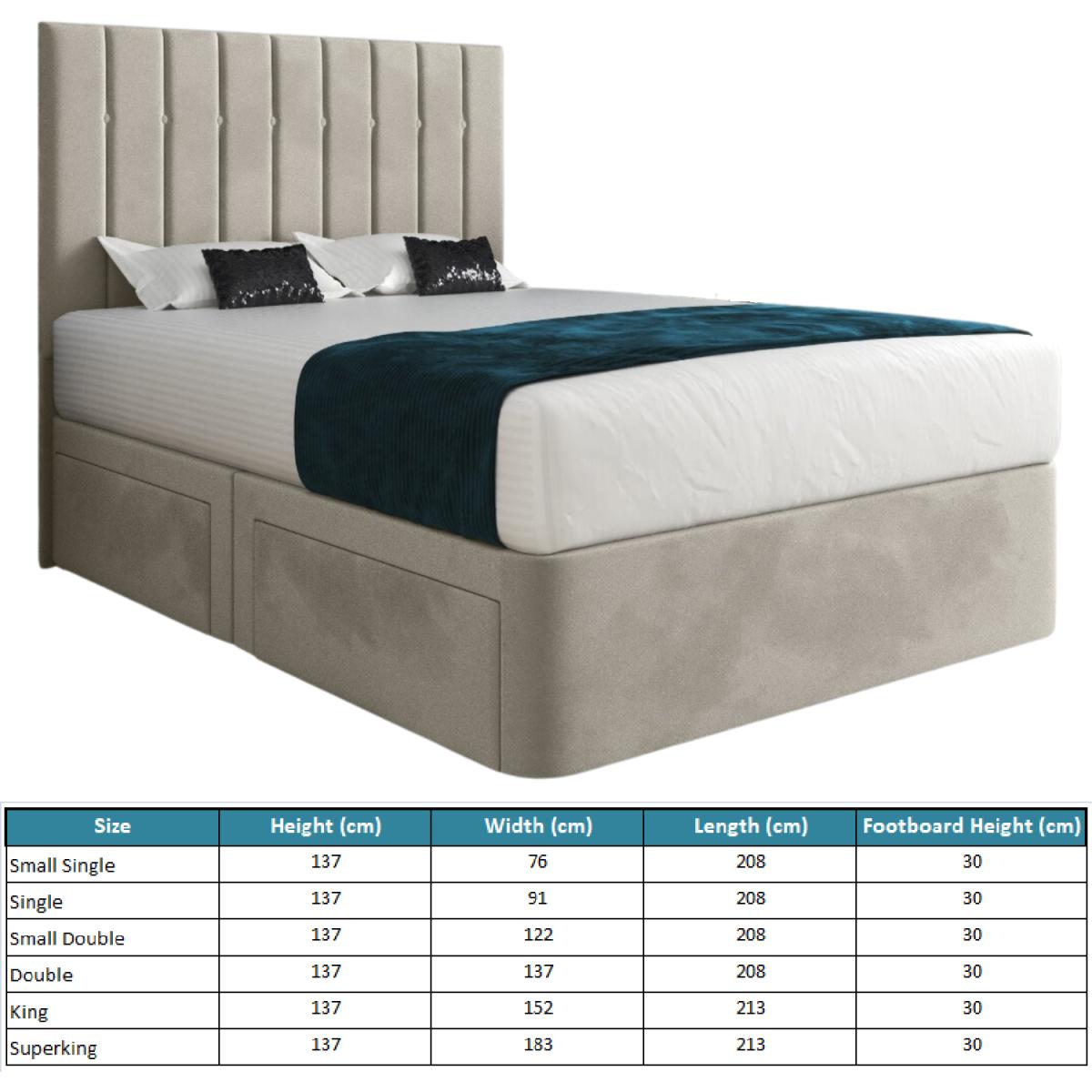 Linear modern design floorstanding headboard with a classic divan base. Divan base comes equipped with chrome gliders and optional drawer configurations can be chosen for added storage solution. The floorstanding headboard is solid and easy to affix to the base. Aesthetically clean and sleak with a contemporary line design.