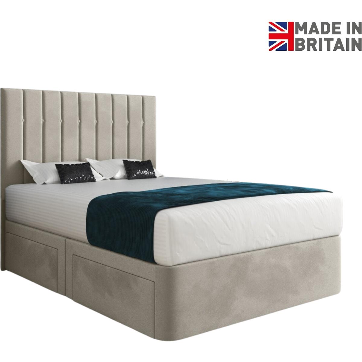 Linear modern design floorstanding headboard with a classic divan base. Divan base comes equipped with chrome gliders and optional drawer configurations can be chosen for added storage solution. The floorstanding headboard is solid and easy to affix to the base. Aesthetically clean and sleak with a contemporary line design.