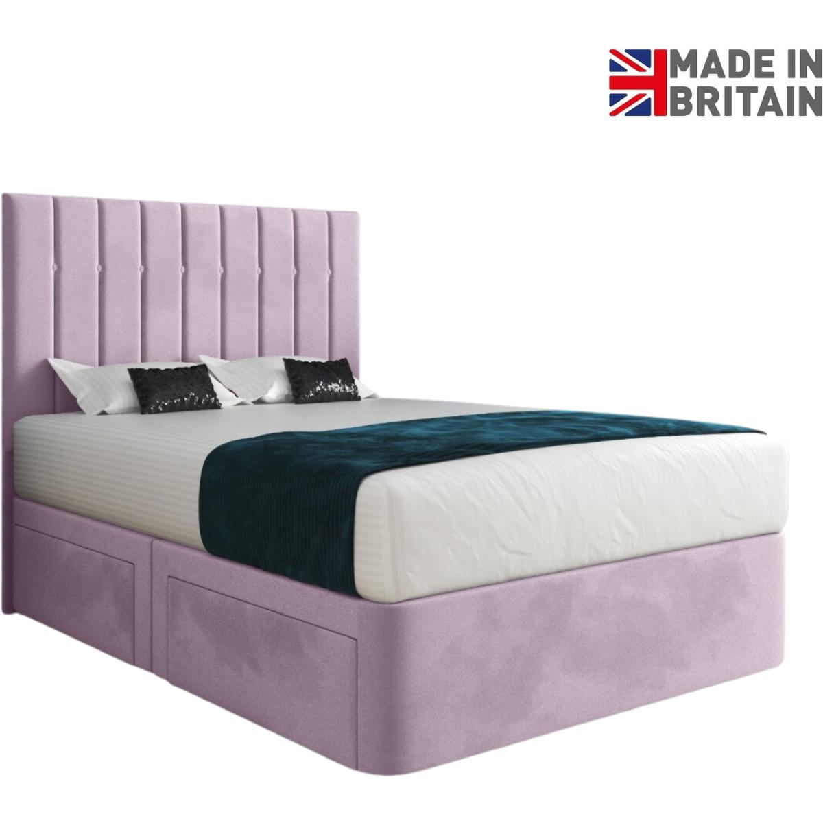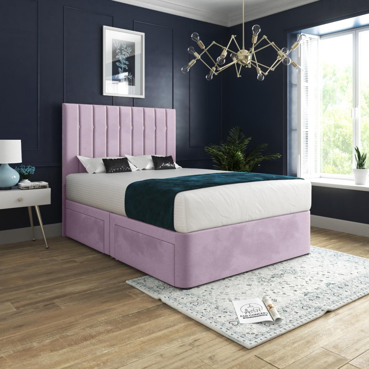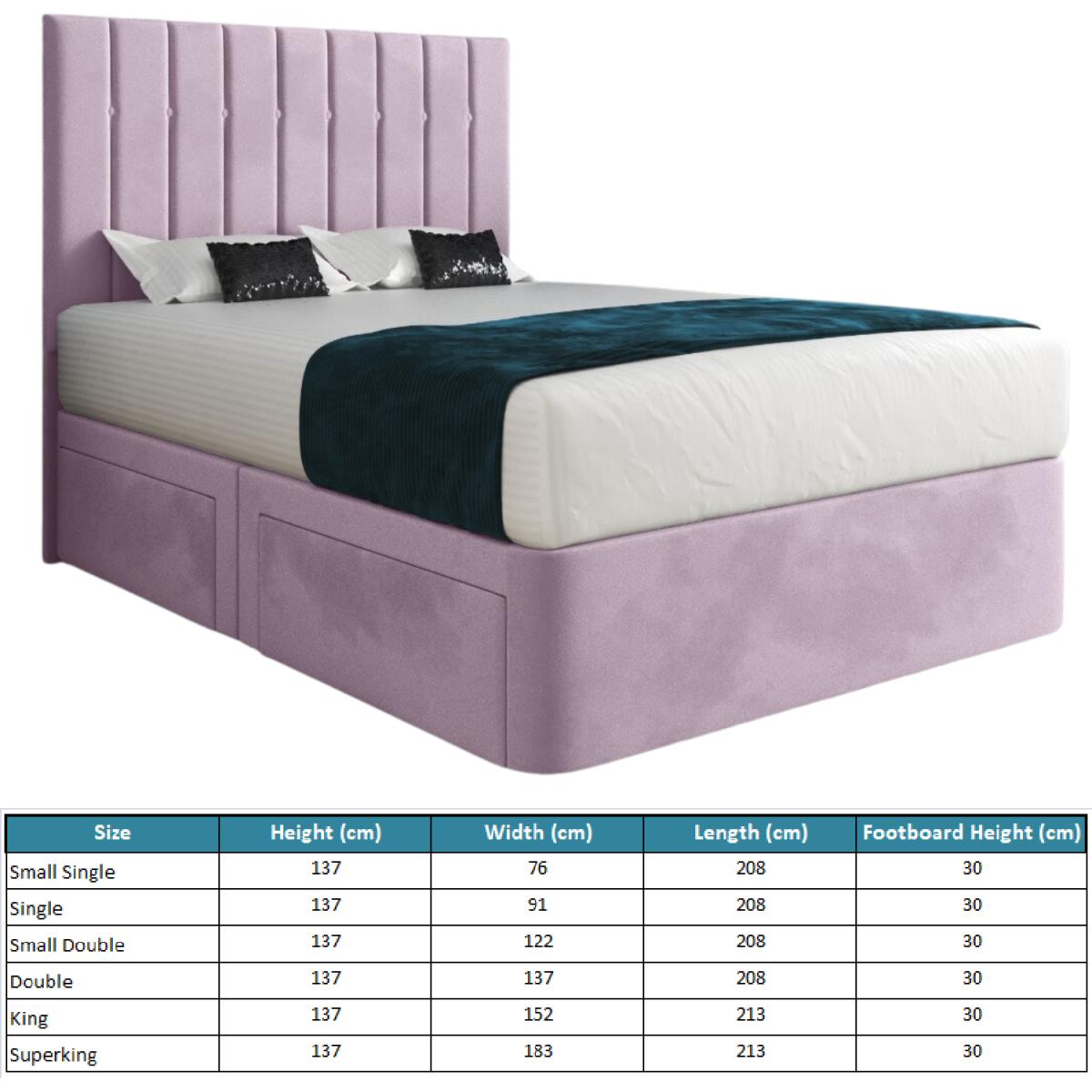 Linear modern design floorstanding headboard with a classic divan base. Divan base comes equipped with chrome gliders and optional drawer configurations can be chosen for added storage solution. The floorstanding headboard is solid and easy to affix to the base. Aesthetically clean and sleak with a contemporary line design.