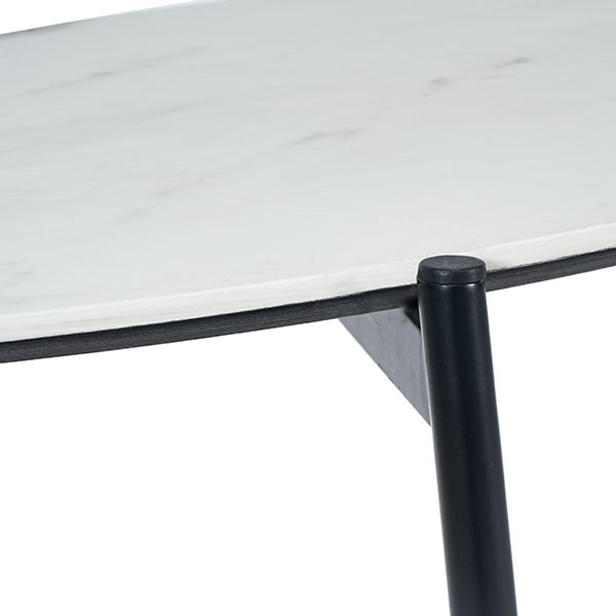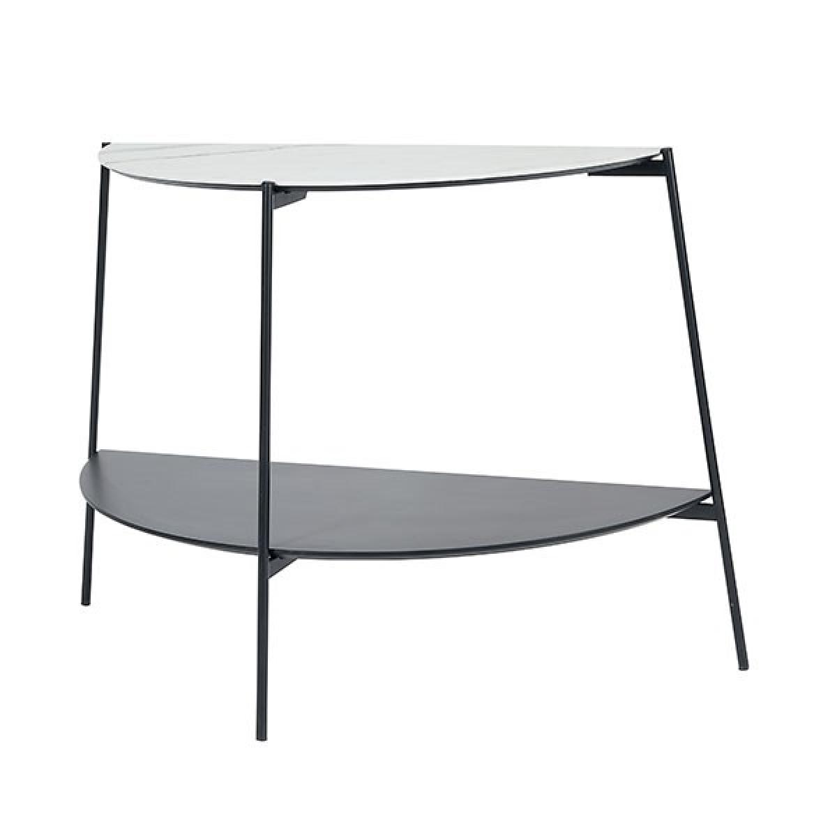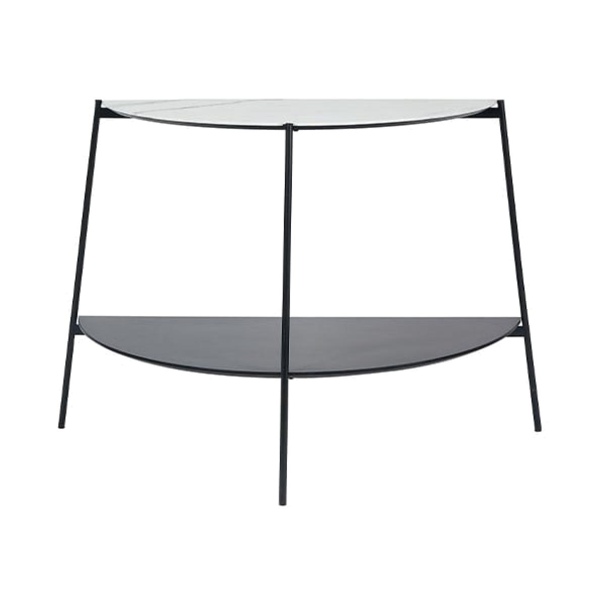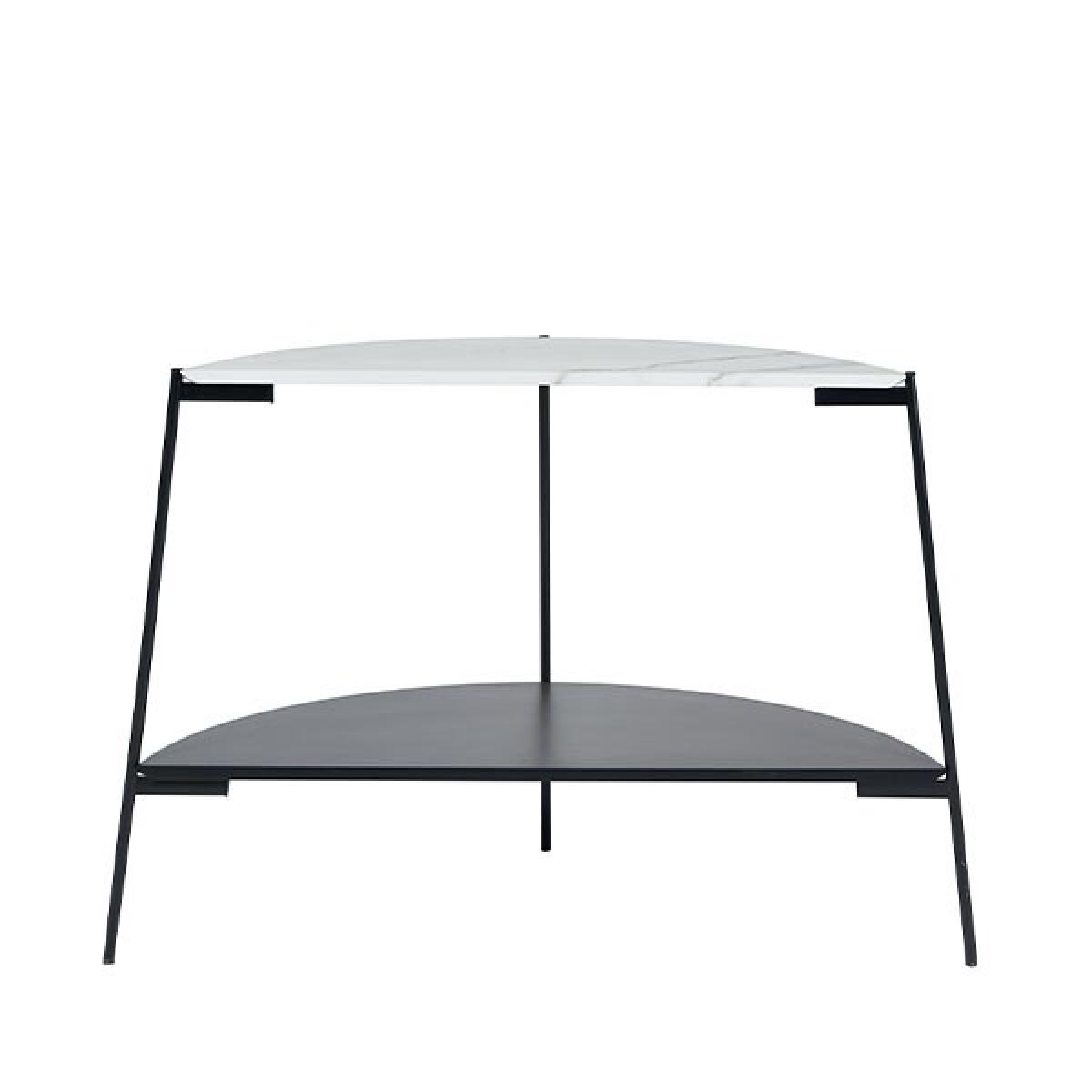 Modern white marble and black metal console table. The Marchello collection features modern furniture pieces that boast a sleek black metal finish and white marble effect veneer. The perfect pieces to complement any interior..