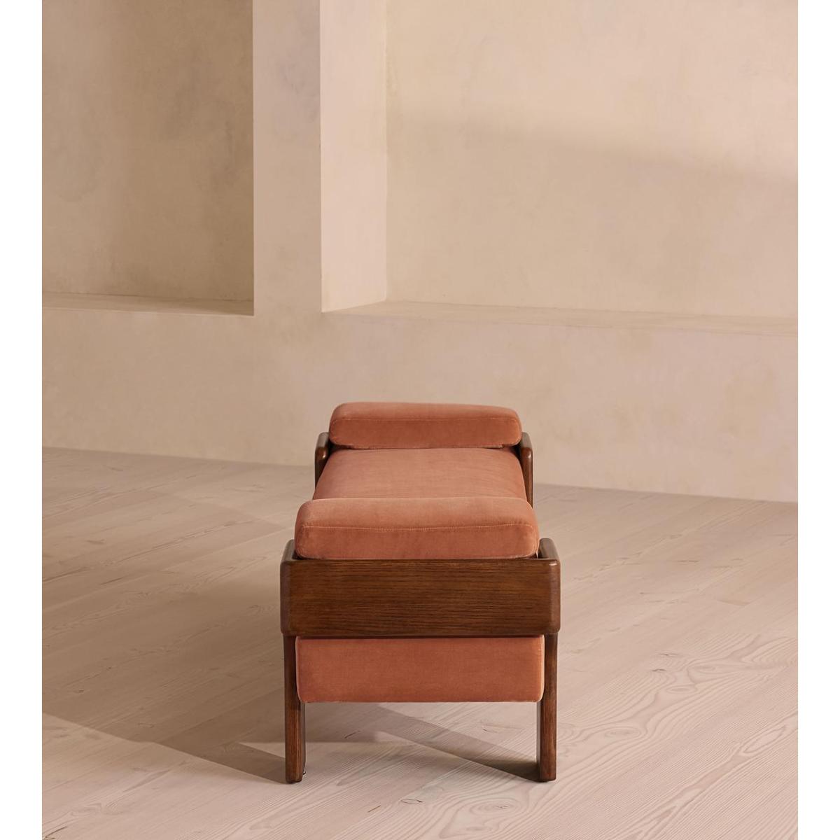 The relaxed silhouette is finished with feather-wrapped cushions upholstered in velvet. Designed as part of our Marcia collection, this bench similarly echoes the relaxed social setting of Shoreditch House. Secured by a solid oak framing at either side, its silhouette is fitted with a feather-wrapped seat cushion and two bolster cushions fully upholstered in velvet in our made-to-order palette.