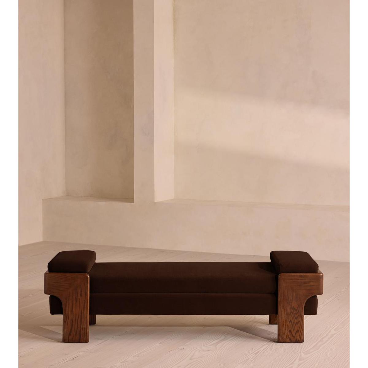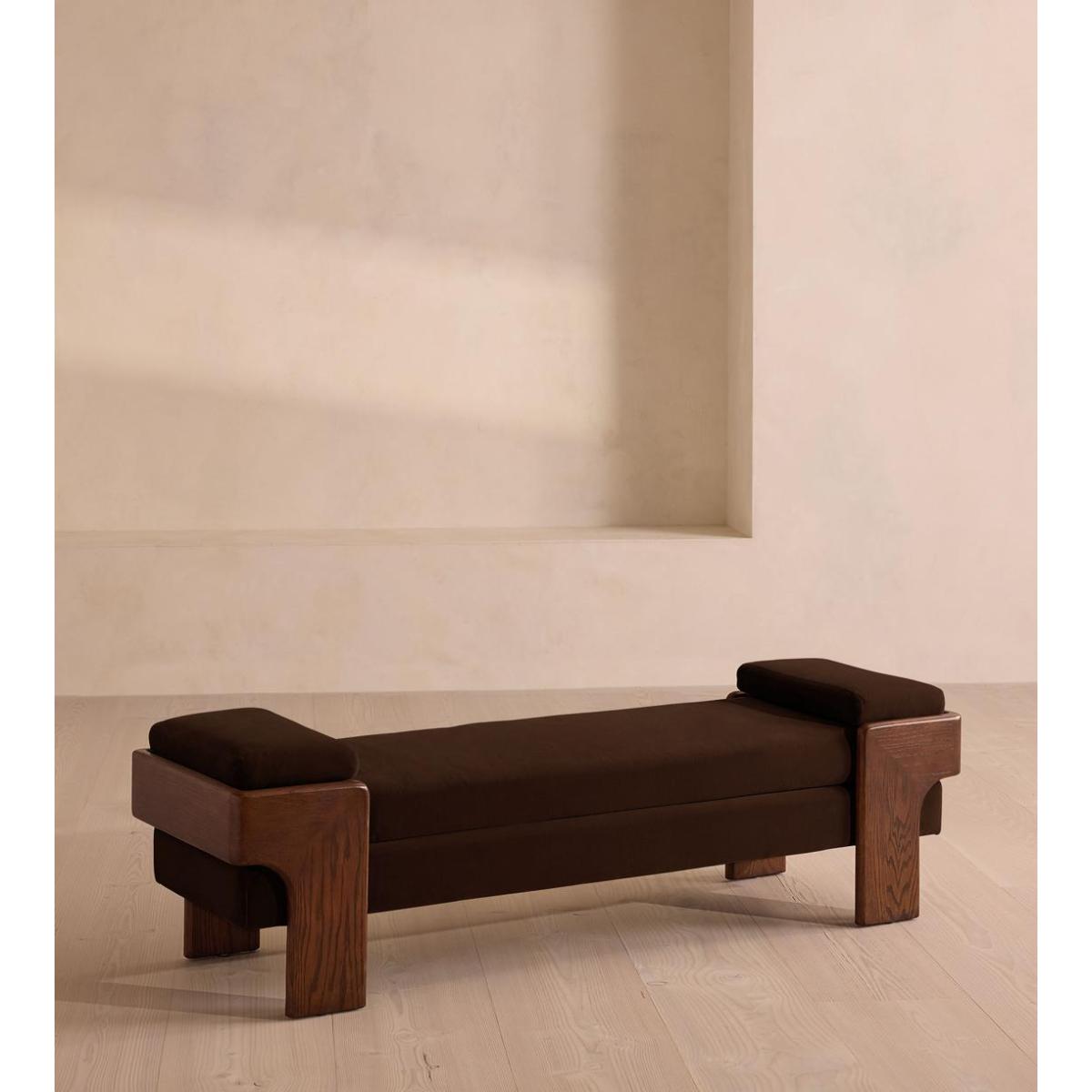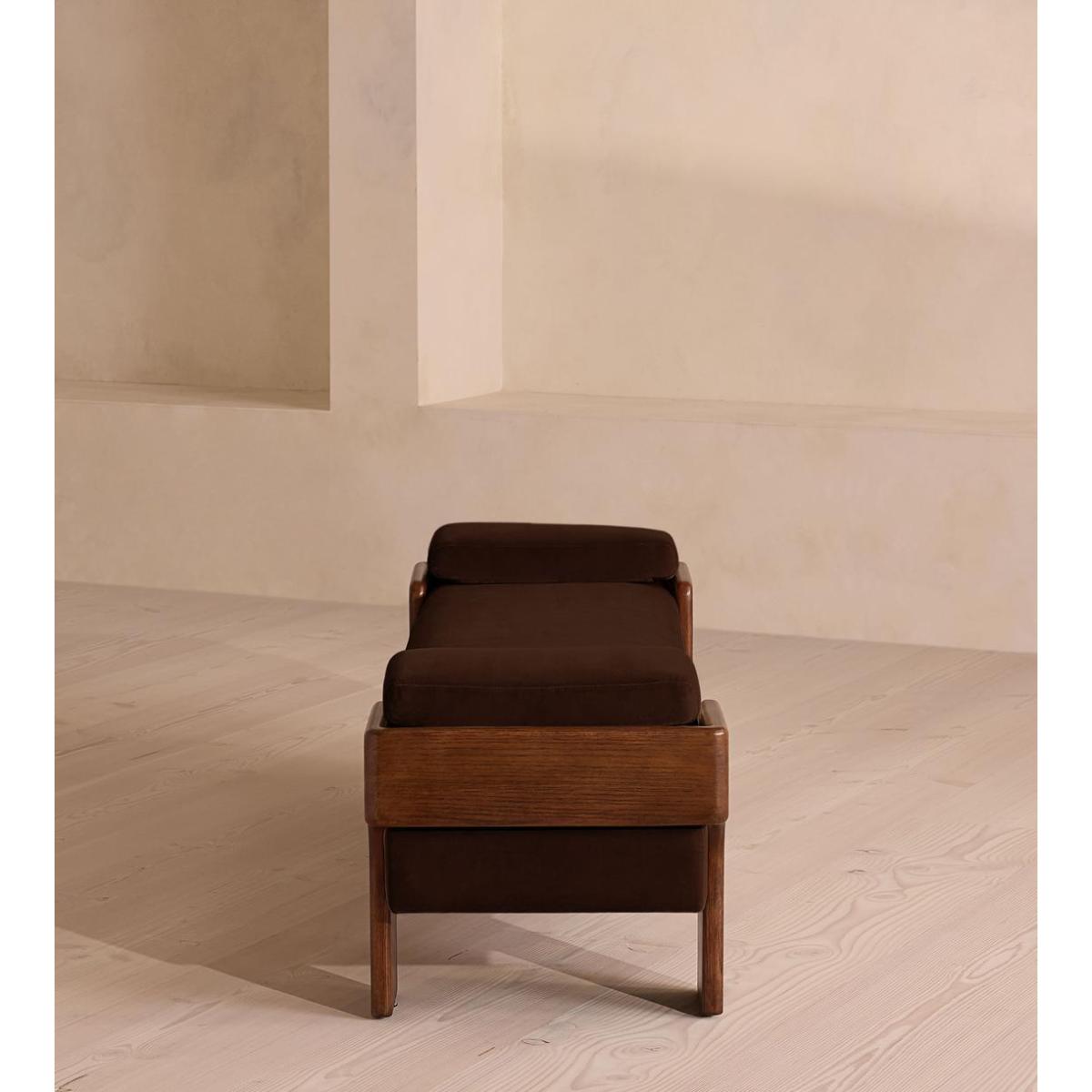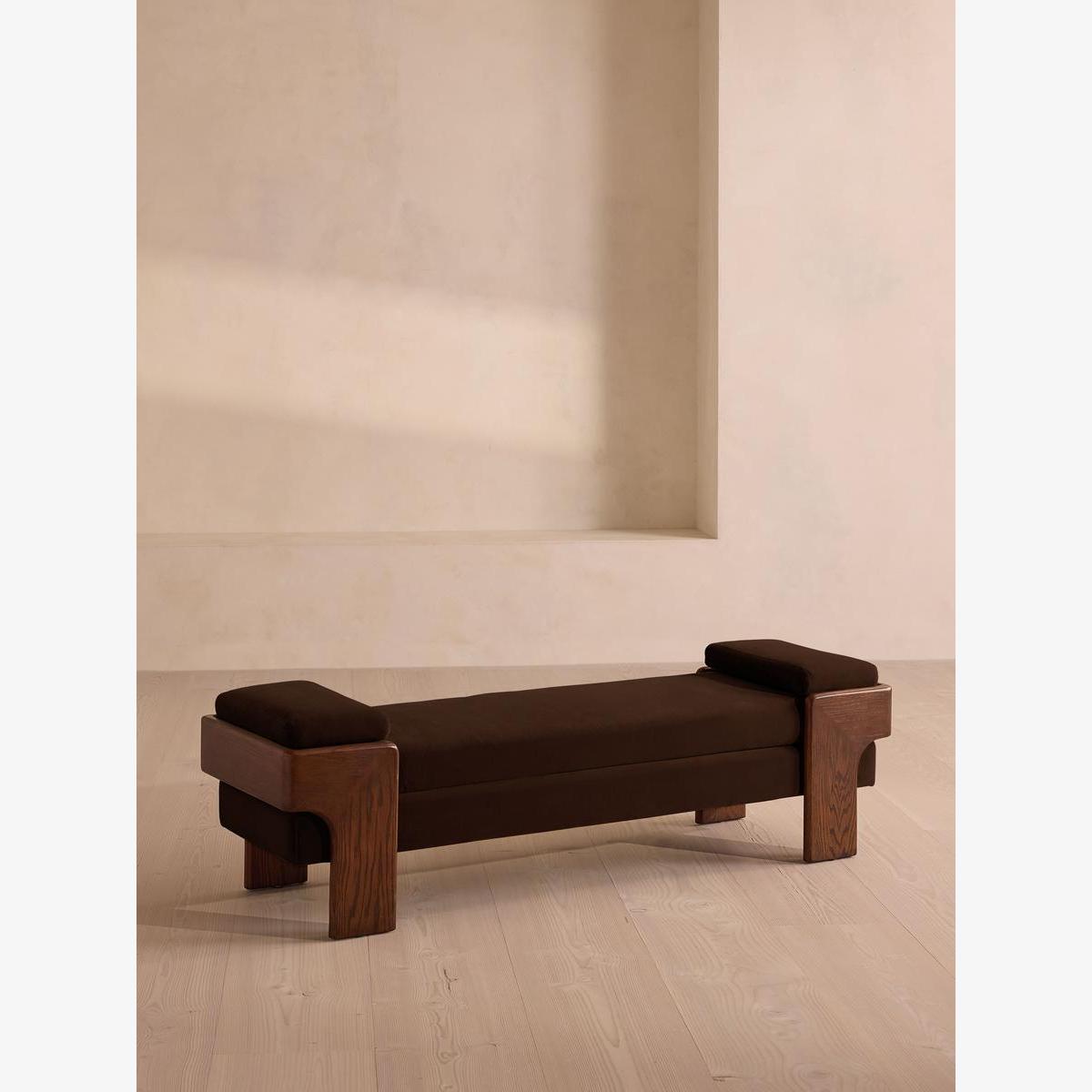 The relaxed silhouette is finished with feather-wrapped cushions upholstered in velvet. Designed as part of our Marcia collection, this bench similarly echoes the relaxed social setting of Shoreditch House. Secured by a solid oak framing at either side, its silhouette is fitted with a feather-wrapped seat cushion and two bolster cushions fully upholstered in velvet in our made-to-order palette.