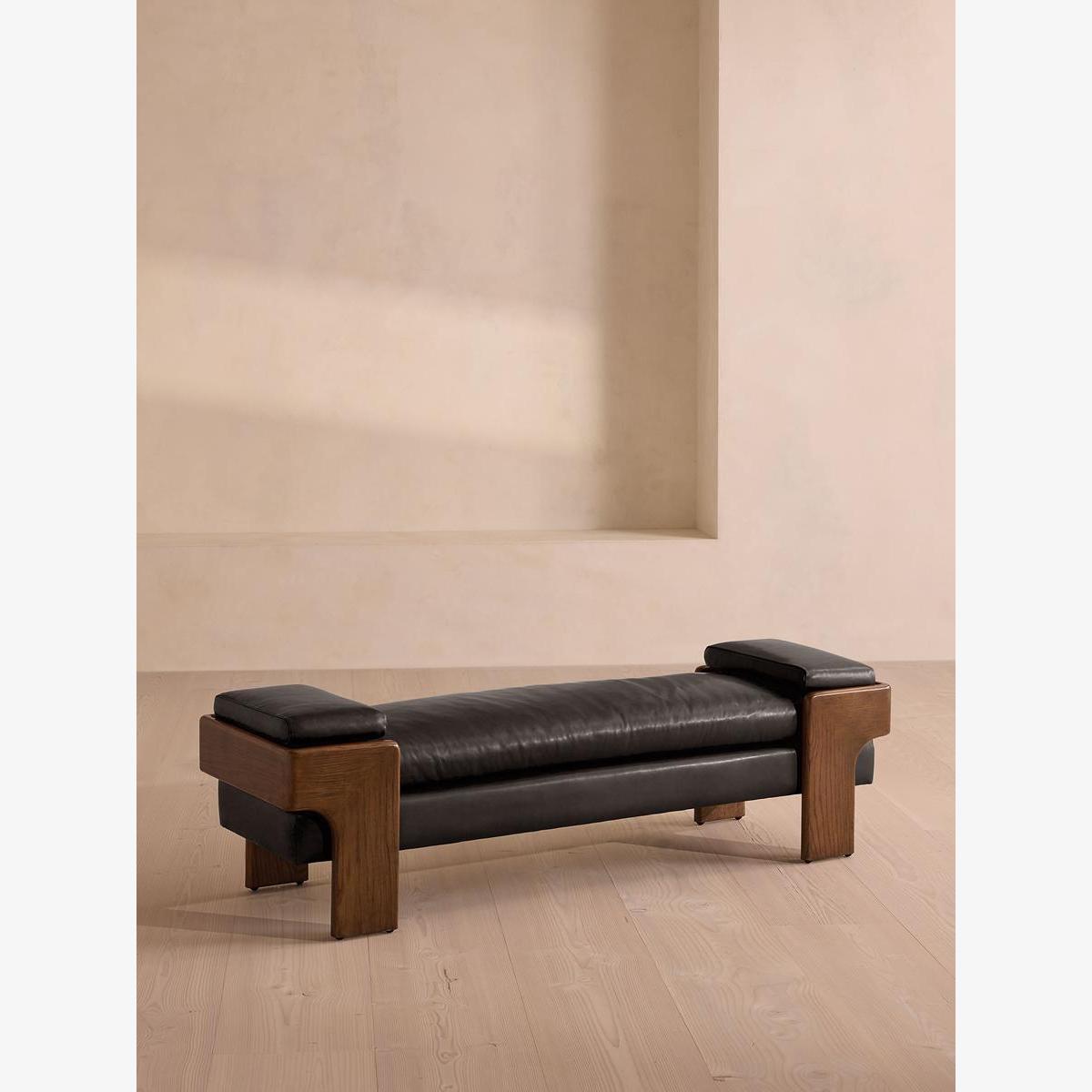 The relaxed silhouette is finished with feather-wrapped cushions upholstered in leather. Designed as part of our Marcia collection, this bench similarly echoes the relaxed social setting of Shoreditch House. Secured by a solid oak framing at either side, its silhouette is fitted with a feather-wrapped seat cushion and two bolster cushions fully upholstered in leather in a choice of made-to-order shades.