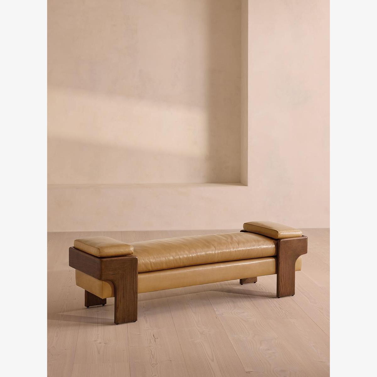 The relaxed silhouette is finished with feather-wrapped cushions upholstered in leather. Designed as part of our Marcia collection, this bench similarly echoes the relaxed social setting of Shoreditch House. Secured by a solid oak framing at either side, its silhouette is fitted with a feather-wrapped seat cushion and two bolster cushions fully upholstered in leather in a choice of made-to-order shades.