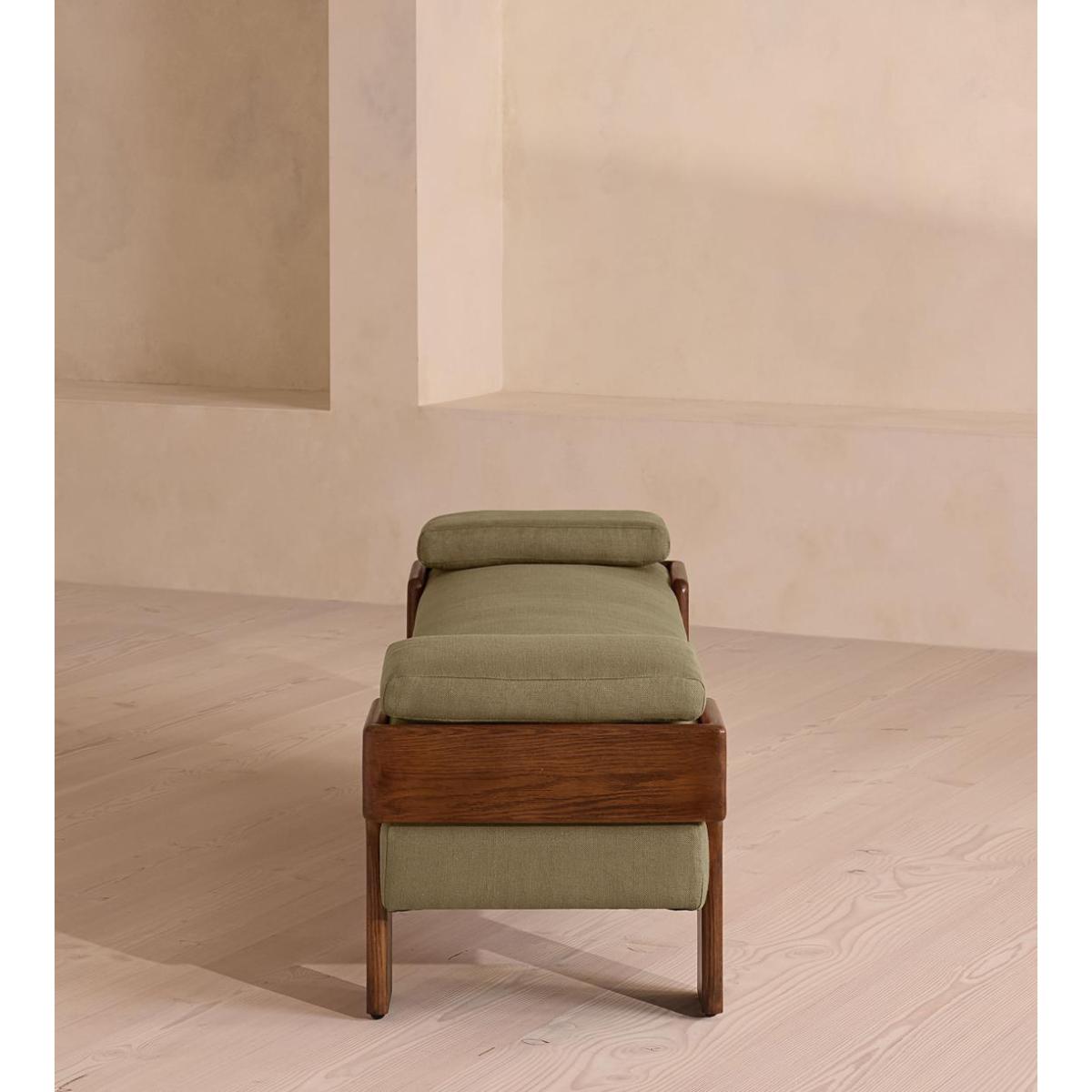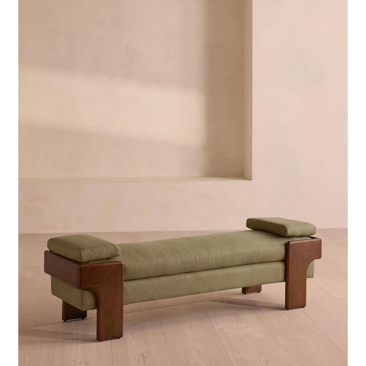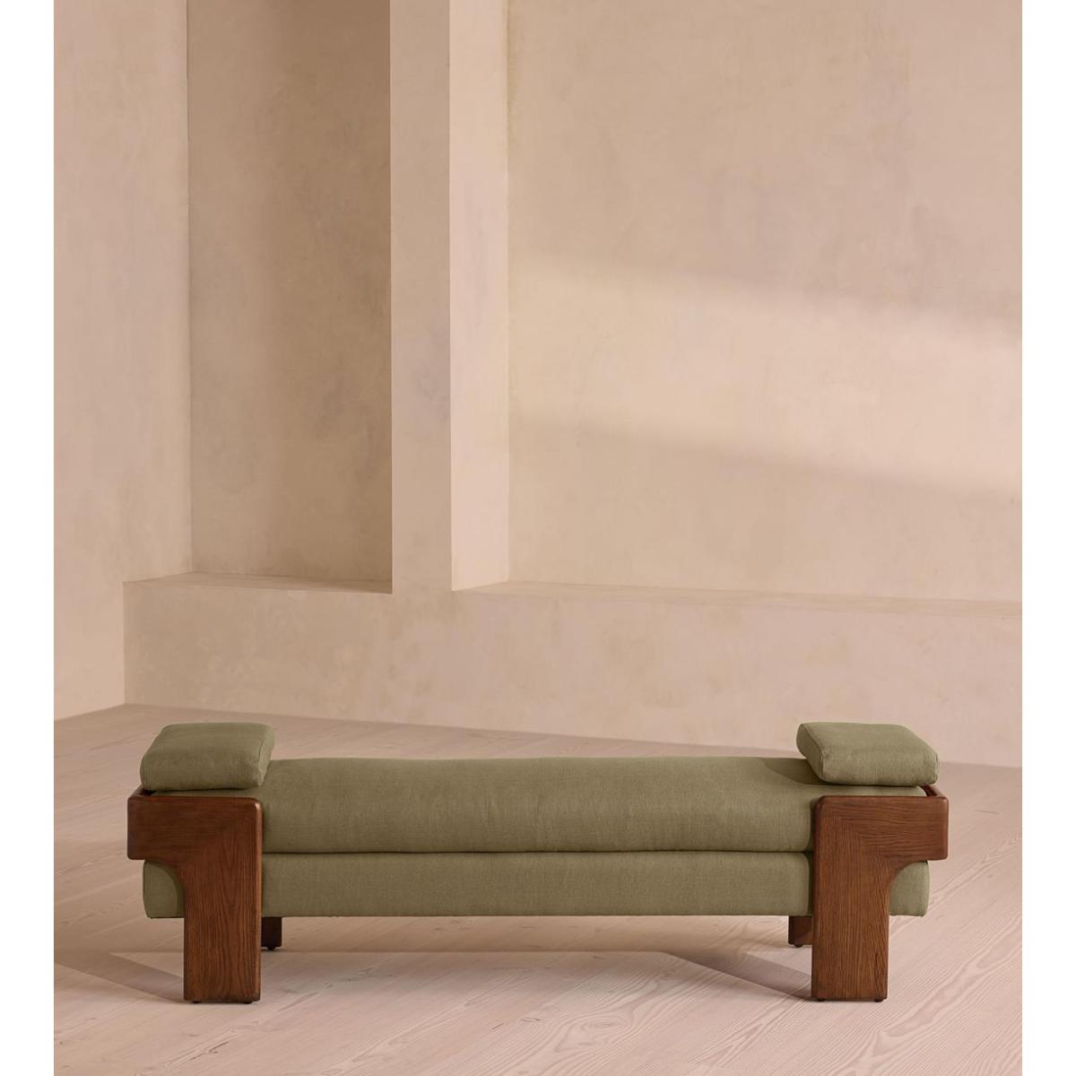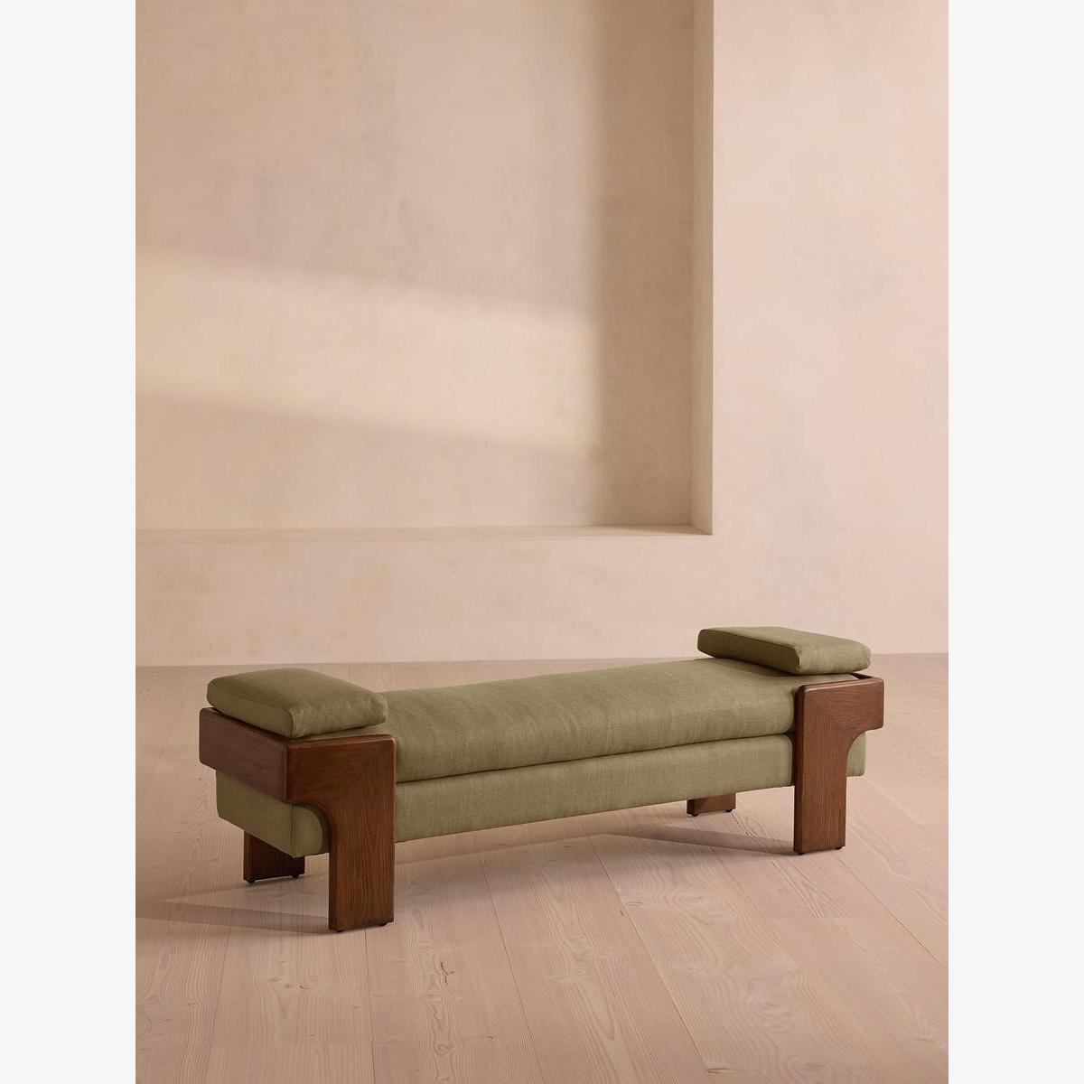 I really like this bench because of its clean, understated look and the versatile linen fabric in sage, which adds a soft, natural tone to any space. It works particularly well in both contemporary and traditional interiors-think entryways, under large windows, or even at the foot of a bed. For styling, consider pairing it with cosy throws or cushions to create a welcoming, relaxed vibe. It's also practical as it can serve as extra seating or a handy spot to rest your feet, making it a functional addition to the living or hallway areas. The wooden base brings warmth to a neutral palette and provides a sturdy, durable foundation, so it’s both stylish and practical in everyday use.