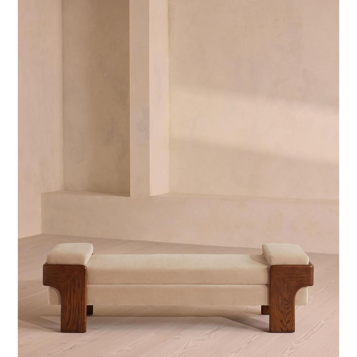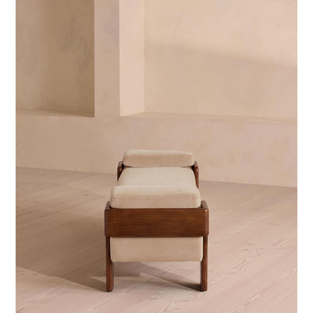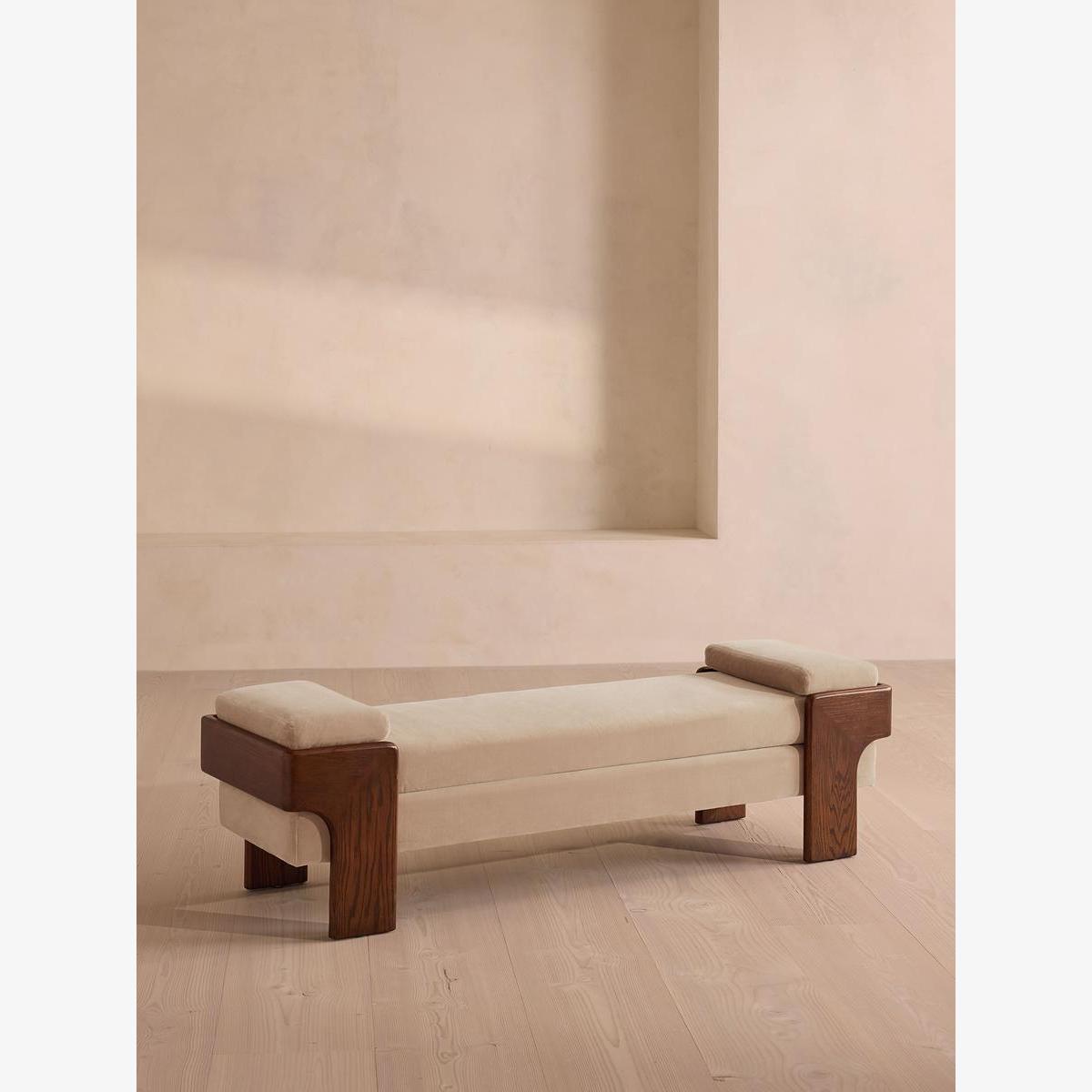 The relaxed silhouette is finished with feather-wrapped cushions upholstered in velvet. Designed as part of our Marcia collection, this bench similarly echoes the relaxed social setting of Shoreditch House. Secured by a solid oak framing at either side, its silhouette is fitted with a feather-wrapped seat cushion and two bolster cushions fully upholstered in velvet in our made-to-order palette.